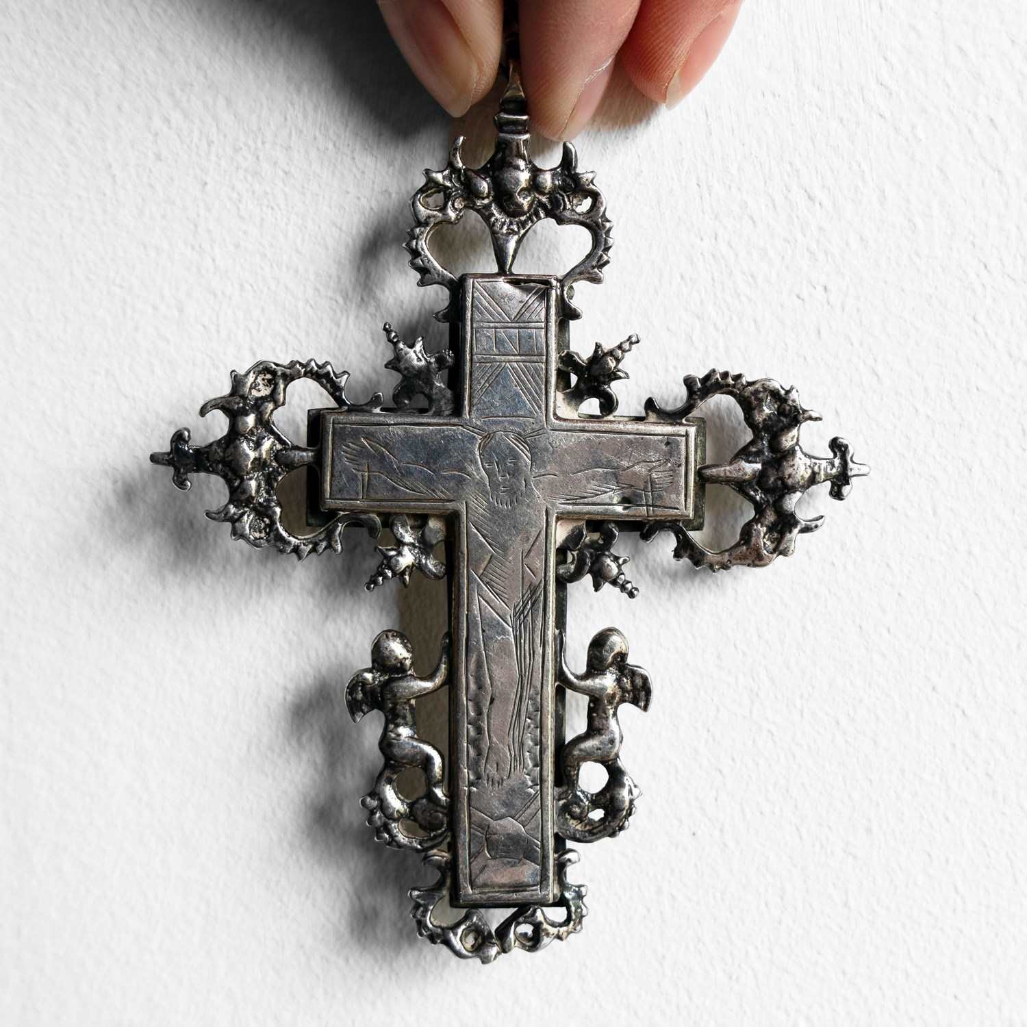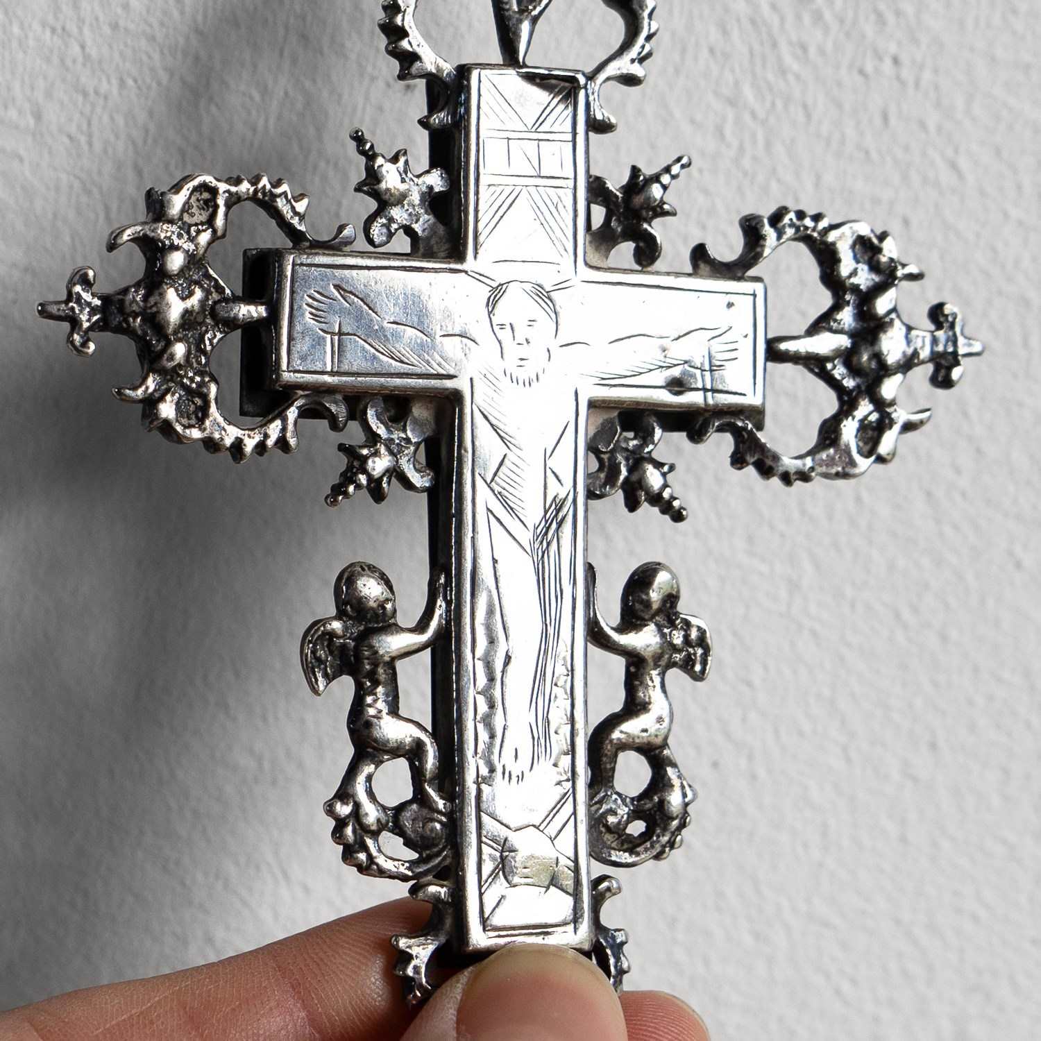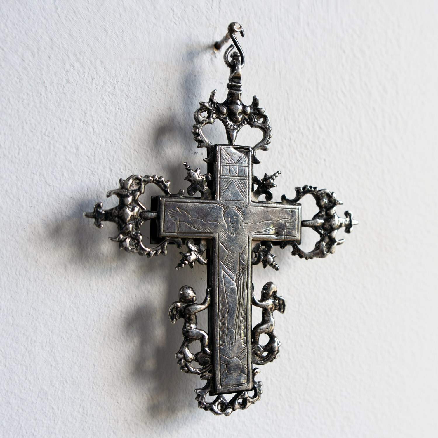 The central cross is surrounded by decorative silver embellishments in the form of catholic symbols, including winged angels/cherubs and what appear to be sacred hearts with daggers, etc., surrounded by thorns.