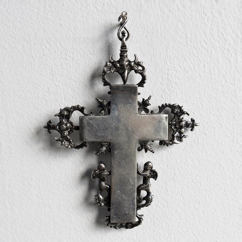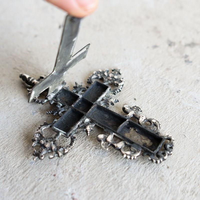 On the reverse there is. a plain silver crucifix back with a hinge that can be lifted to reveal six small compartments which would have originally been used to store holy relics related to the saints or possibly pieces believed to be of the true holy cross.