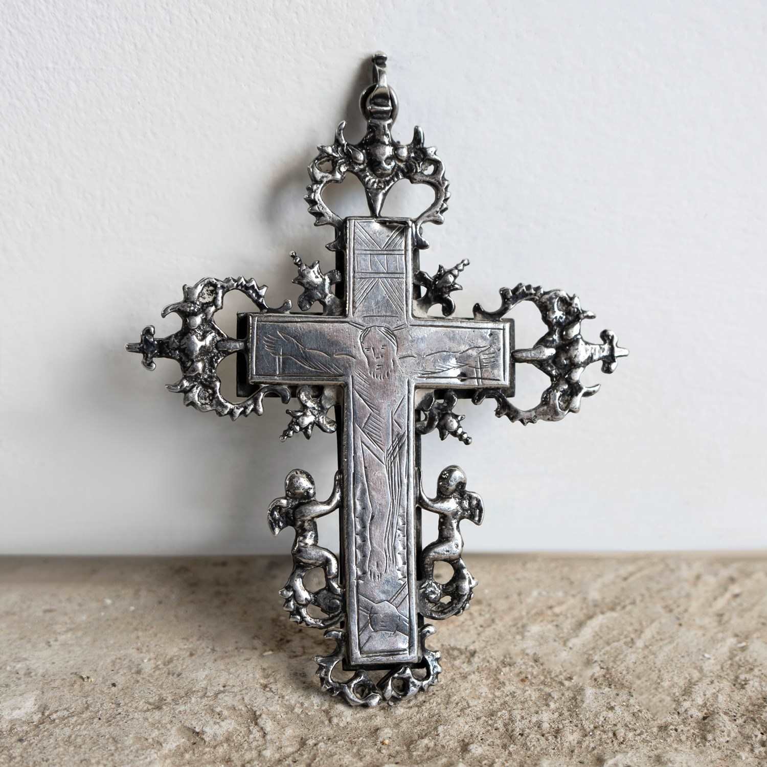 A striking and decorative antique silver crucifix / latin cross made from continental silver with a central crucifix engraved with a fairly naive depiction of Christ.