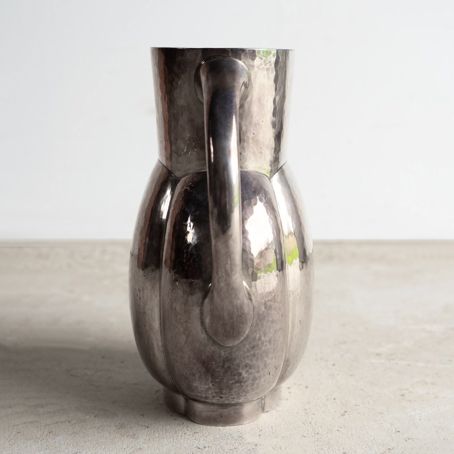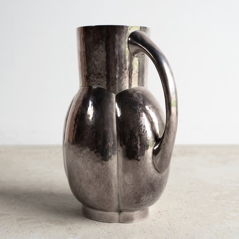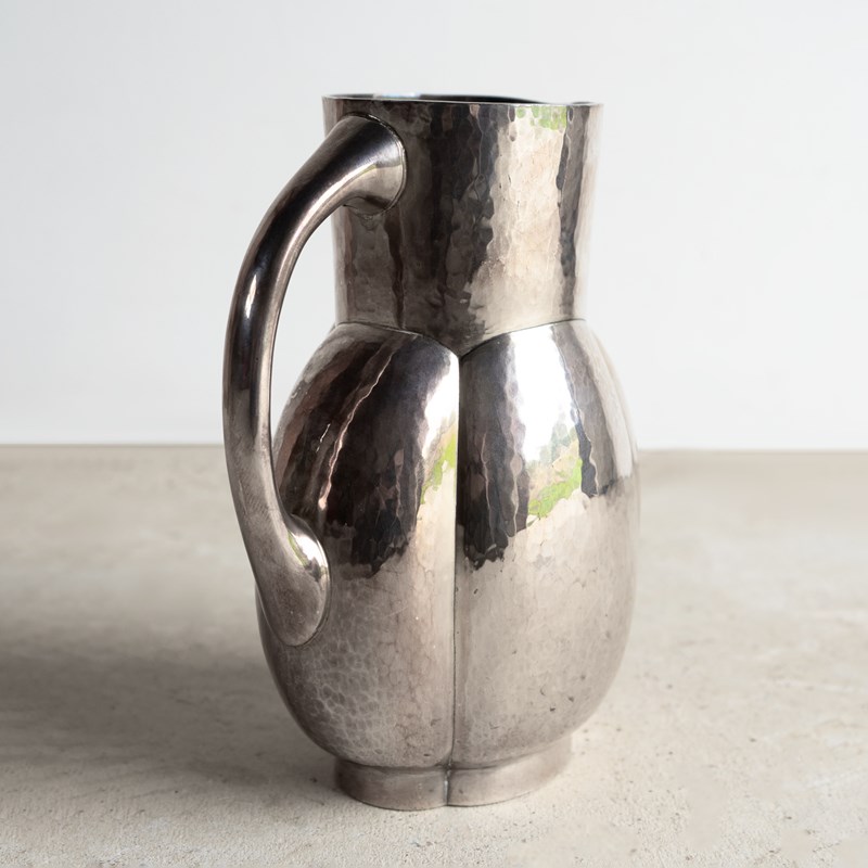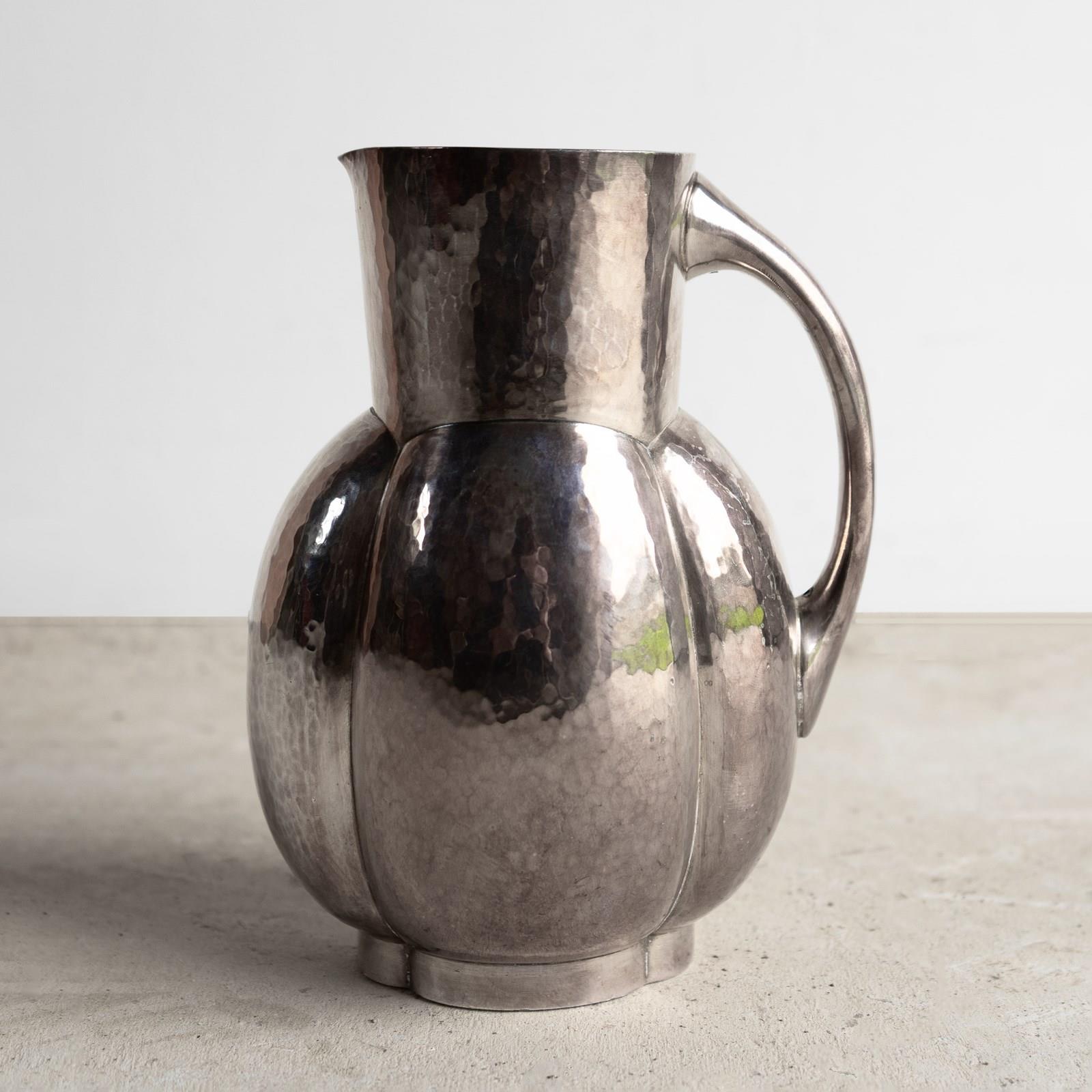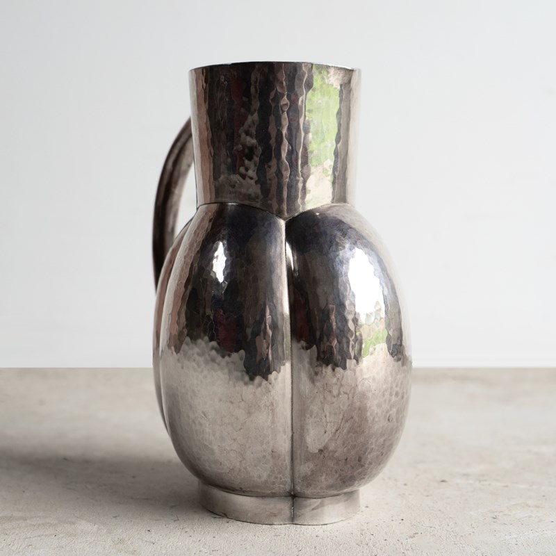 Known as the melone jug, a stylish, naturalistic form that was available in either plain or hammered finish metal. This is the hammered finish, and it really does emphasise the naturalistic form of the piece.