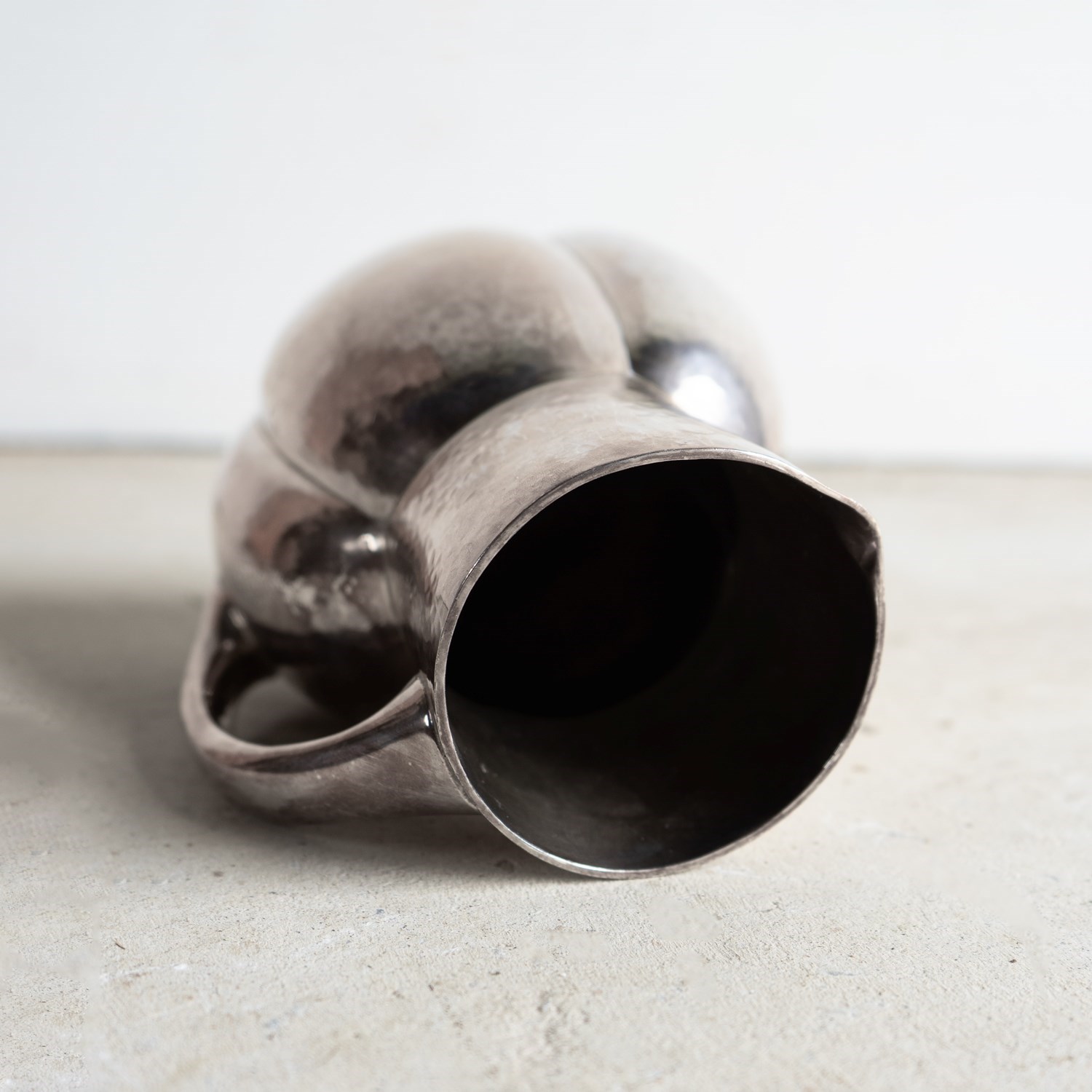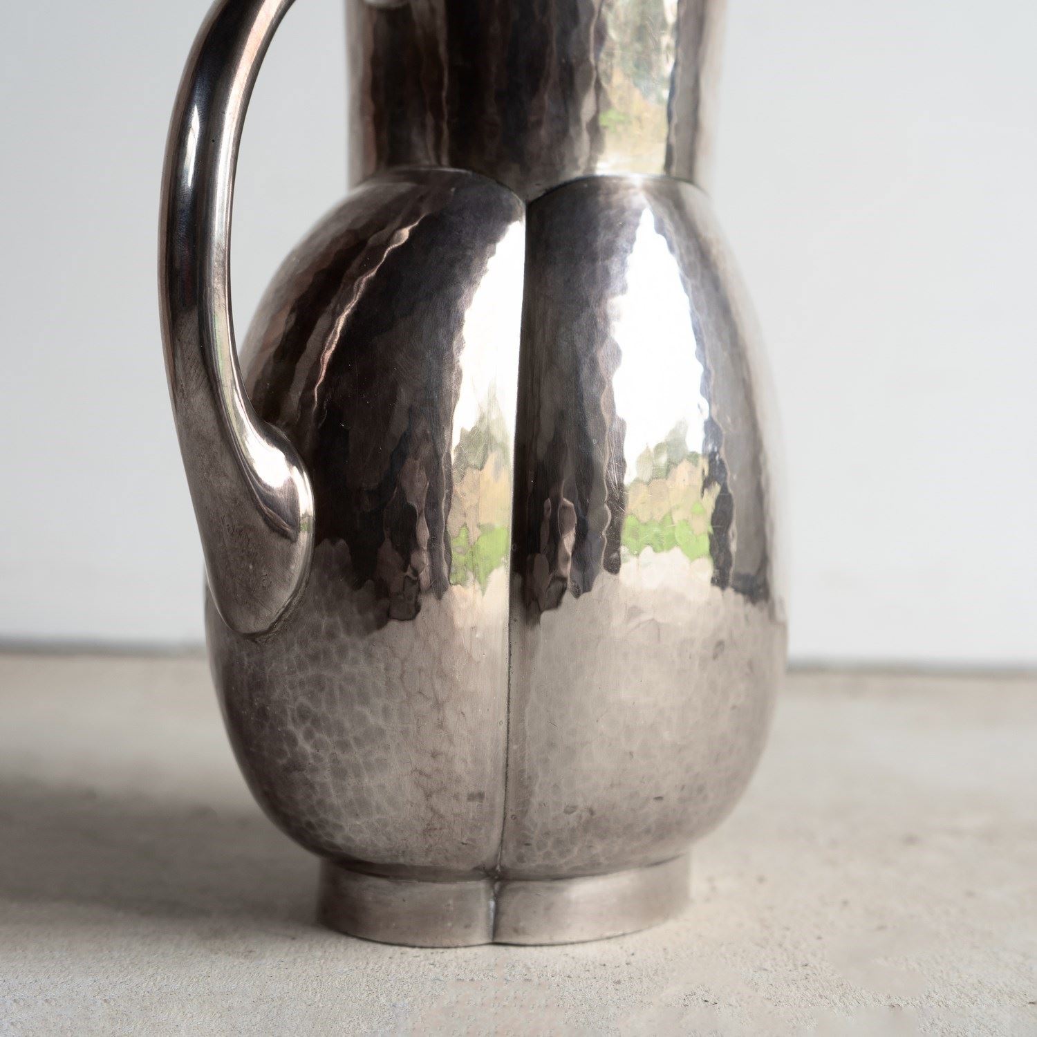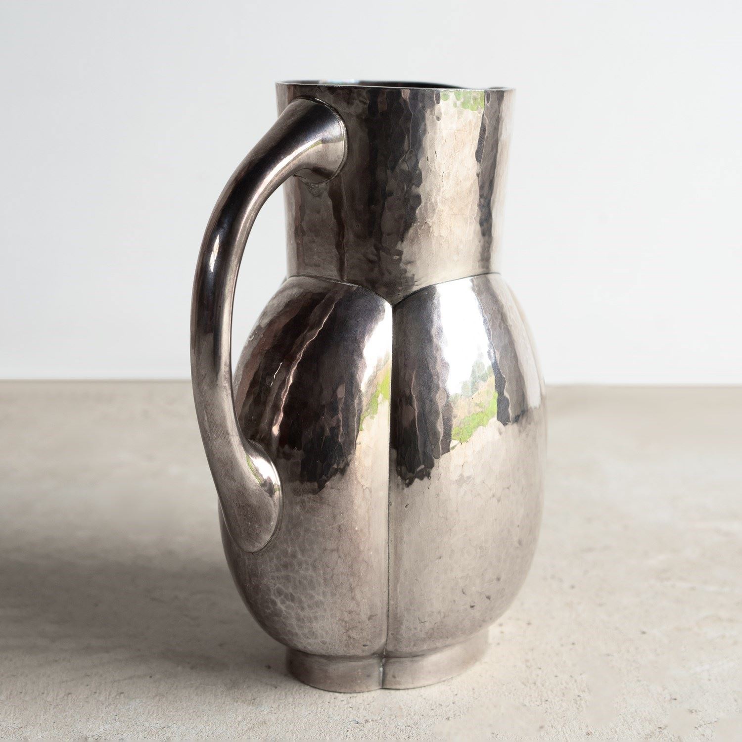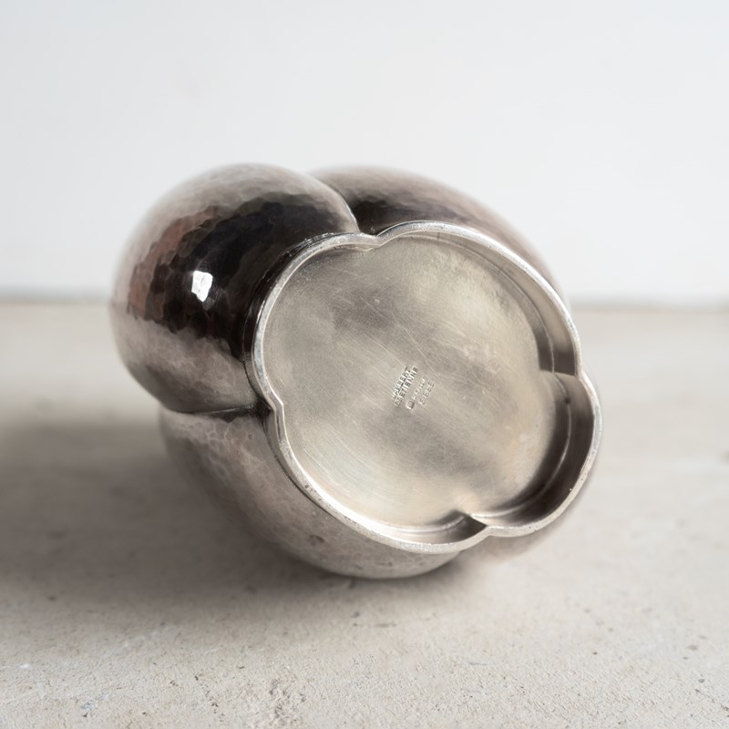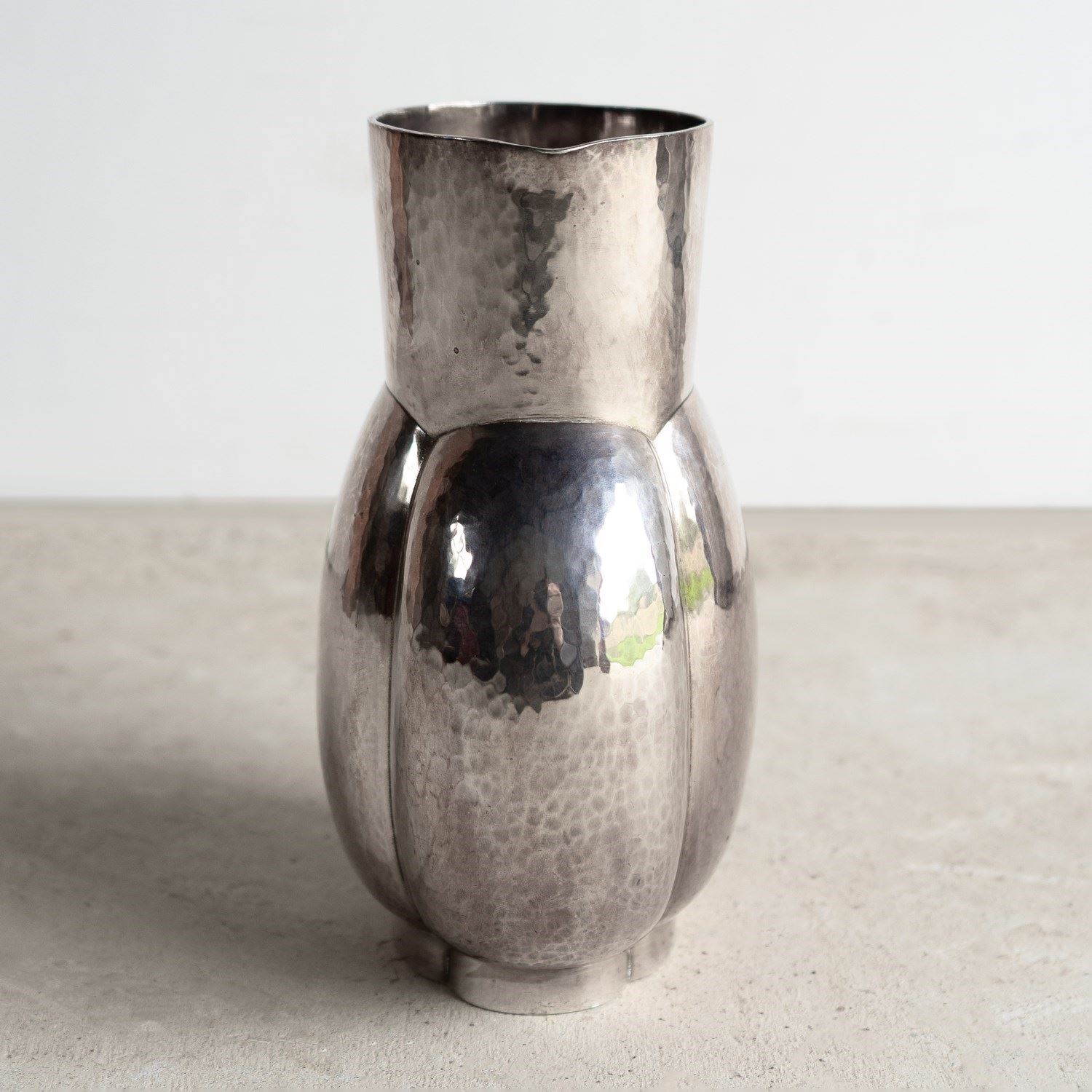 Known as the melone jug, a stylish, naturalistic form that was available in either plain or hammered finish metal. This is the hammered finish, and it really does emphasise the naturalistic form of the piece.
