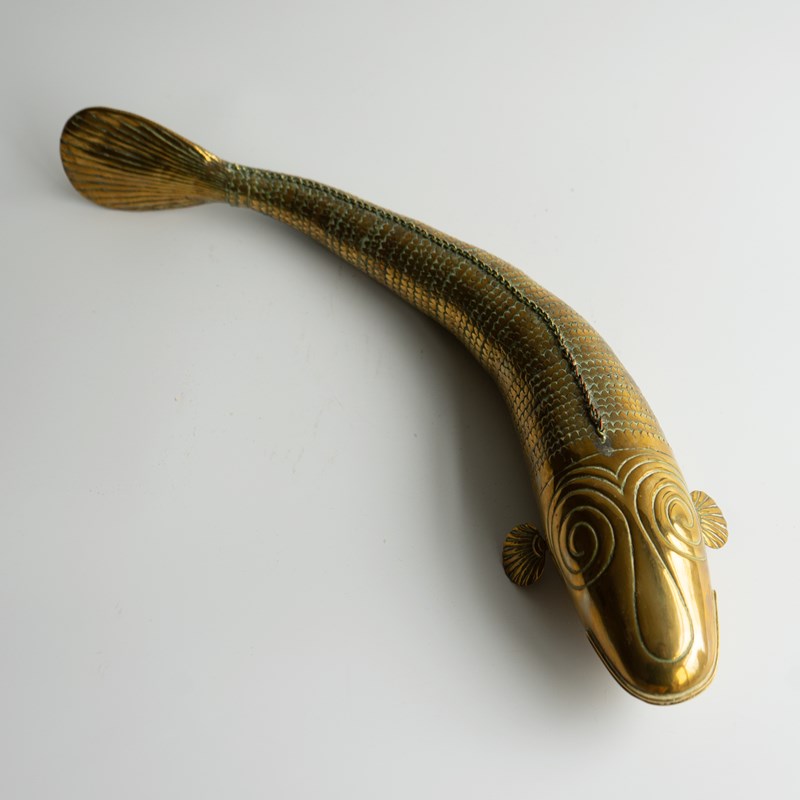 Depicting a stylised fish in a naive folky style, with great character. Cleverly made with articulated scaled sections that undulate from side to side to emulate a swimming fish.
