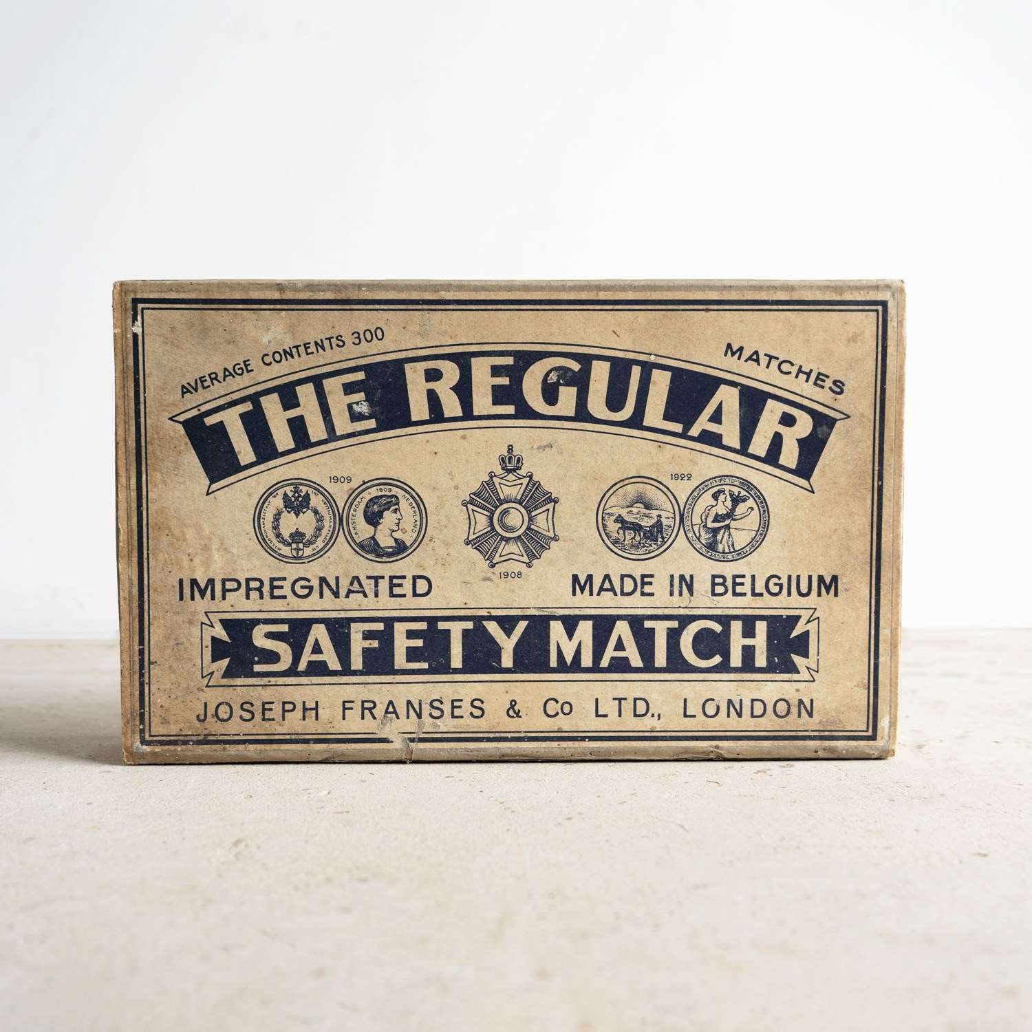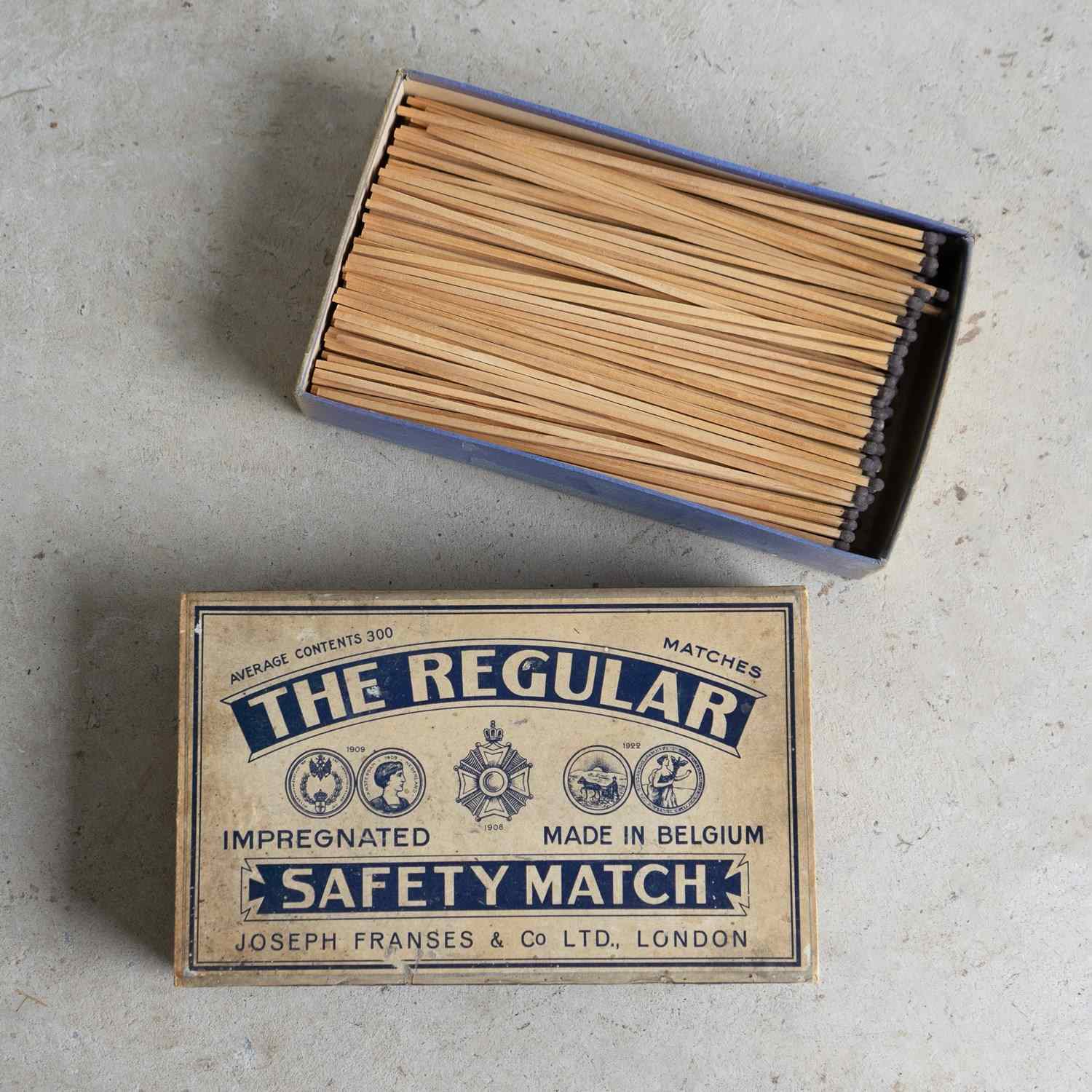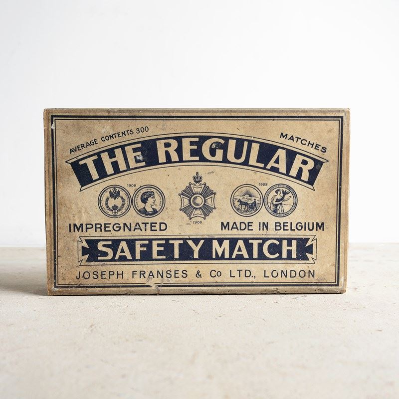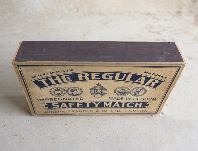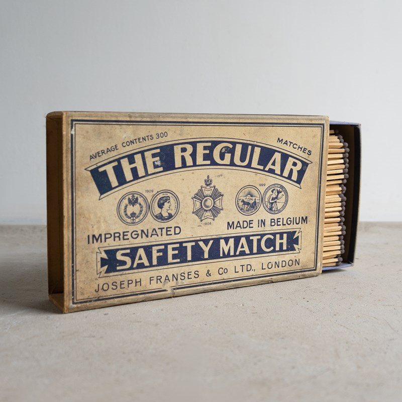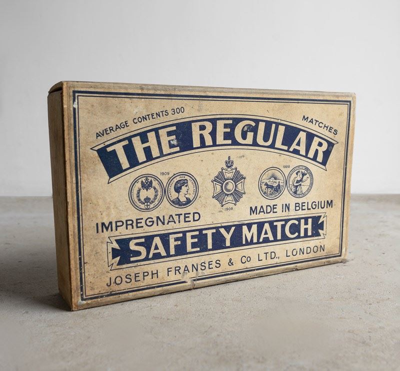 VINTAGE ADVERTISING FOR ‘THE REGULAR IMPREGNATED SAFETY MATCH, JOSEPH FRANSES & CO LTD., LONDON’.