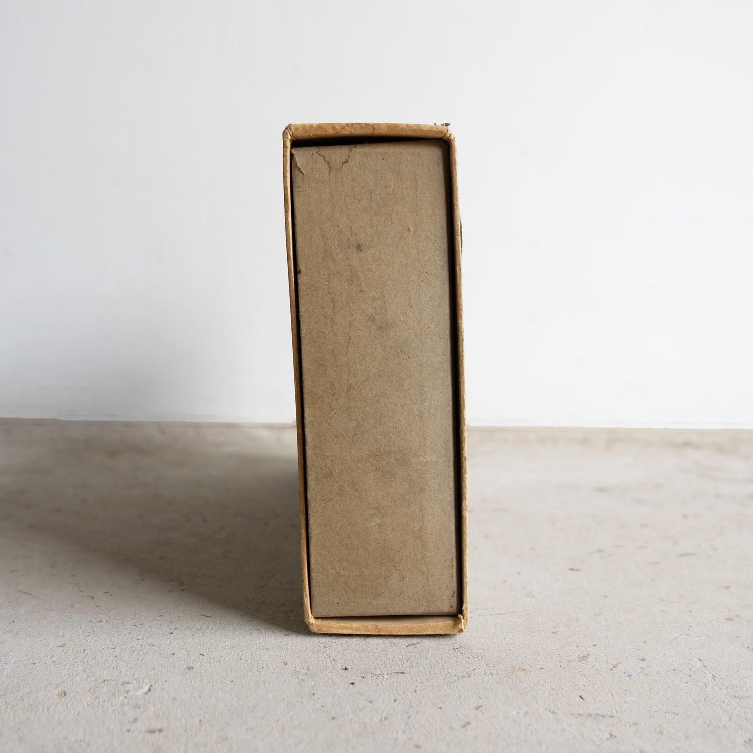 A scale replica of the usual small-sized box, using all the same materials, cardboard with paper labels and striking strips on each side. The matches are also scaled up using the same wood and tips.