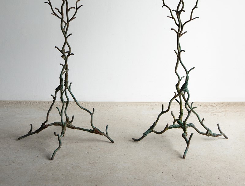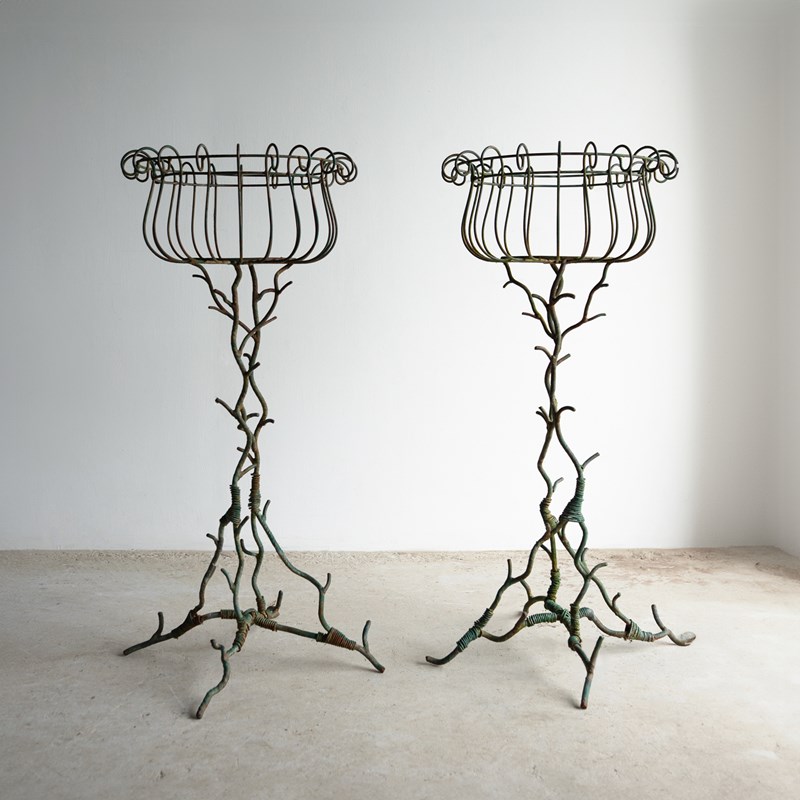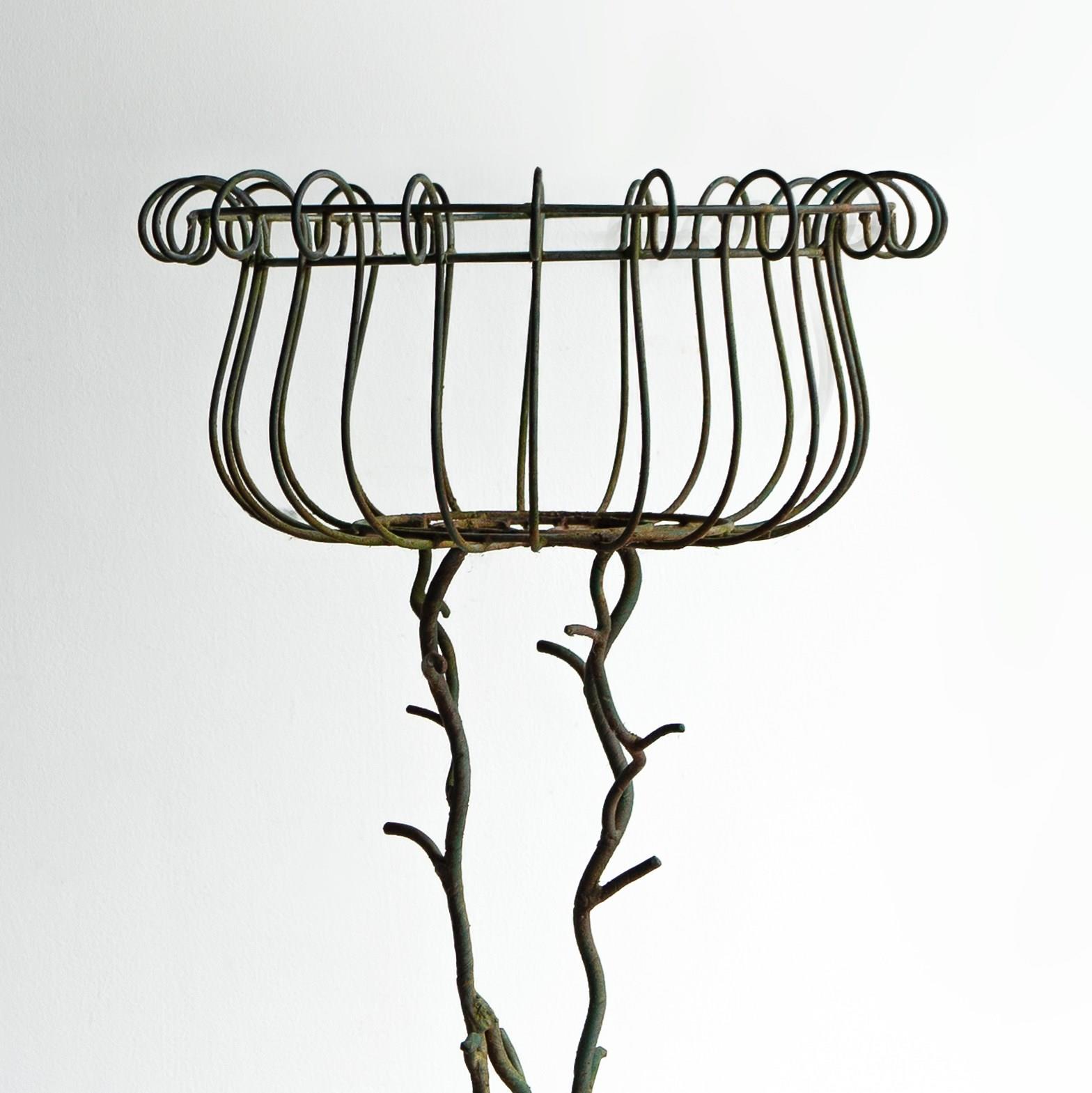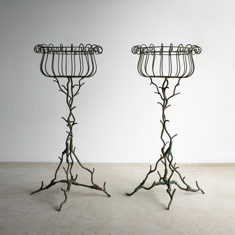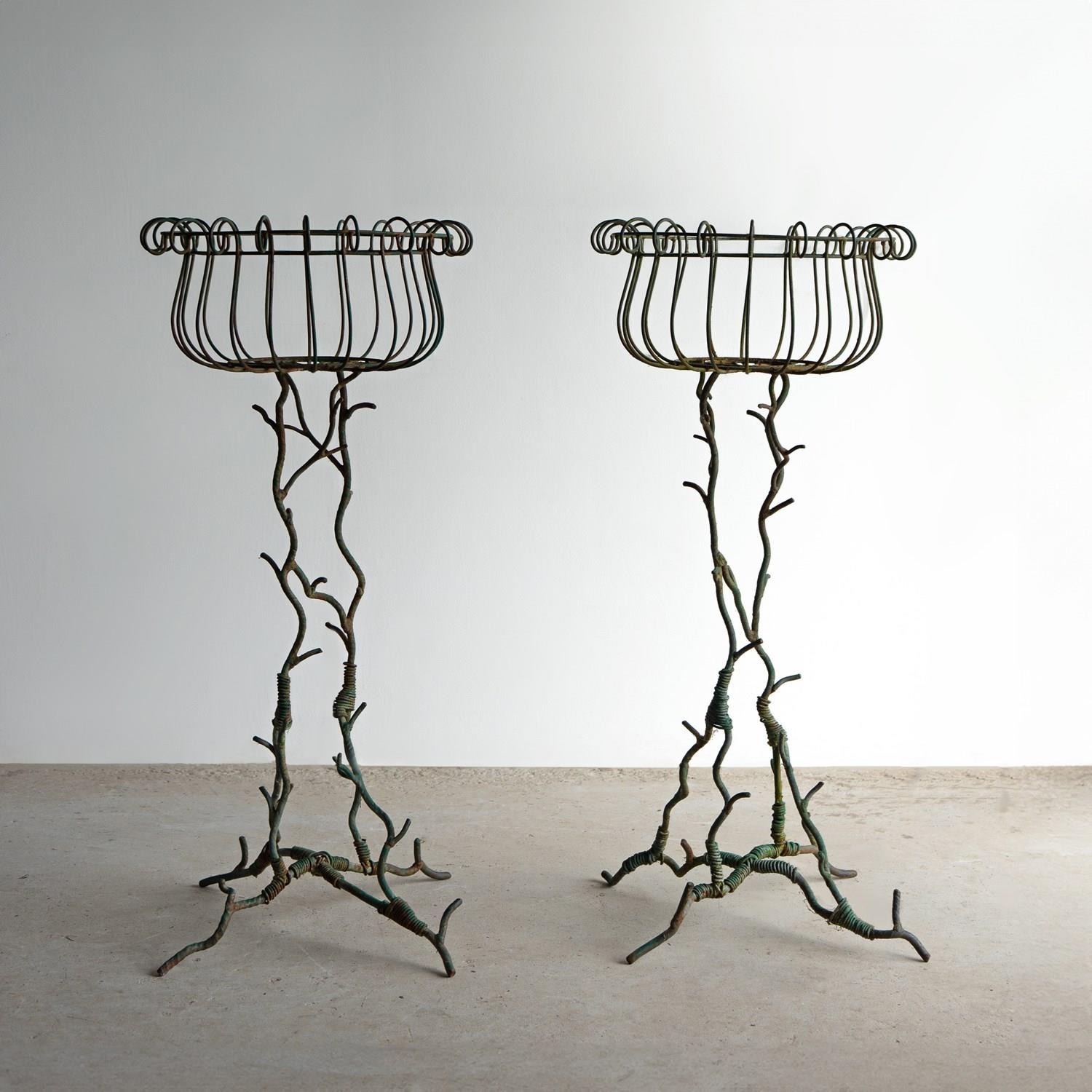 Pair of antique plant stands. Naturalistic wrought iron and wirework bases in the faux bois taste to emulate branches and twigs.
