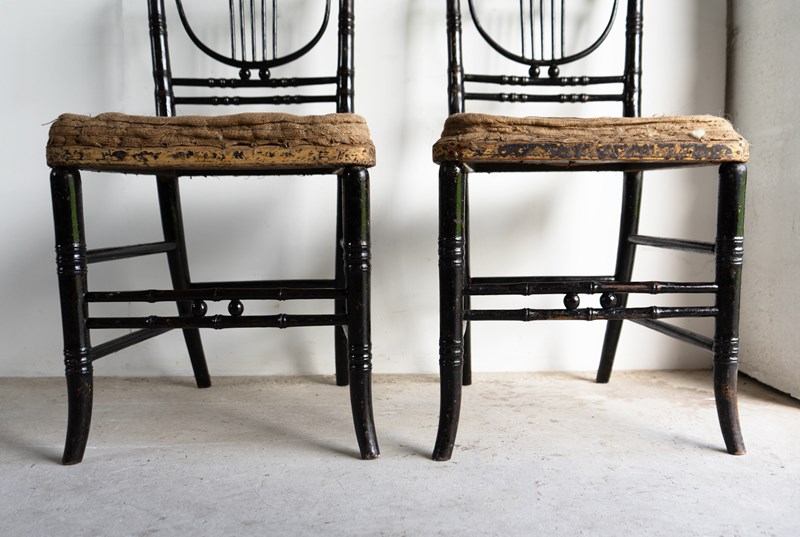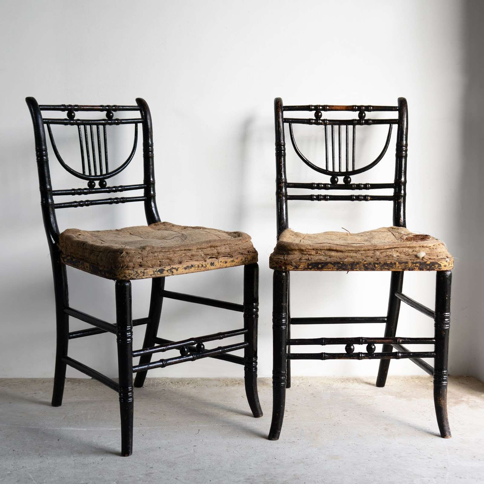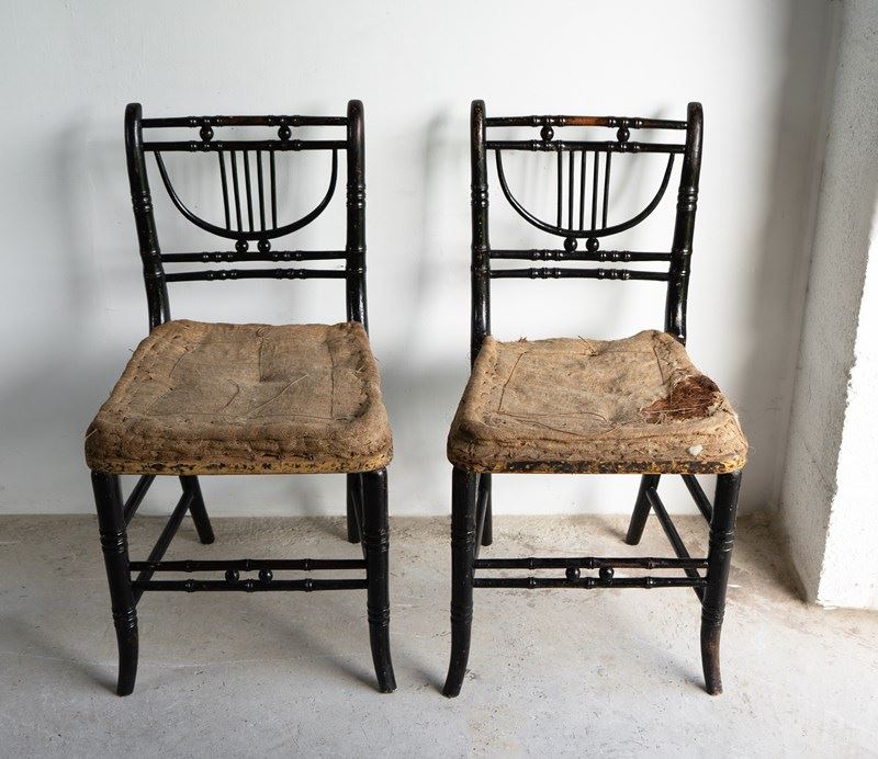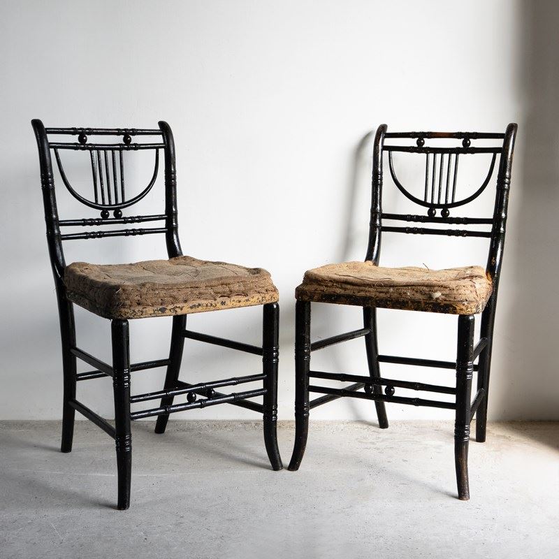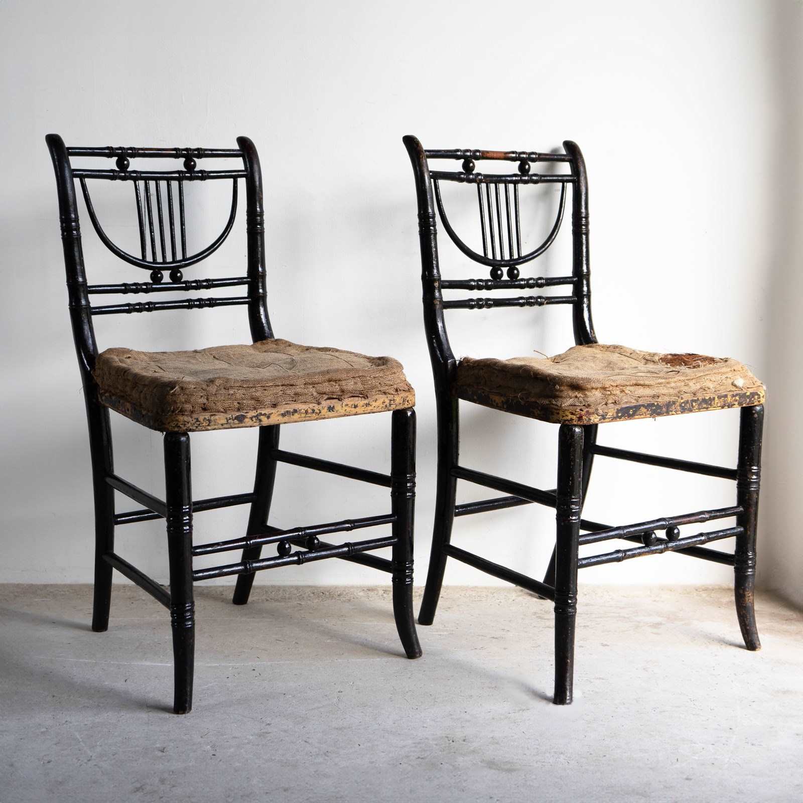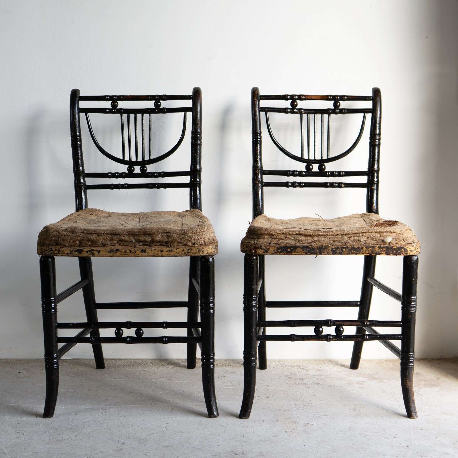 Pair Of Antique Regency Ebonised Faux Bamboo Chairs, Early 19Th Century