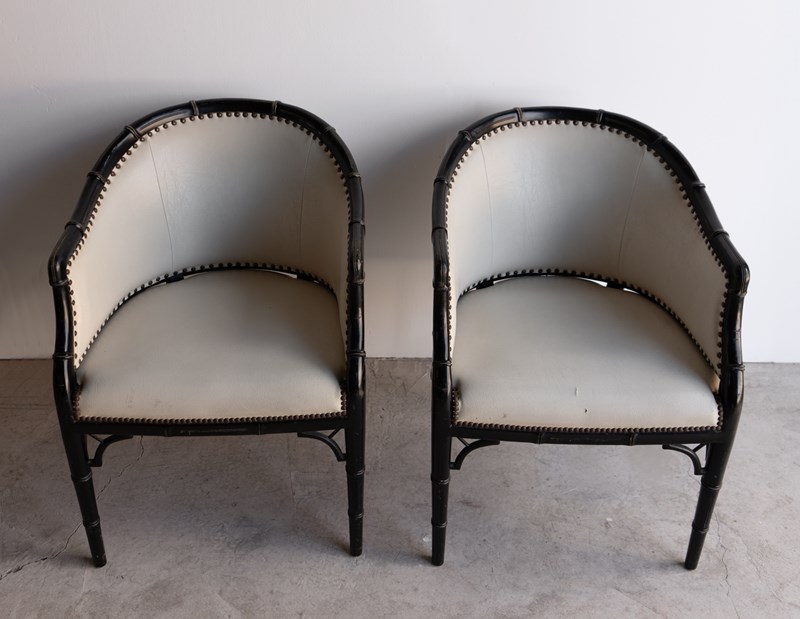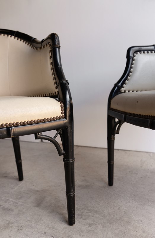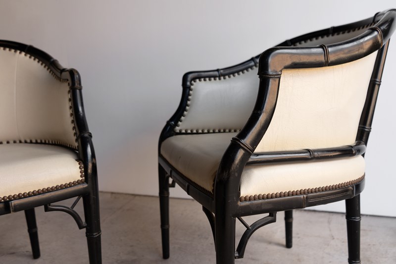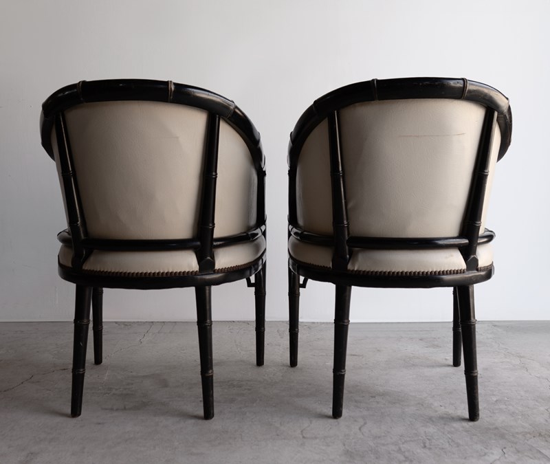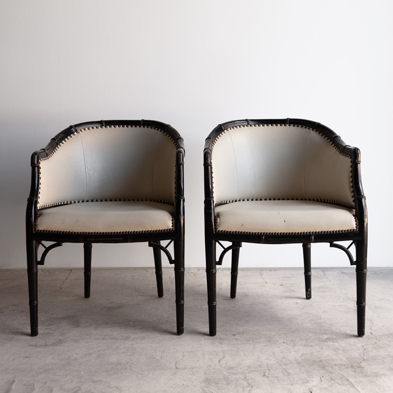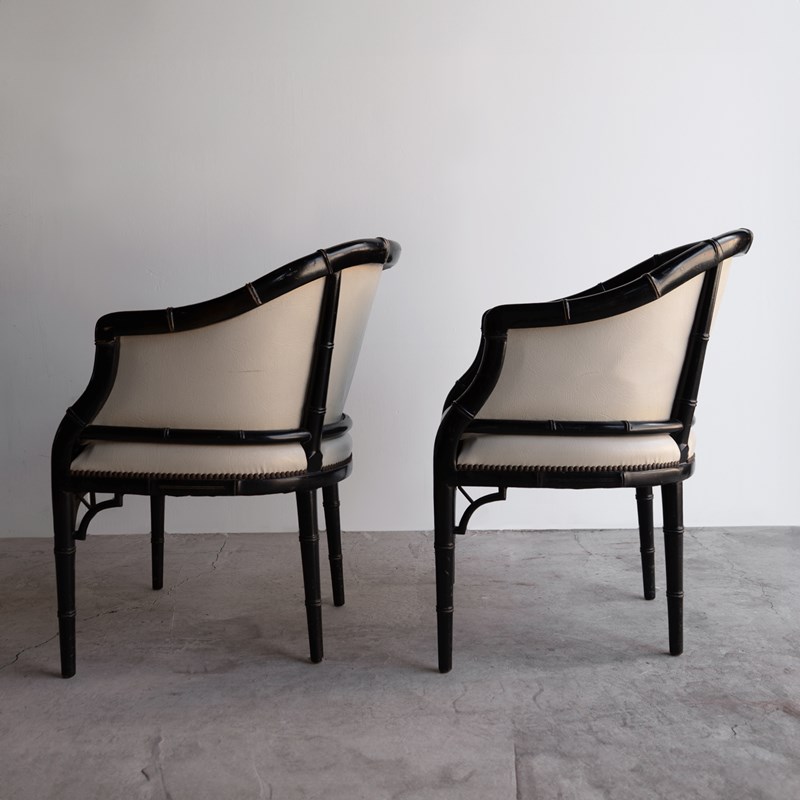 Pair Of Vintage Chinoiserie Ebonised Faux Bamboo Tub Chairs, Mid 20Th Century