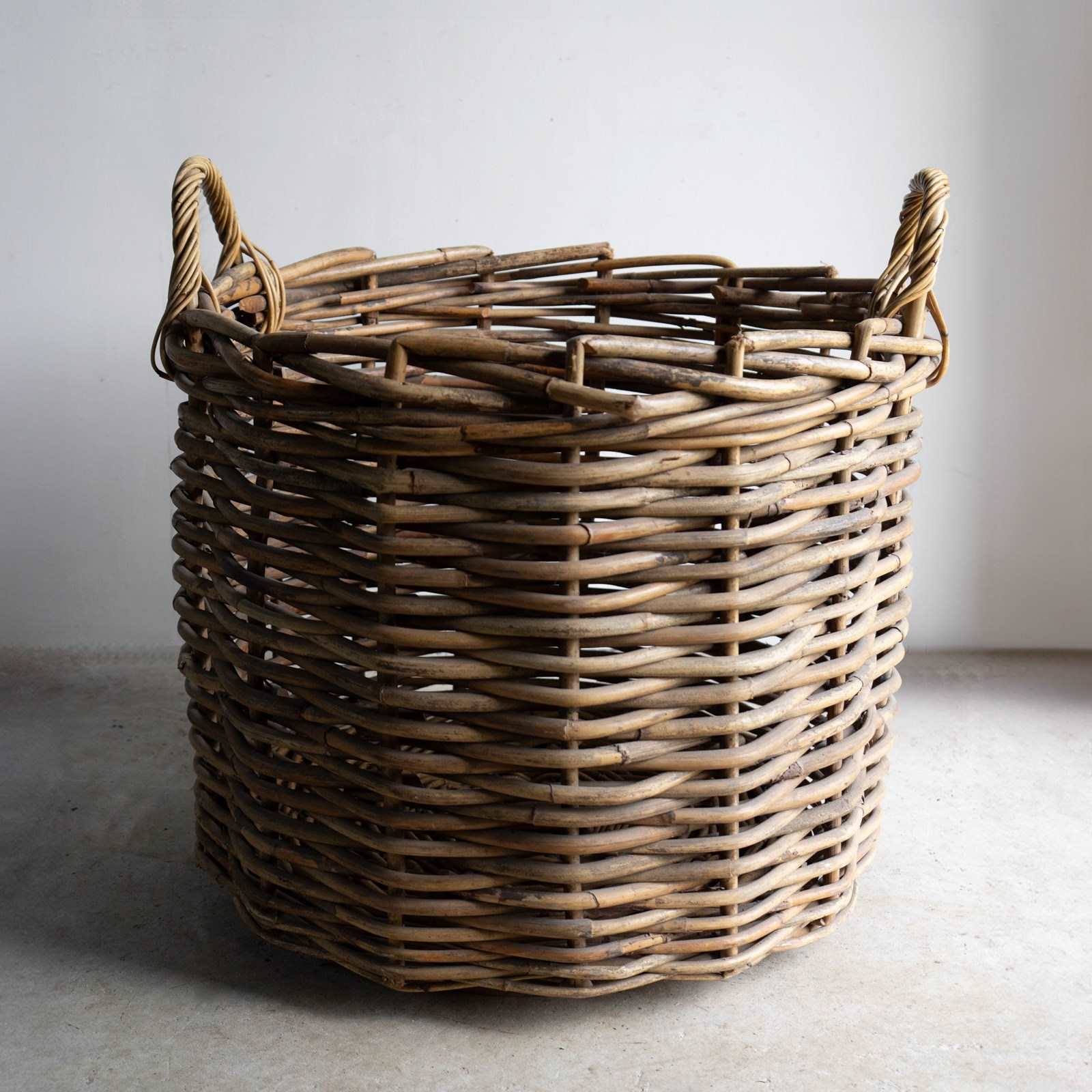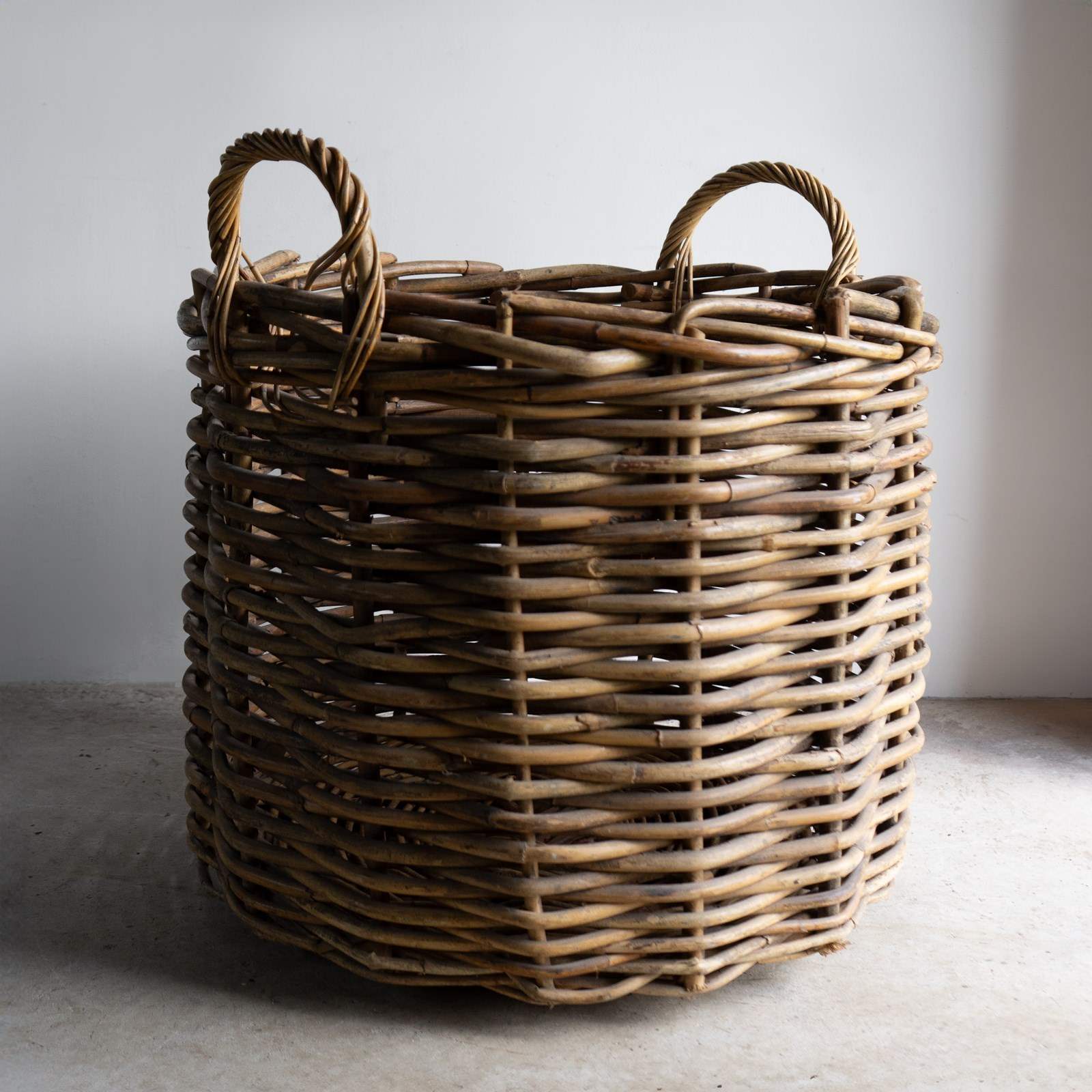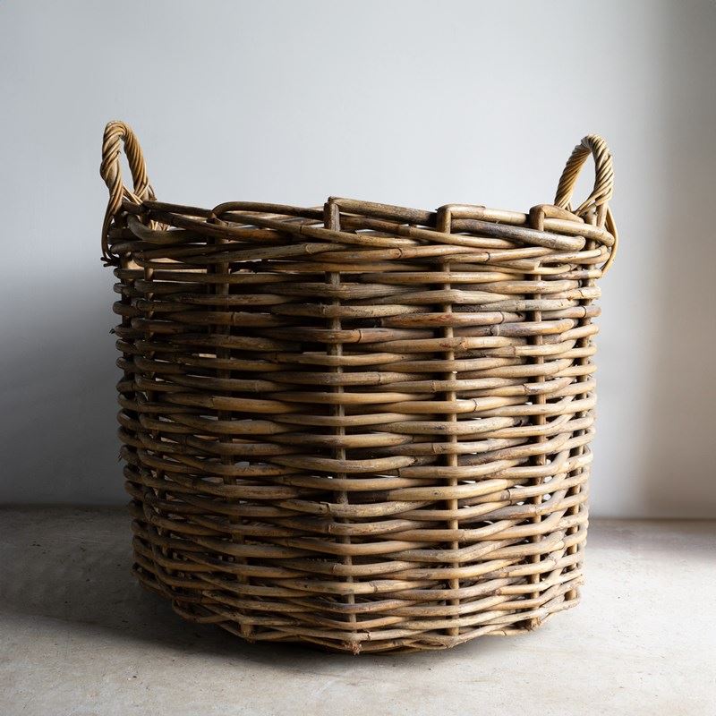 A handwoven cylindrical basket on a large scale made from chunky wicker with two carry handles.