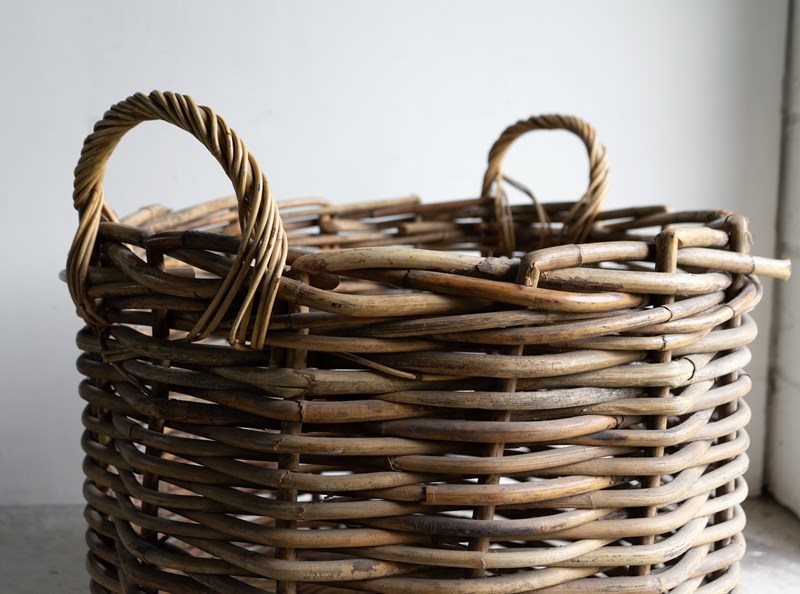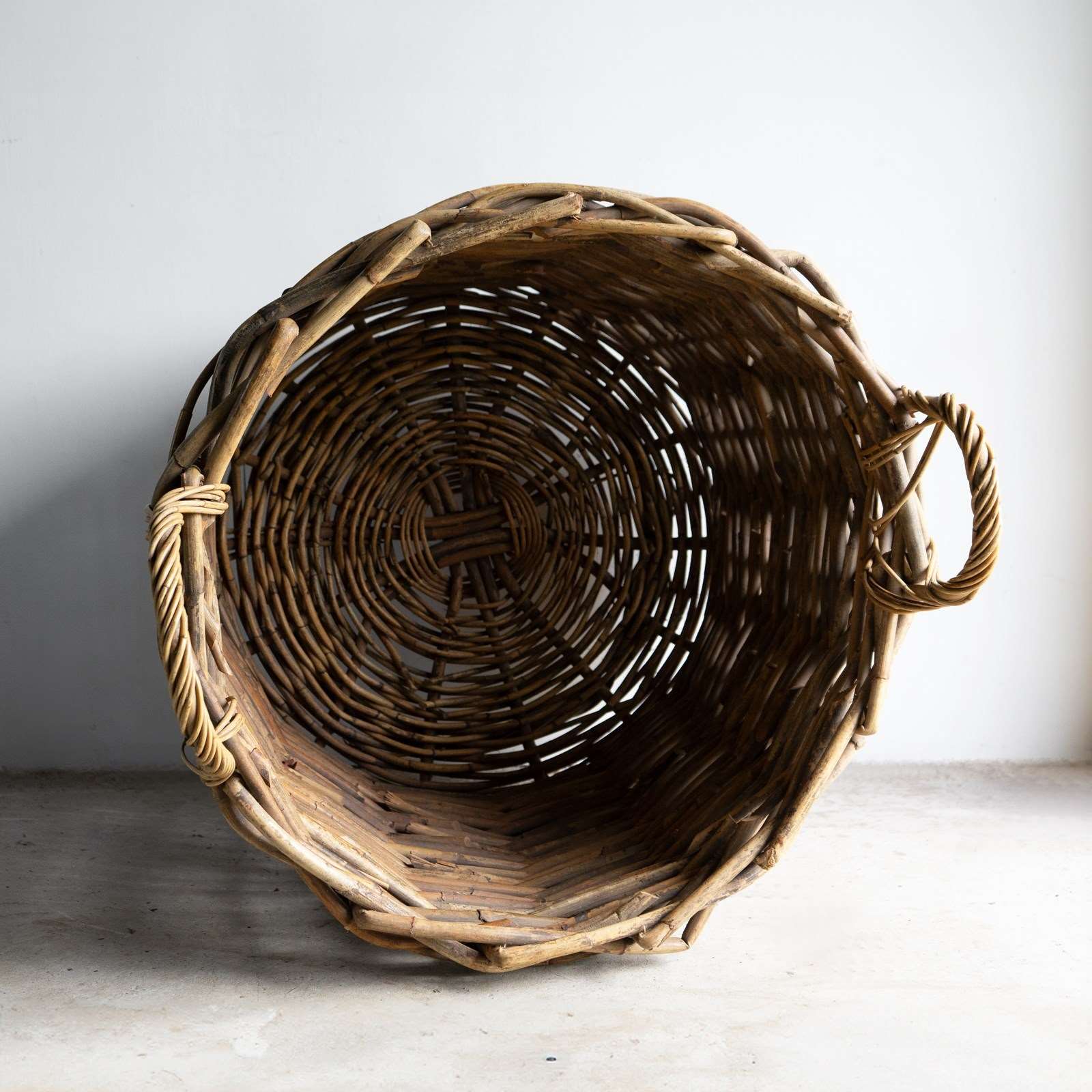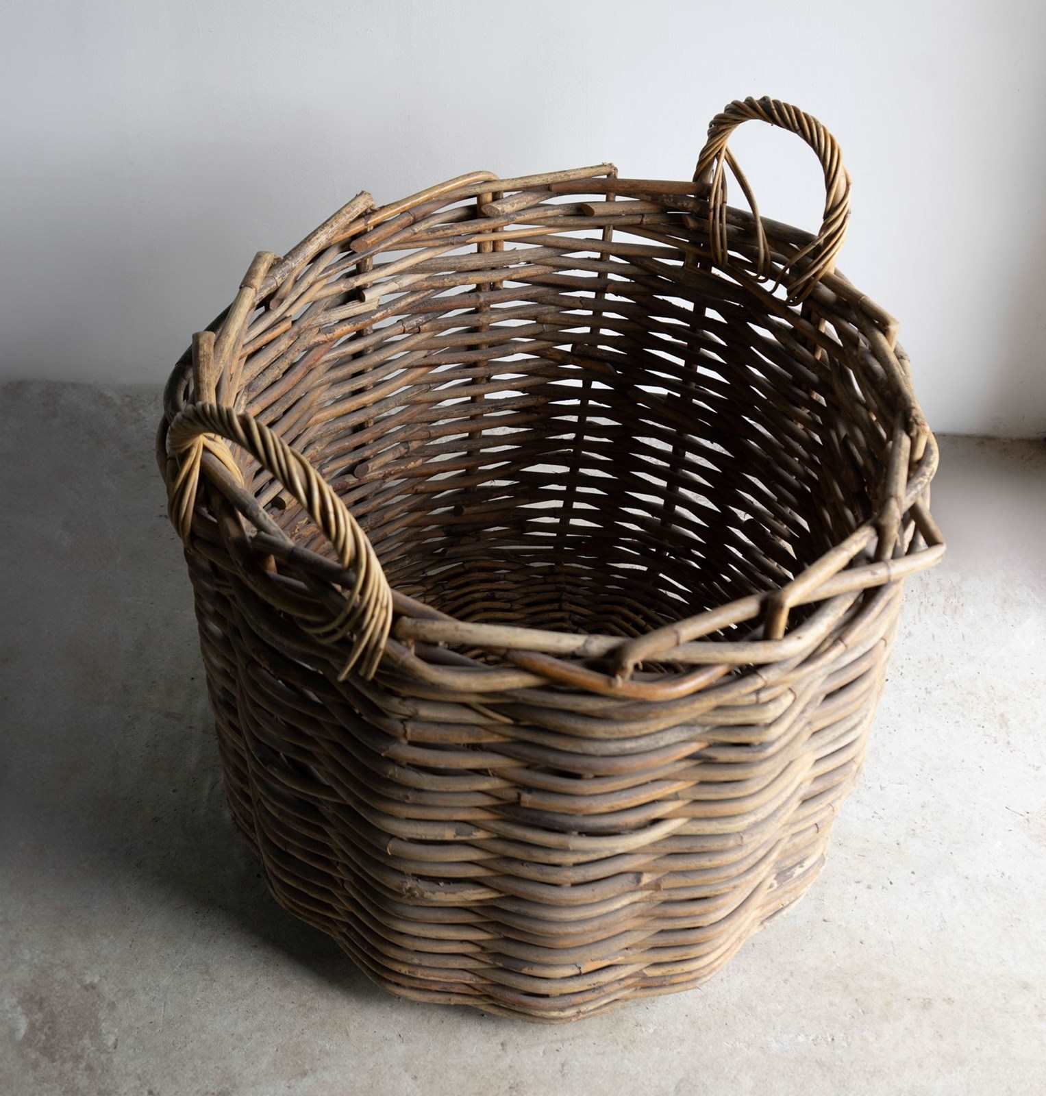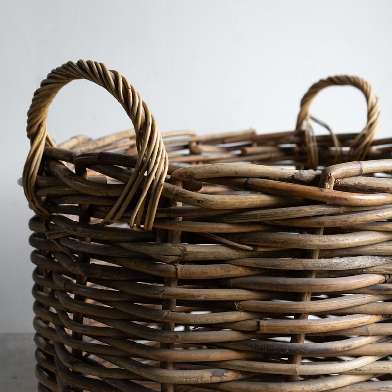 A handwoven cylindrical basket on a large scale made from chunky wicker with two carry handles.