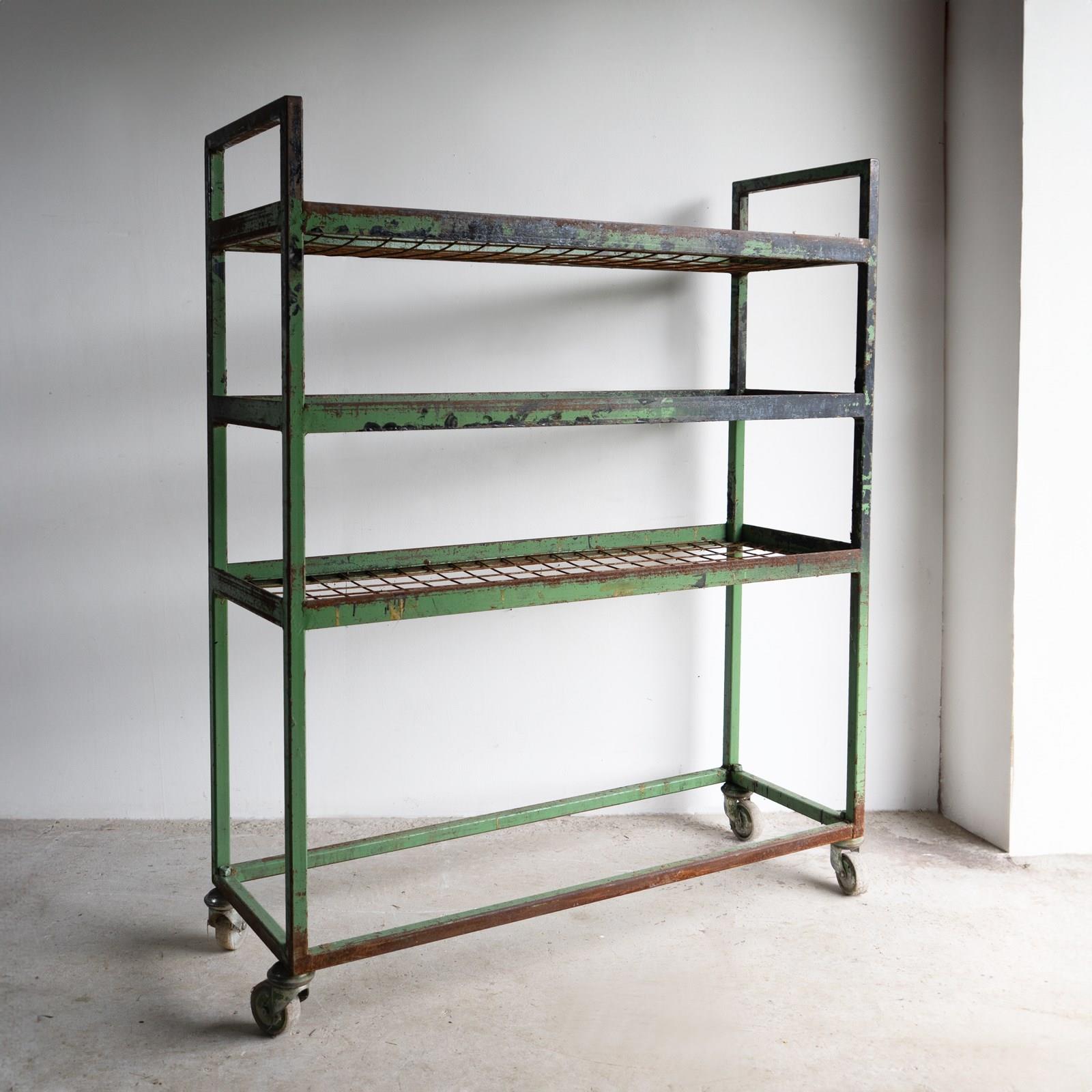 Vintage Green Metal Shoe Factory Shelving Rack Trolley, Mid 20Th Century