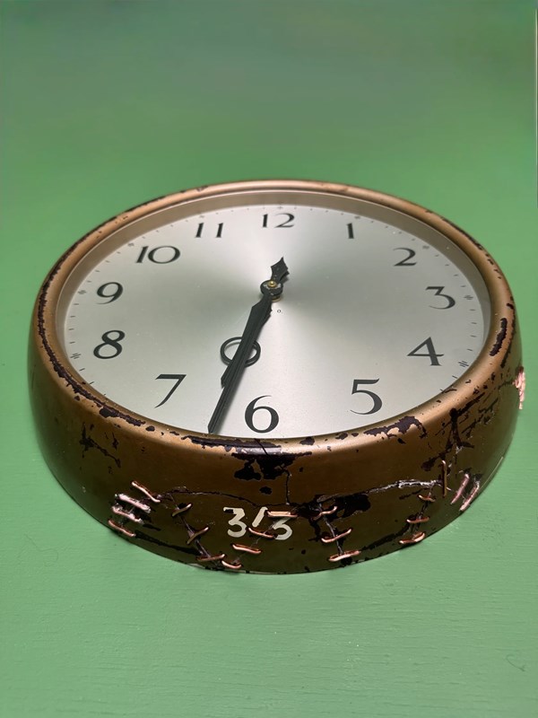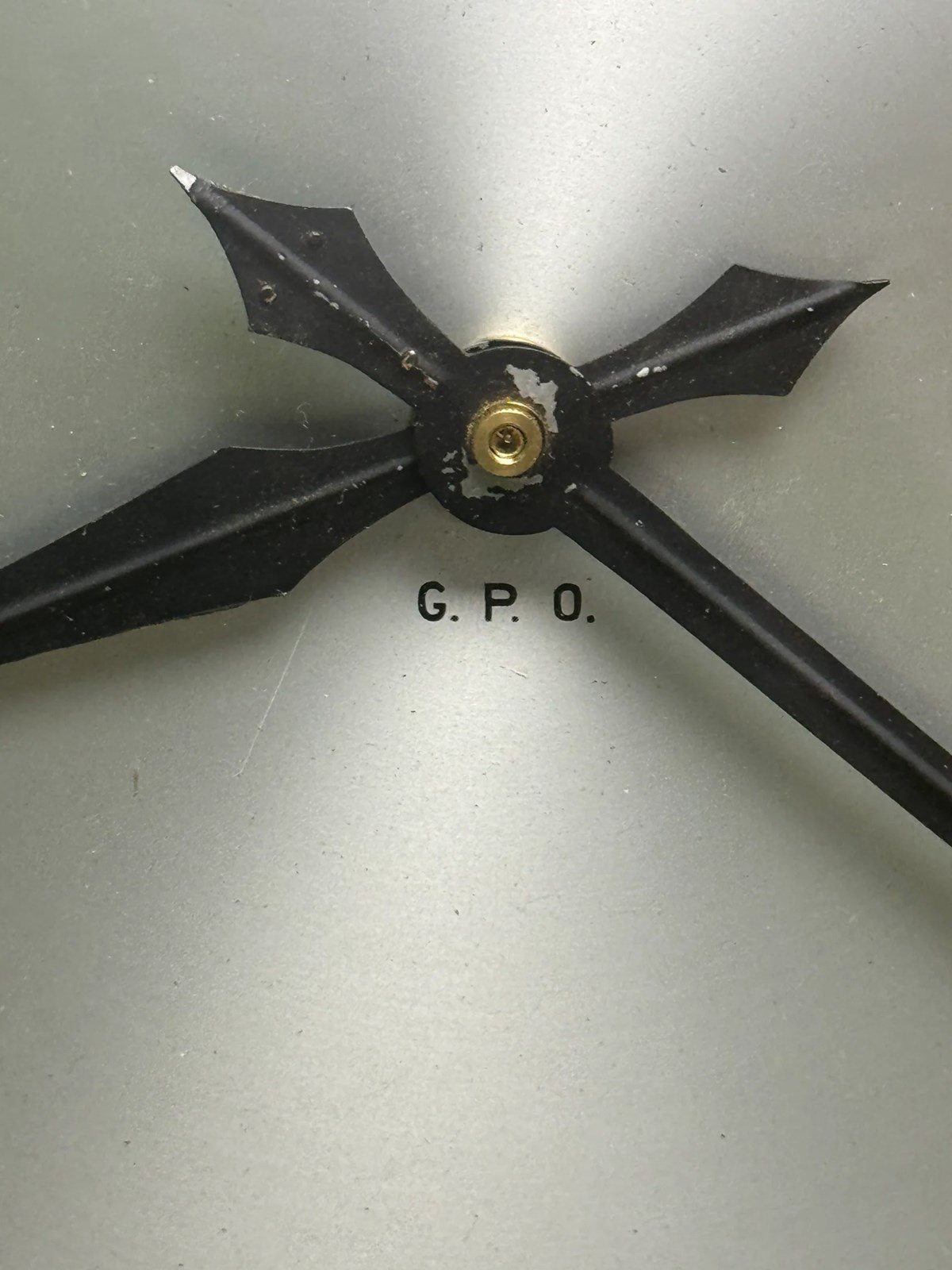 Painted Bakelite frame with silver clock face & original ornate hands, GPO initials stamped on the clock face. Clock has had repairs to the Bakelite frame where copper staples have been used to secure old breakages ( please see pictures ).
