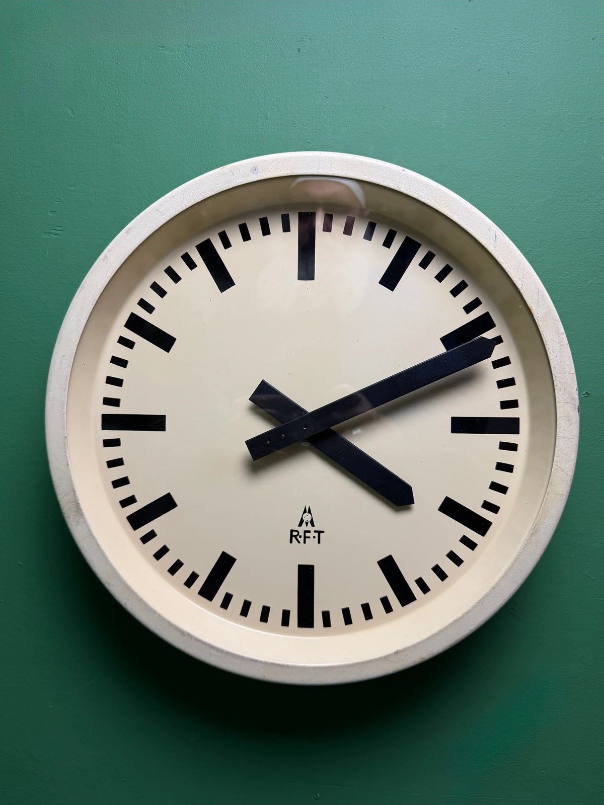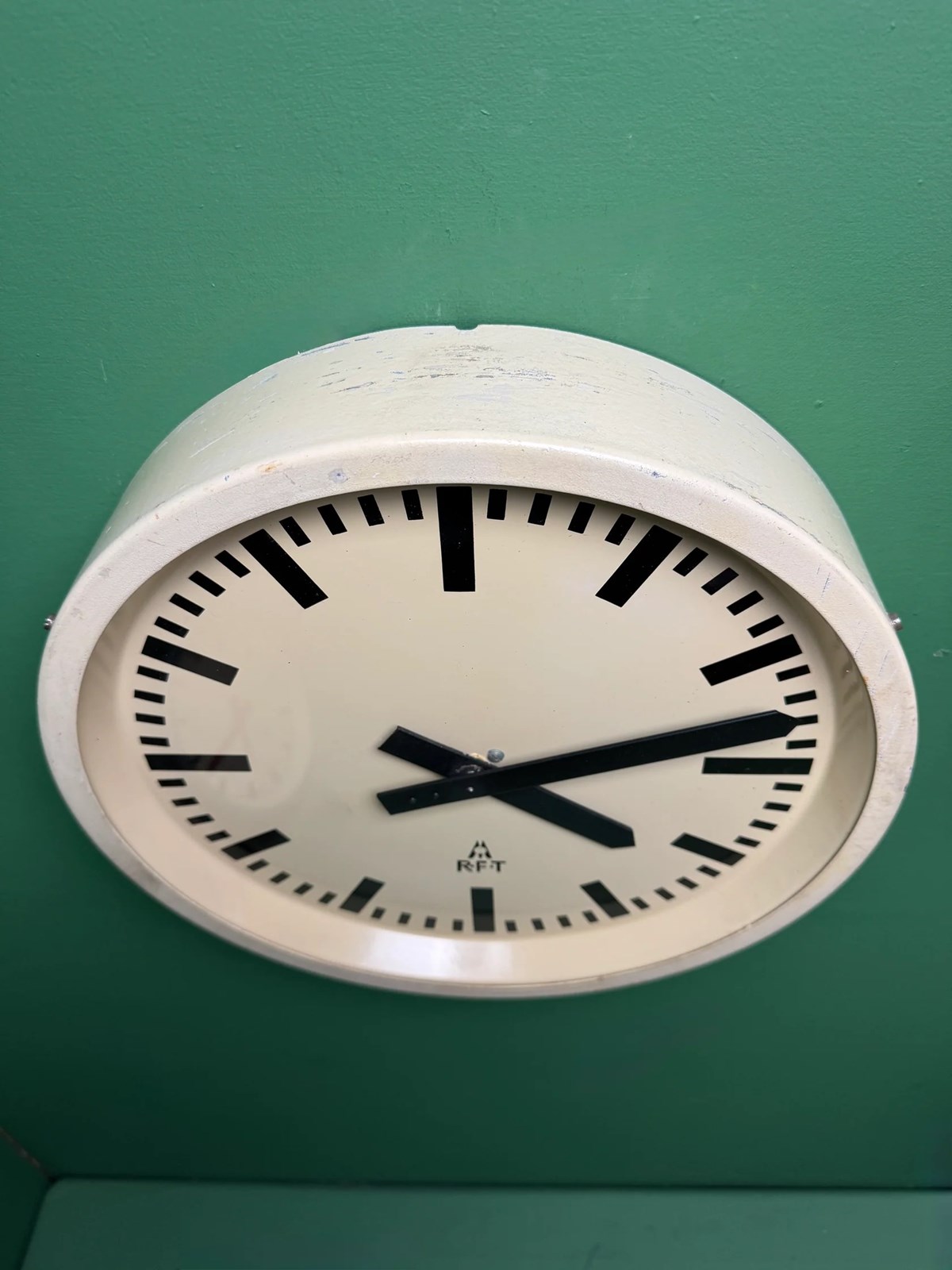 Cream steel frame with original paint & steel clock face with original hands. Clock shows great signs of aging.