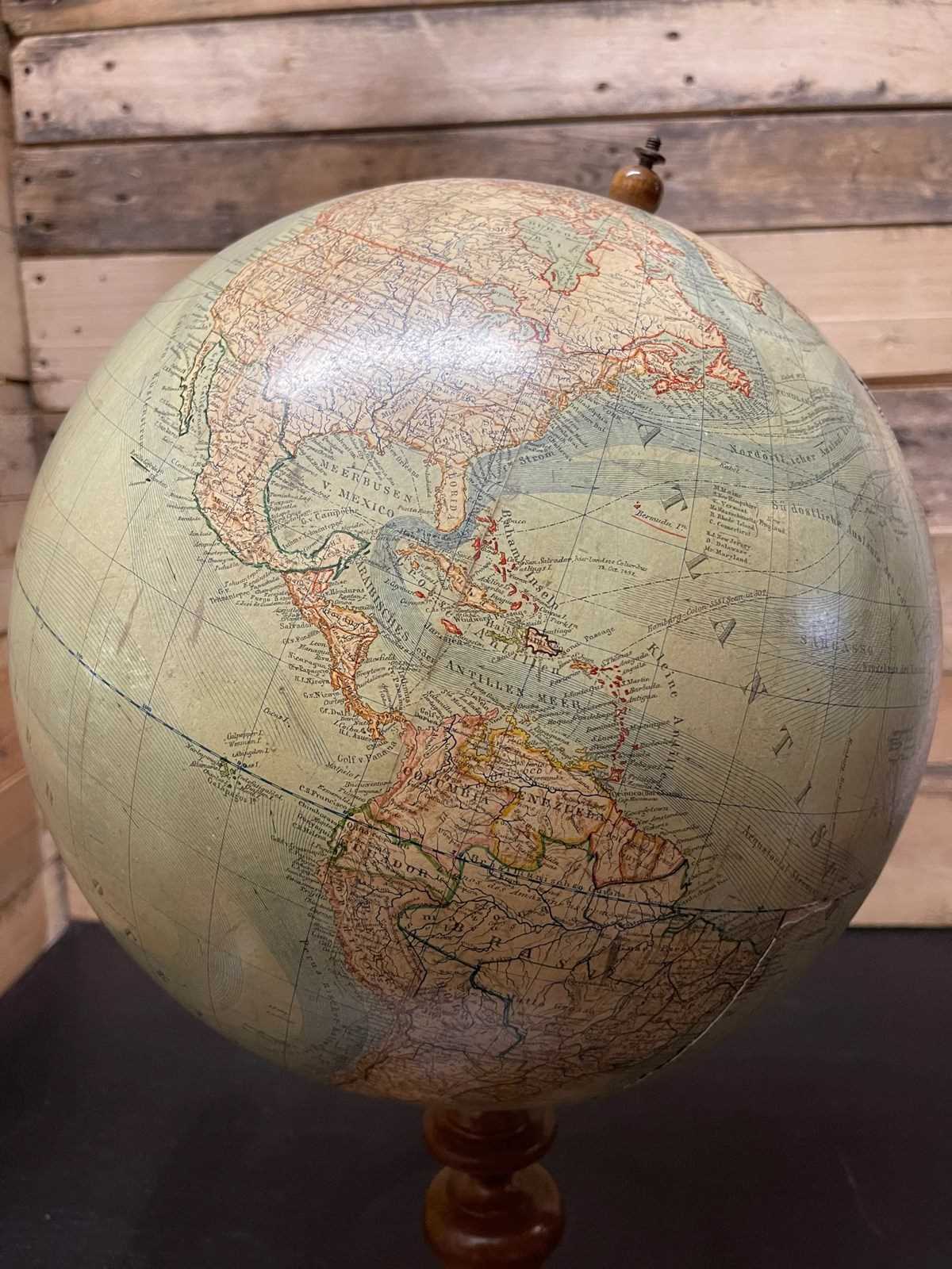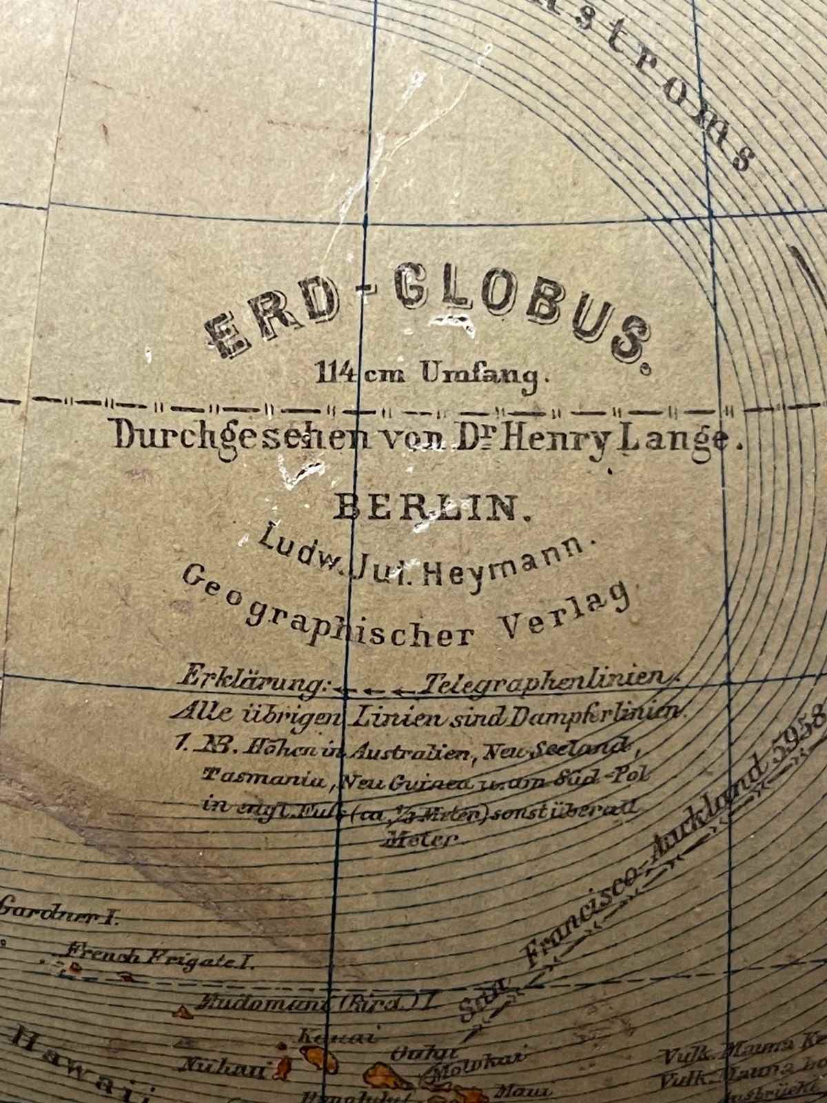 Antique German colour lithographic table globe by Ludwig Julius Heymann, reviewed by Dr Henry Lange Berlin circa 1890. Condition overall very good, slight wear & ageing, some splitting in the map & stand, ( please look at all the pictures carefully ). On a metal spindle & stands on an ornate stained turned wood stand.
