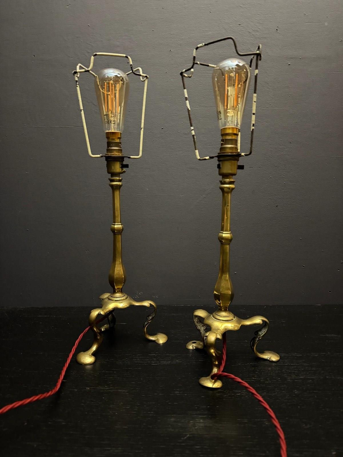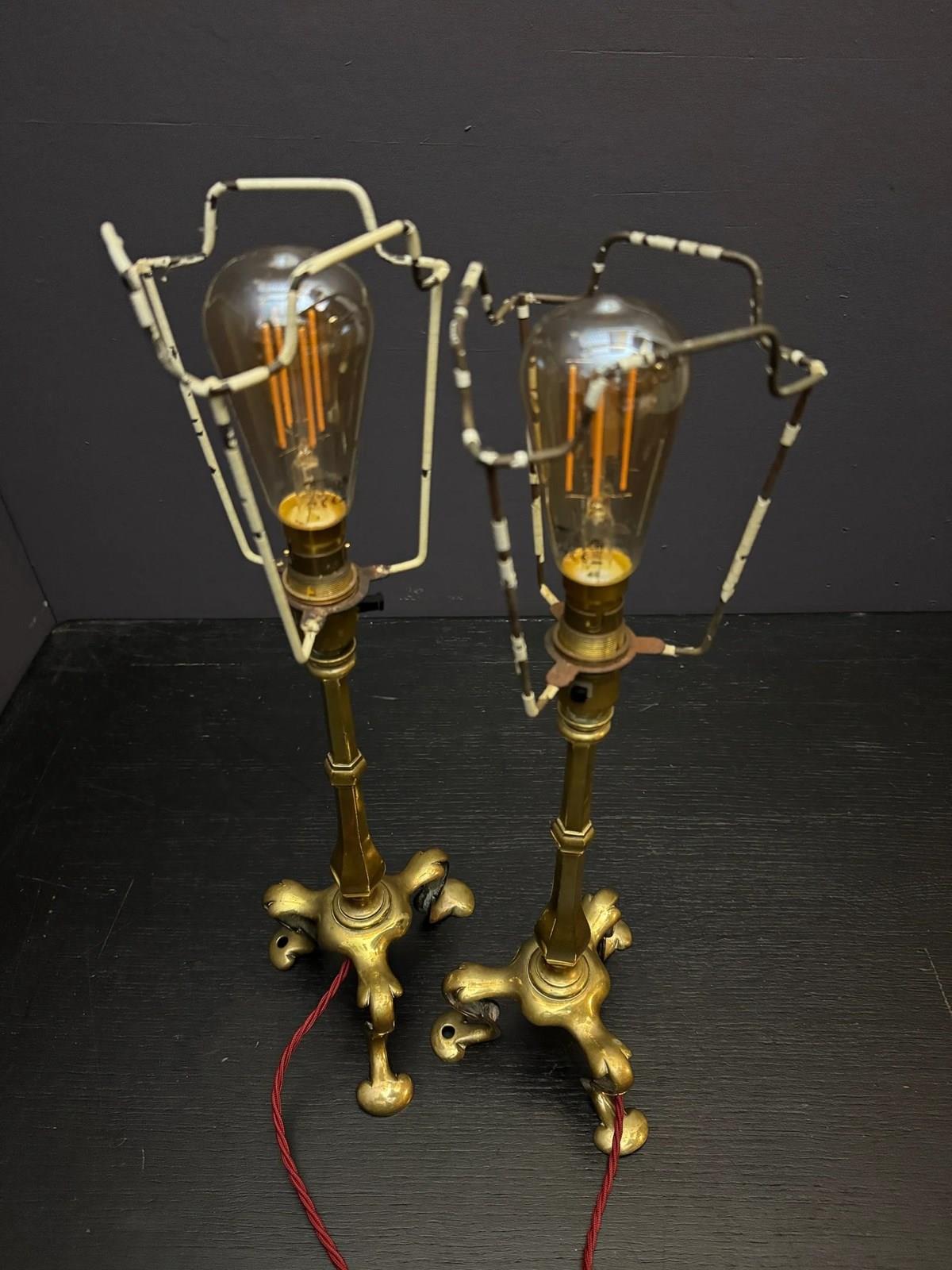 Beautiful brass base with unusual decorative lions feet. This pair of lamps were salvaged from out houses on the Glanusk Park country estate in Wales.