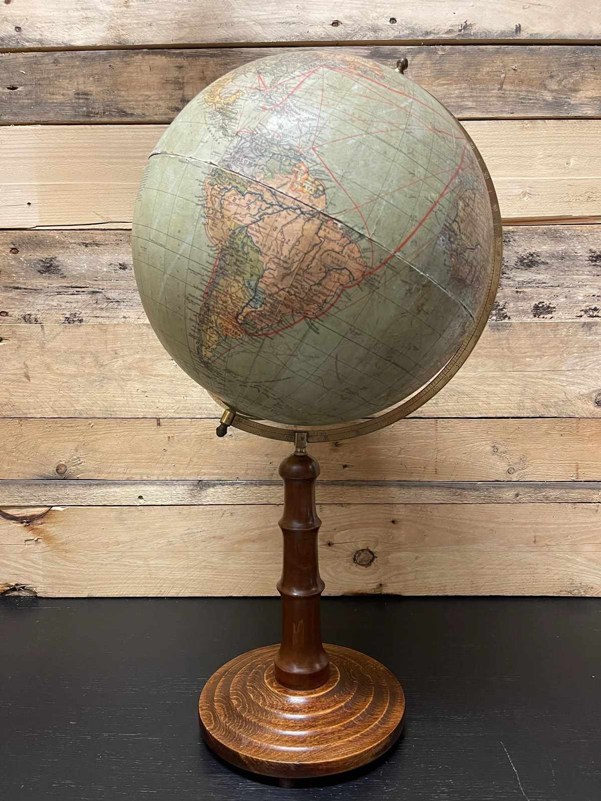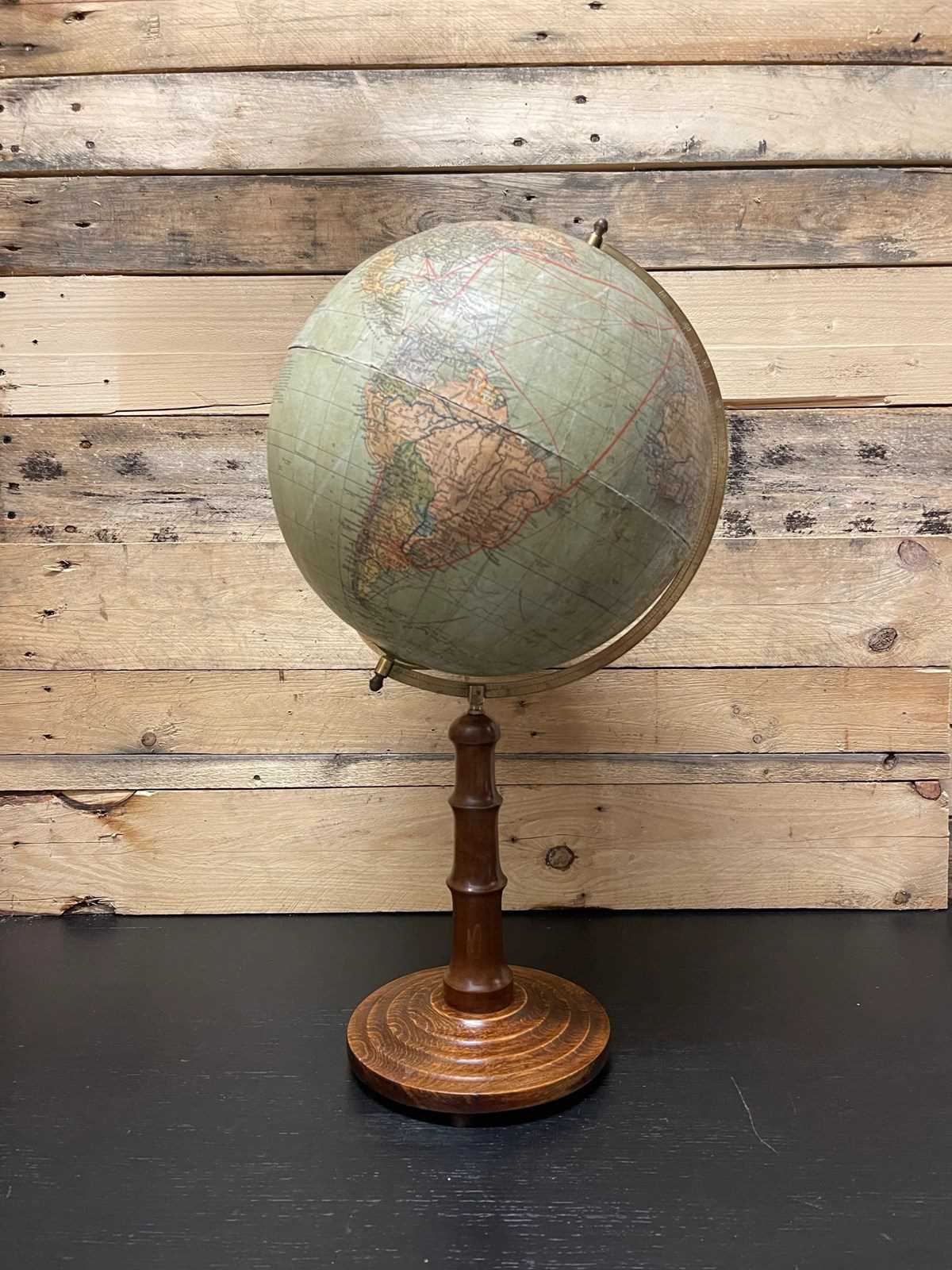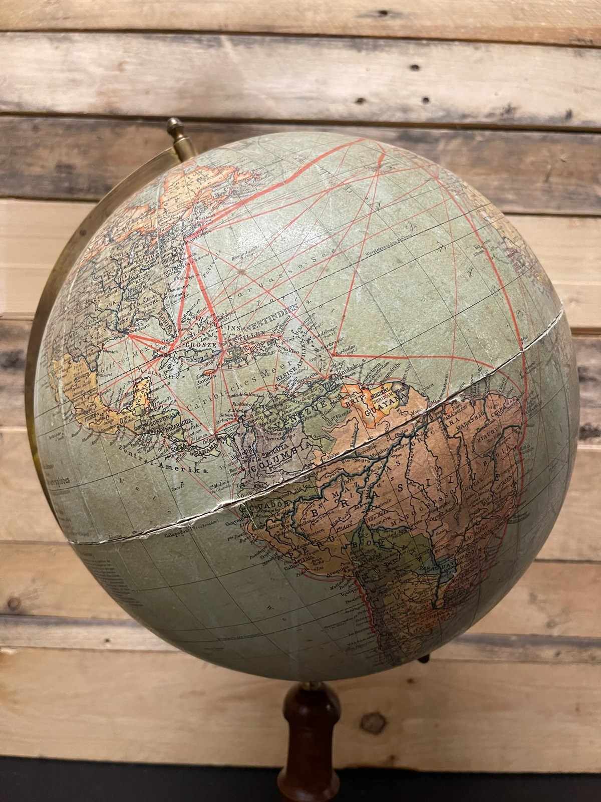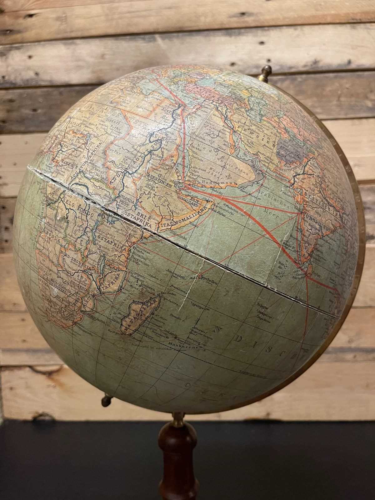 Antique German colour lithographic table globe by Paul Räth & Dr A Krause, Leipzig 1920s. Condition overall good, visible wear & ageing, bit of a split in the centre of the map ( please look at all the pictures carefully ). On a metal spindle & stands on a stained turned faux bamboo wood stand.
