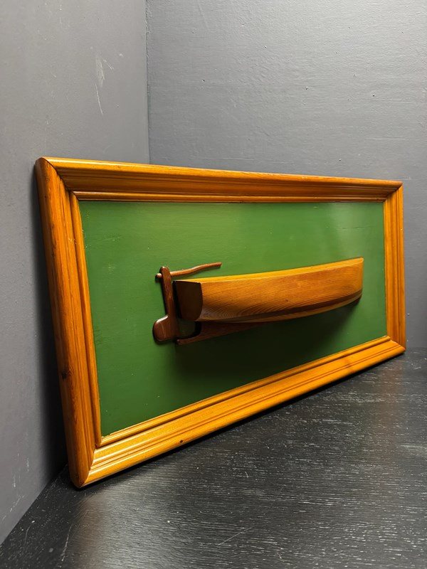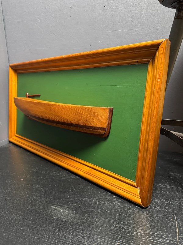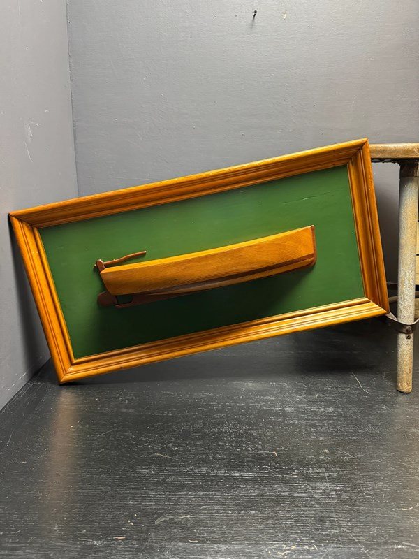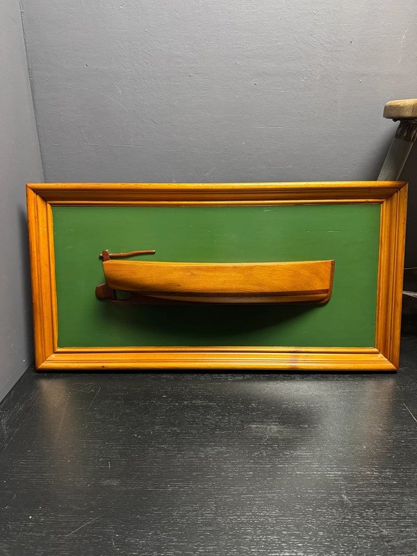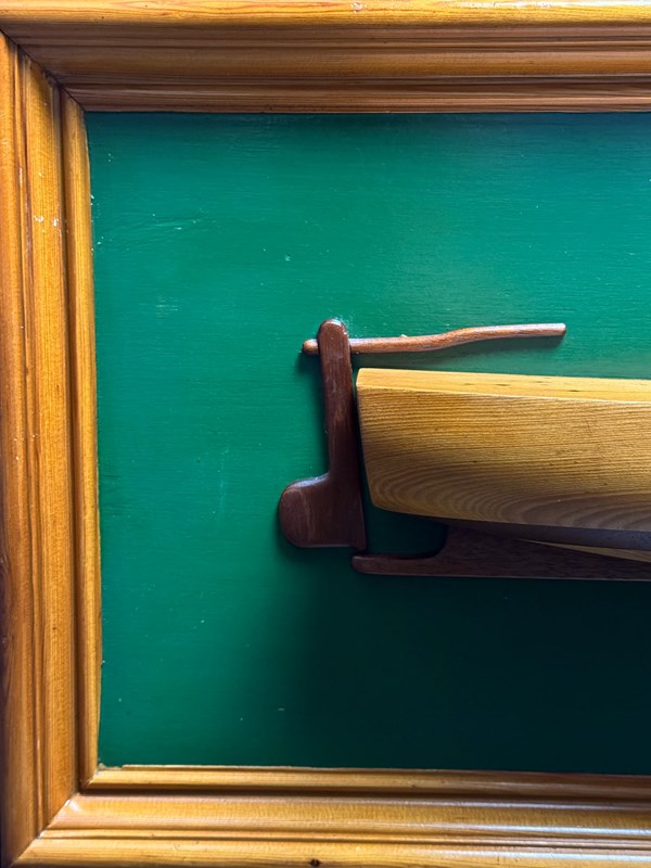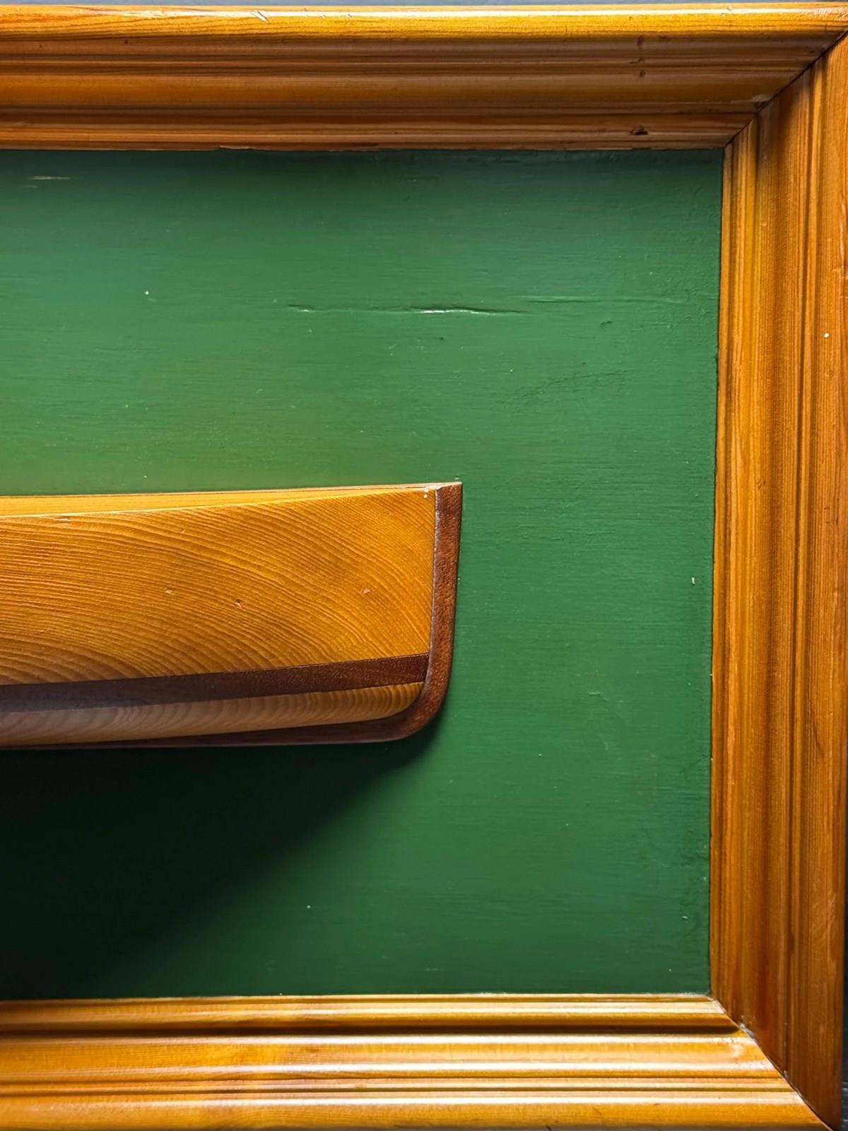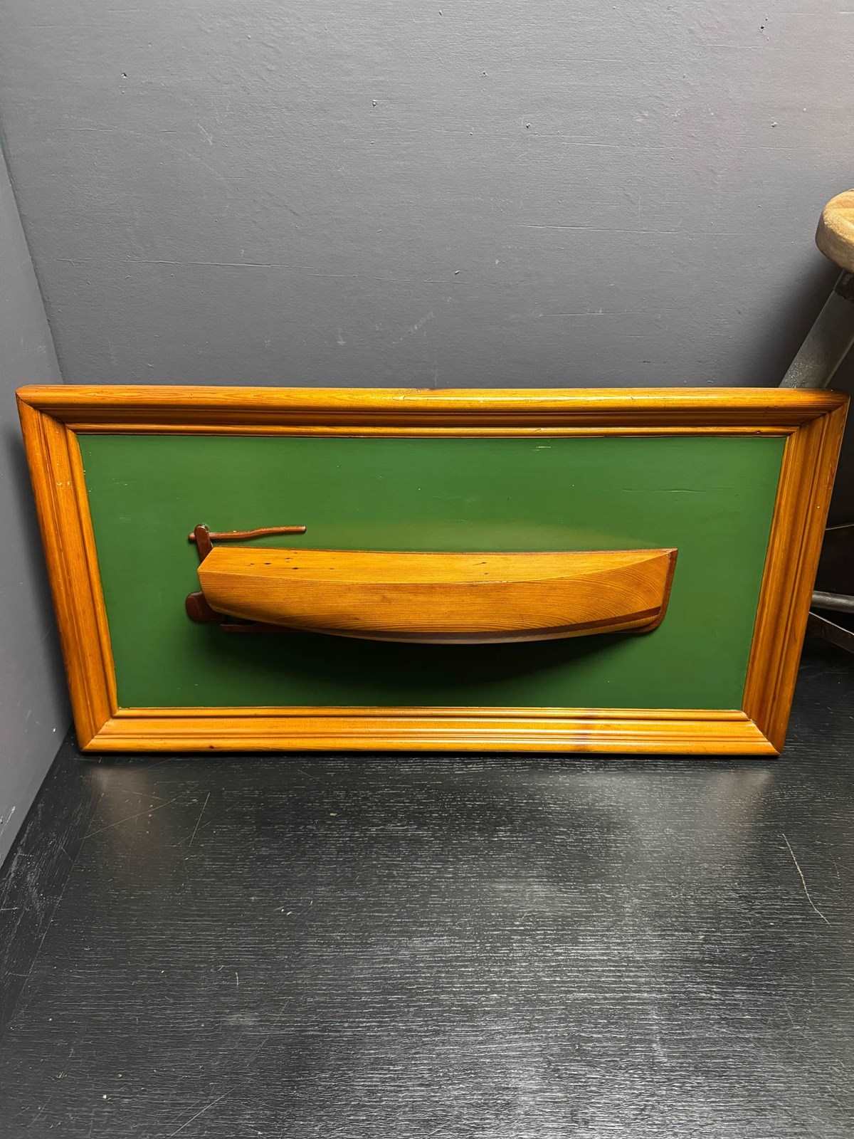 Circa 1980s hand made framed boat makers diorama, these are made when a customer wants a boat built to order. The boat maker will make a framed diorama for the customer to approve & keep to go with their new bought boat.