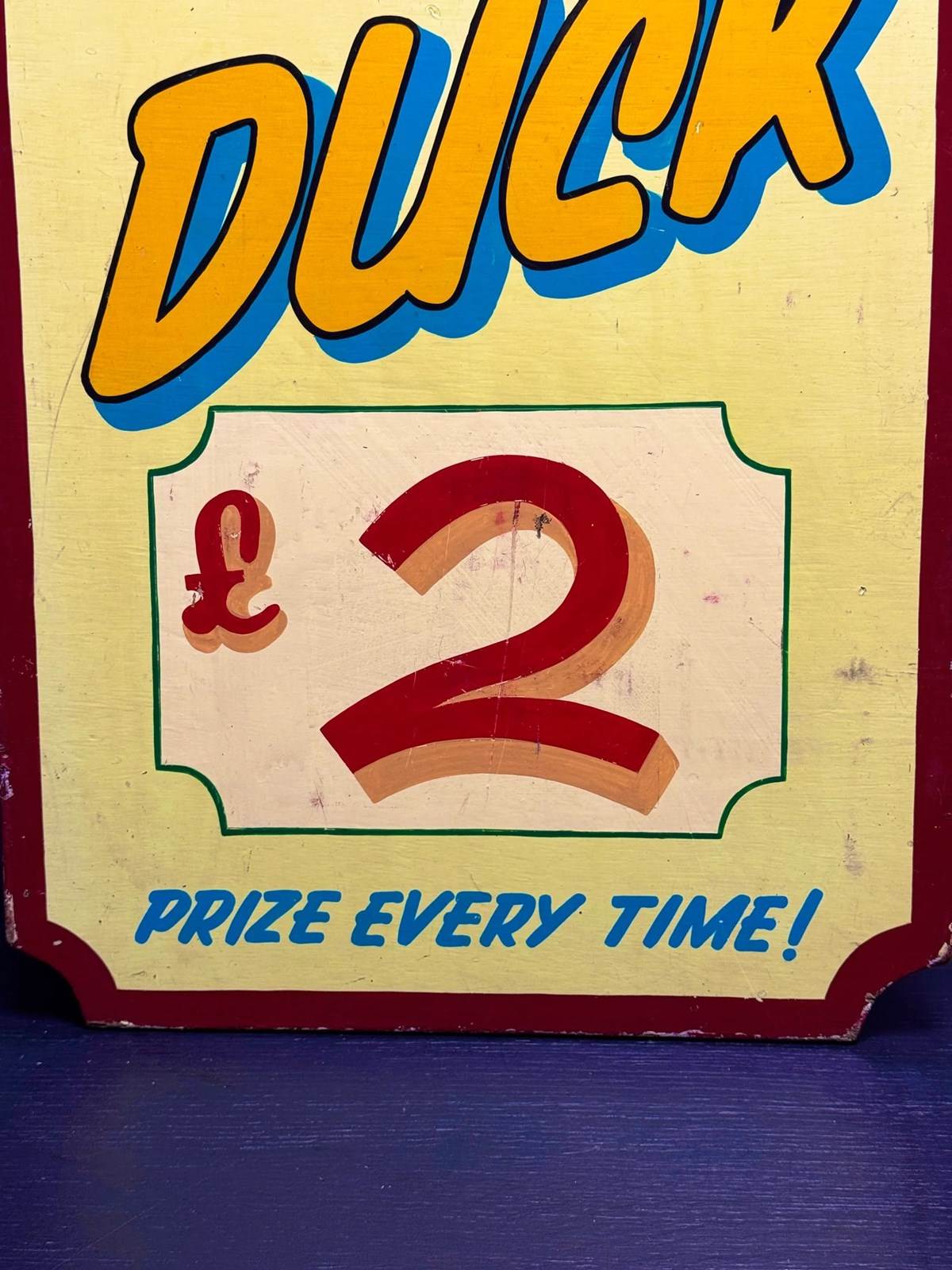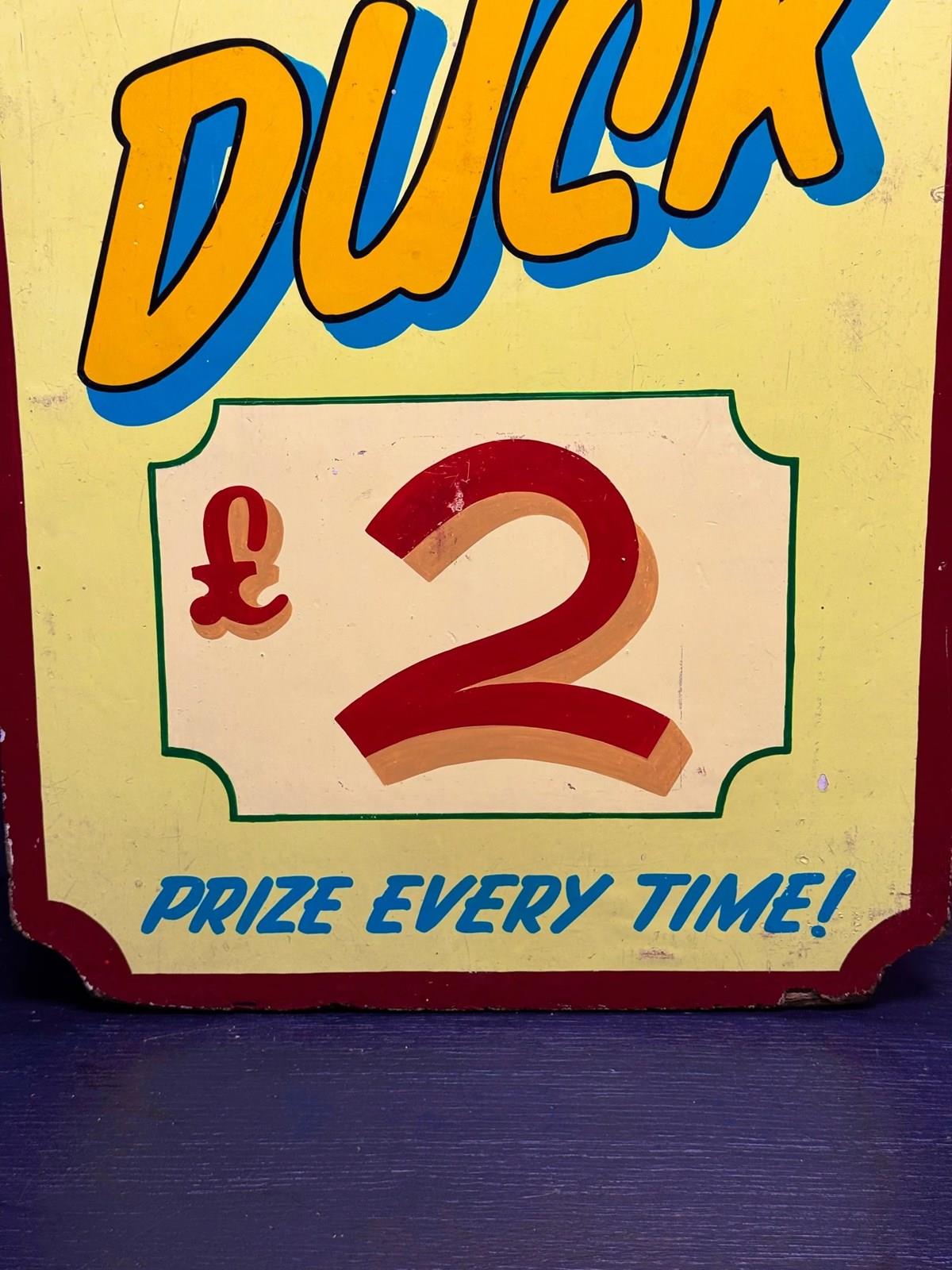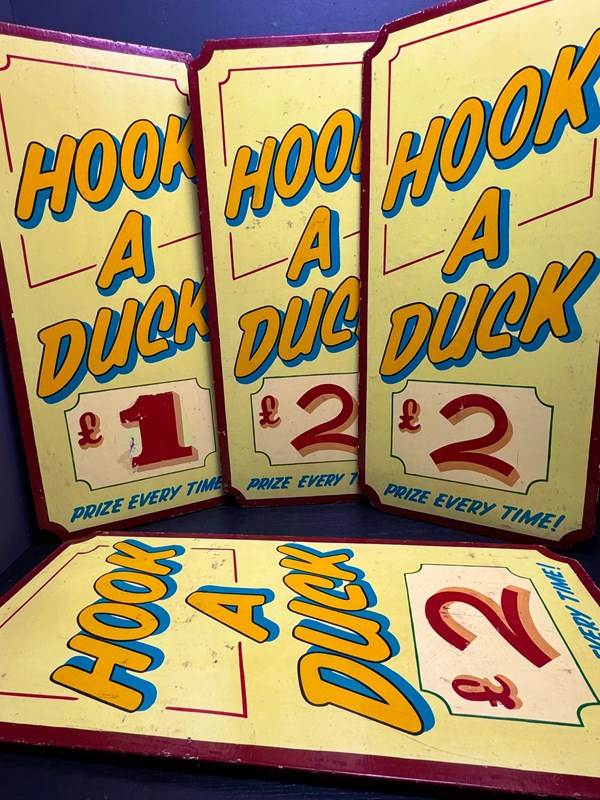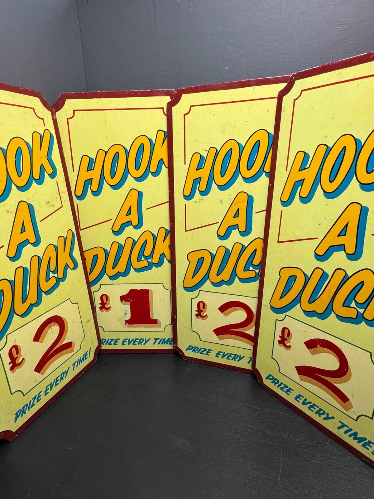 Hook A Duck game signs with price, fun fair art that once advertised the Hook A Duck game at fun fairs. Hand painted onto boards by renowned fun fair artist Michael Rule.