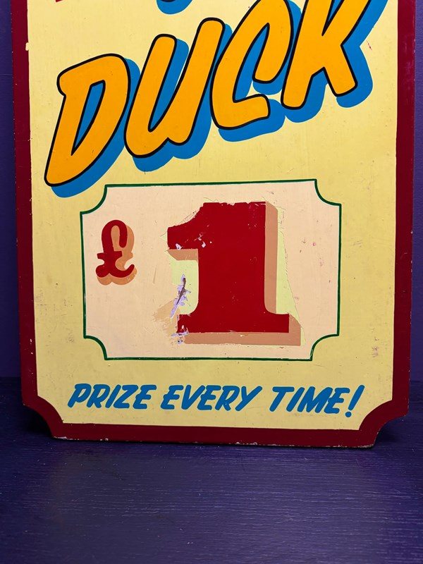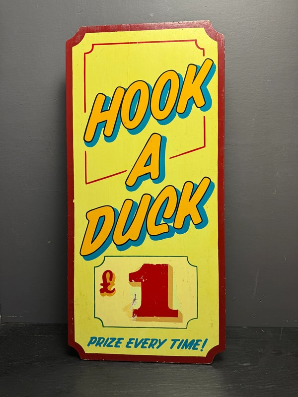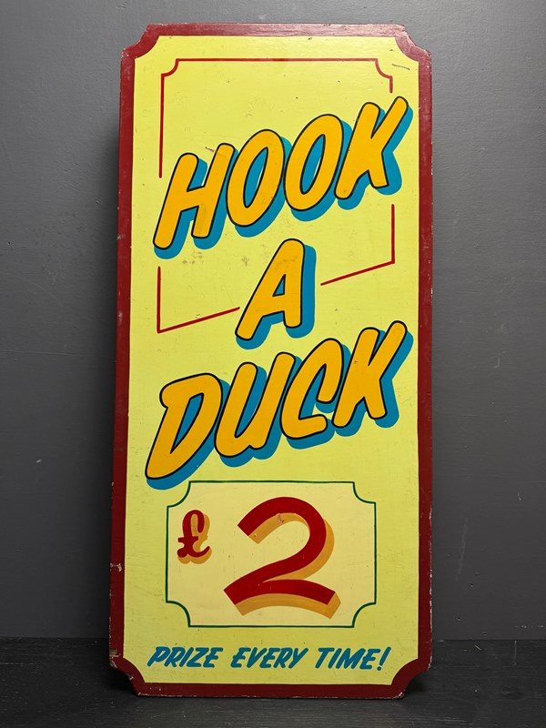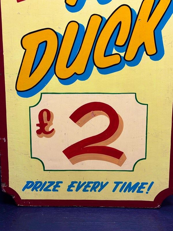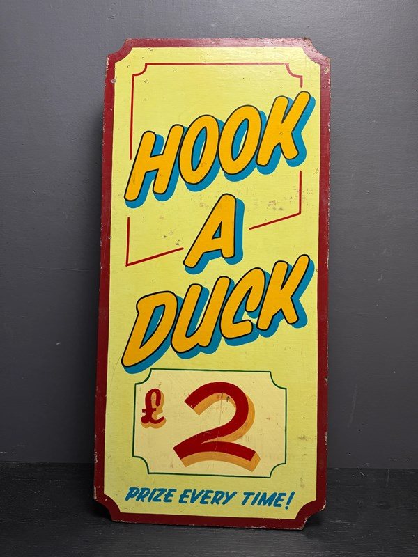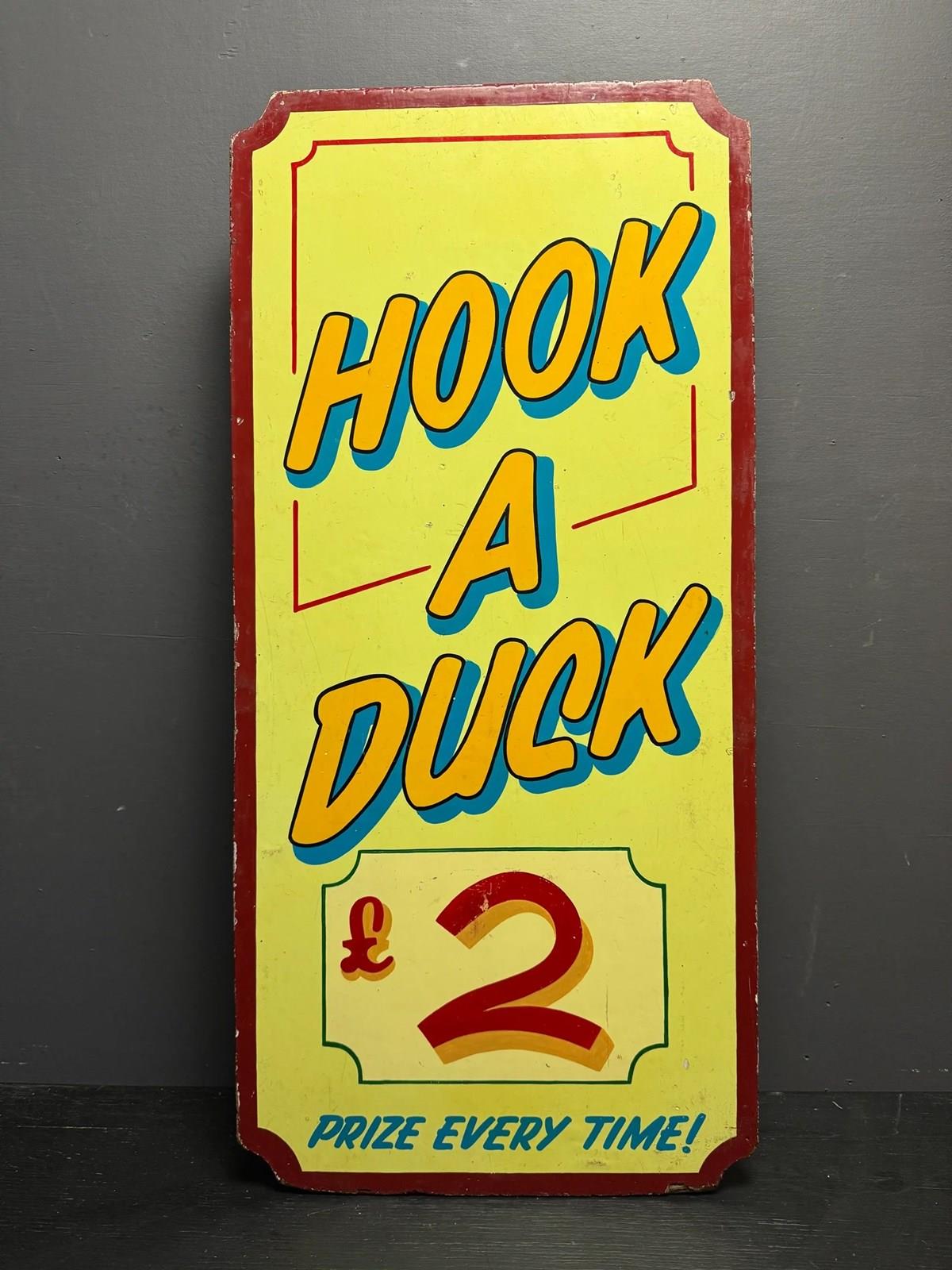 Hook A Duck game signs with price, fun fair art that once advertised the Hook A Duck game at fun fairs. Hand painted onto boards by renowned fun fair artist Michael Rule.