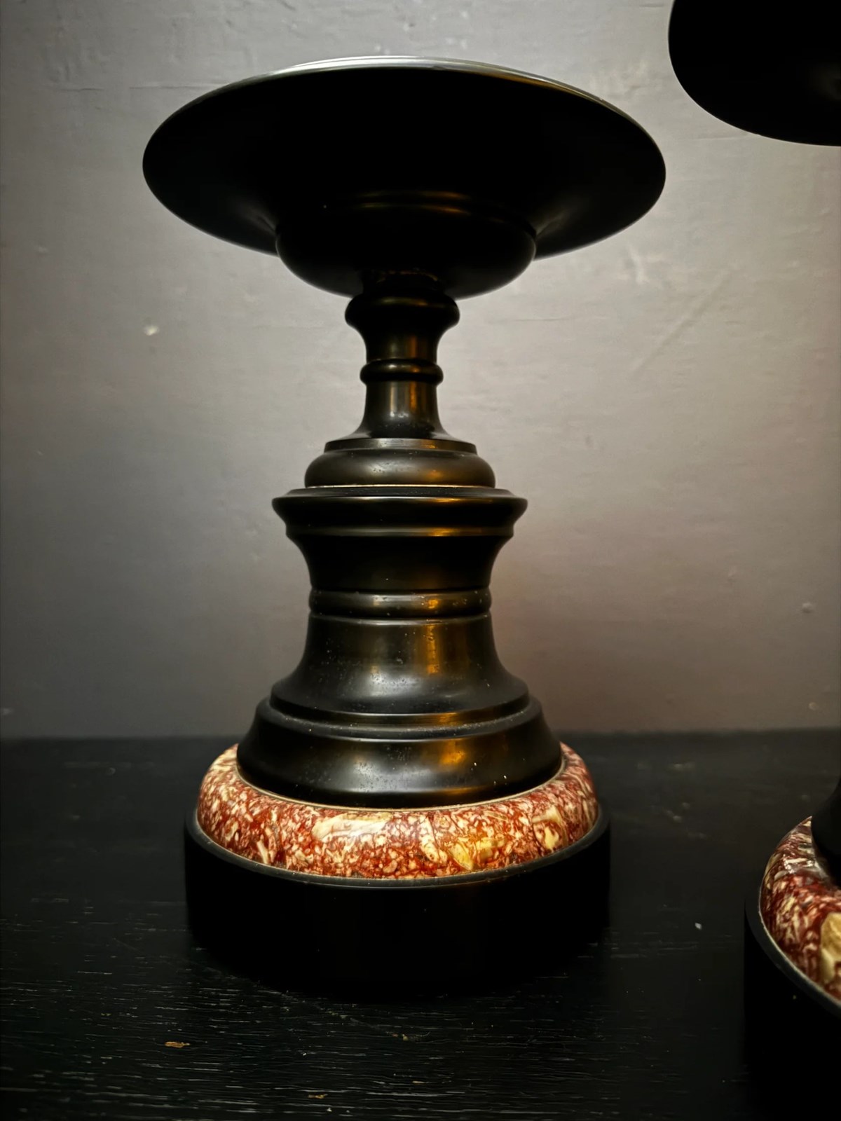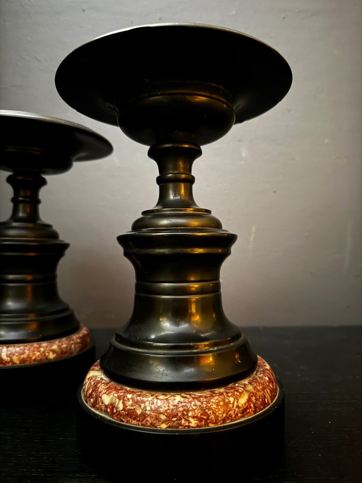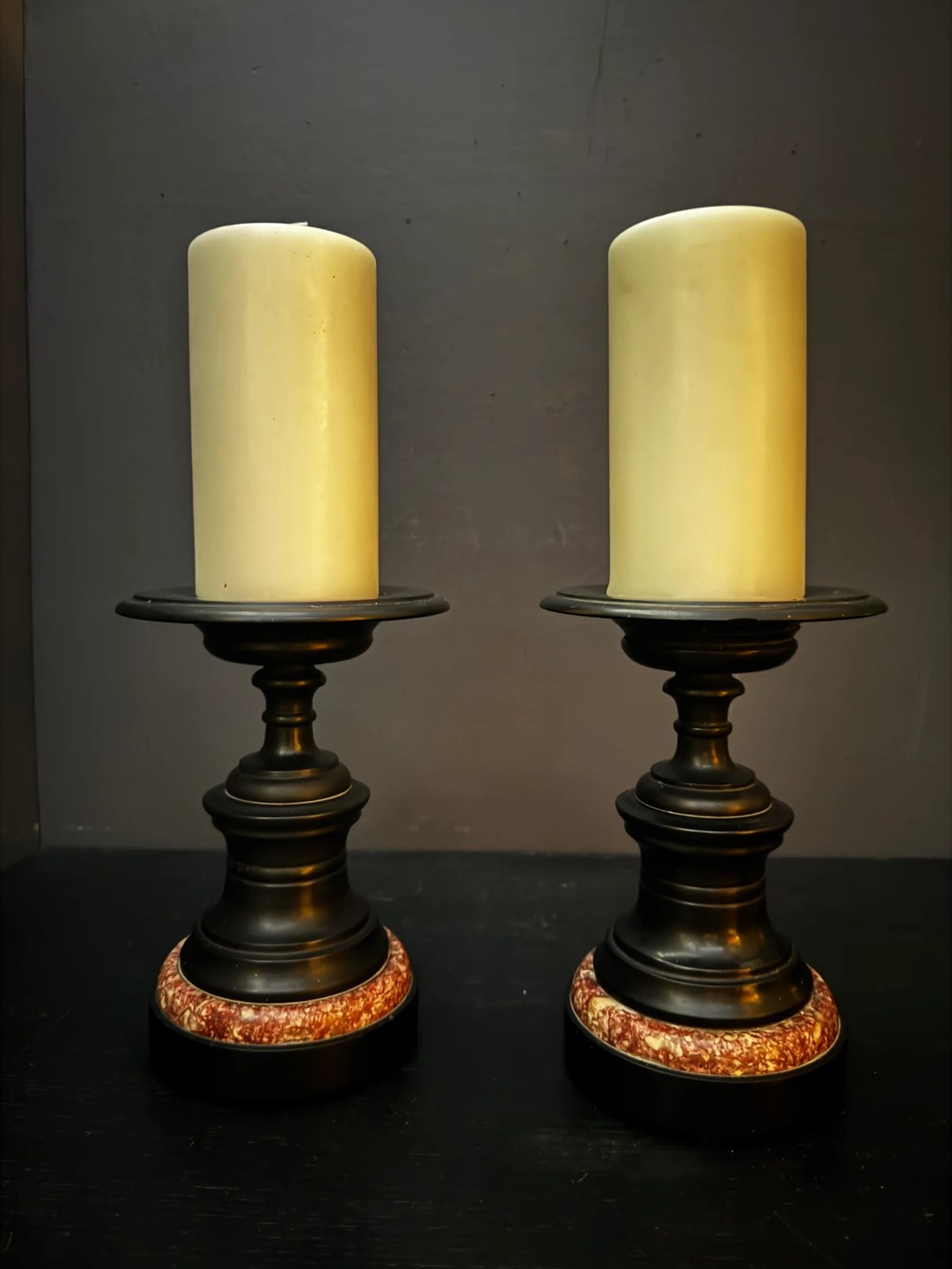 Pair of French mid 1800s exquisitely turned black marble candle sticks with red marble detailing on the base.