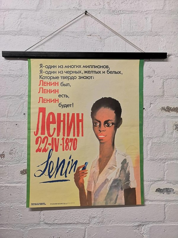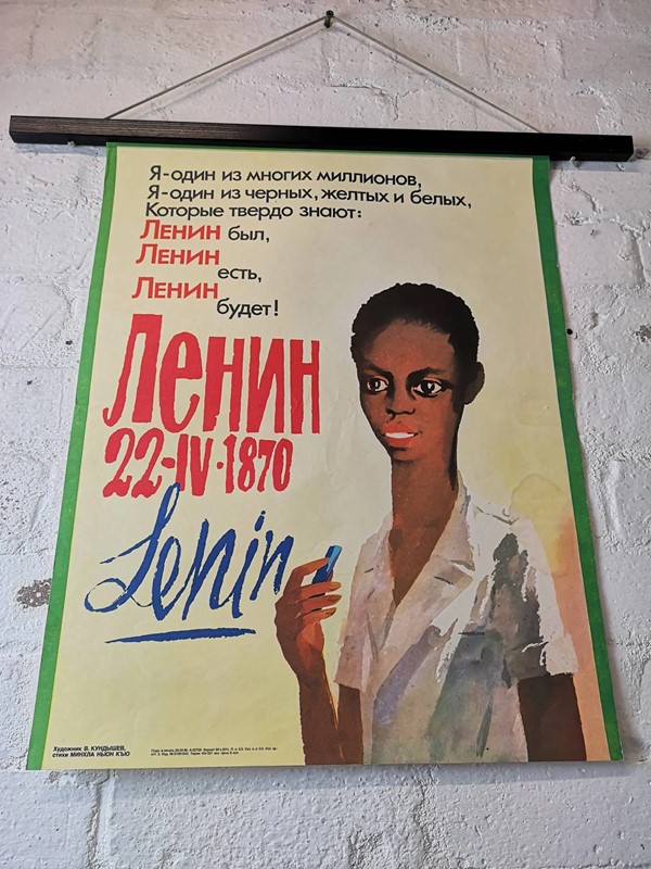 The poster reads , " I am one of many millions, I am one of the black, yellow, white who firmly know , Lenin was , Lenin is , Lenin will be ! Lenin 22-04-1870 ".