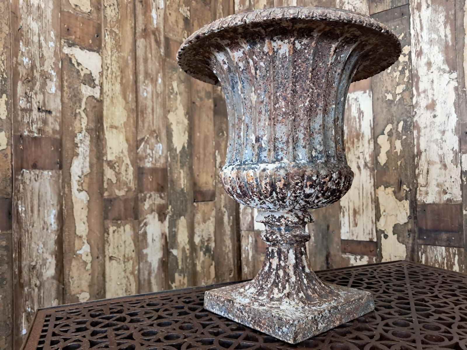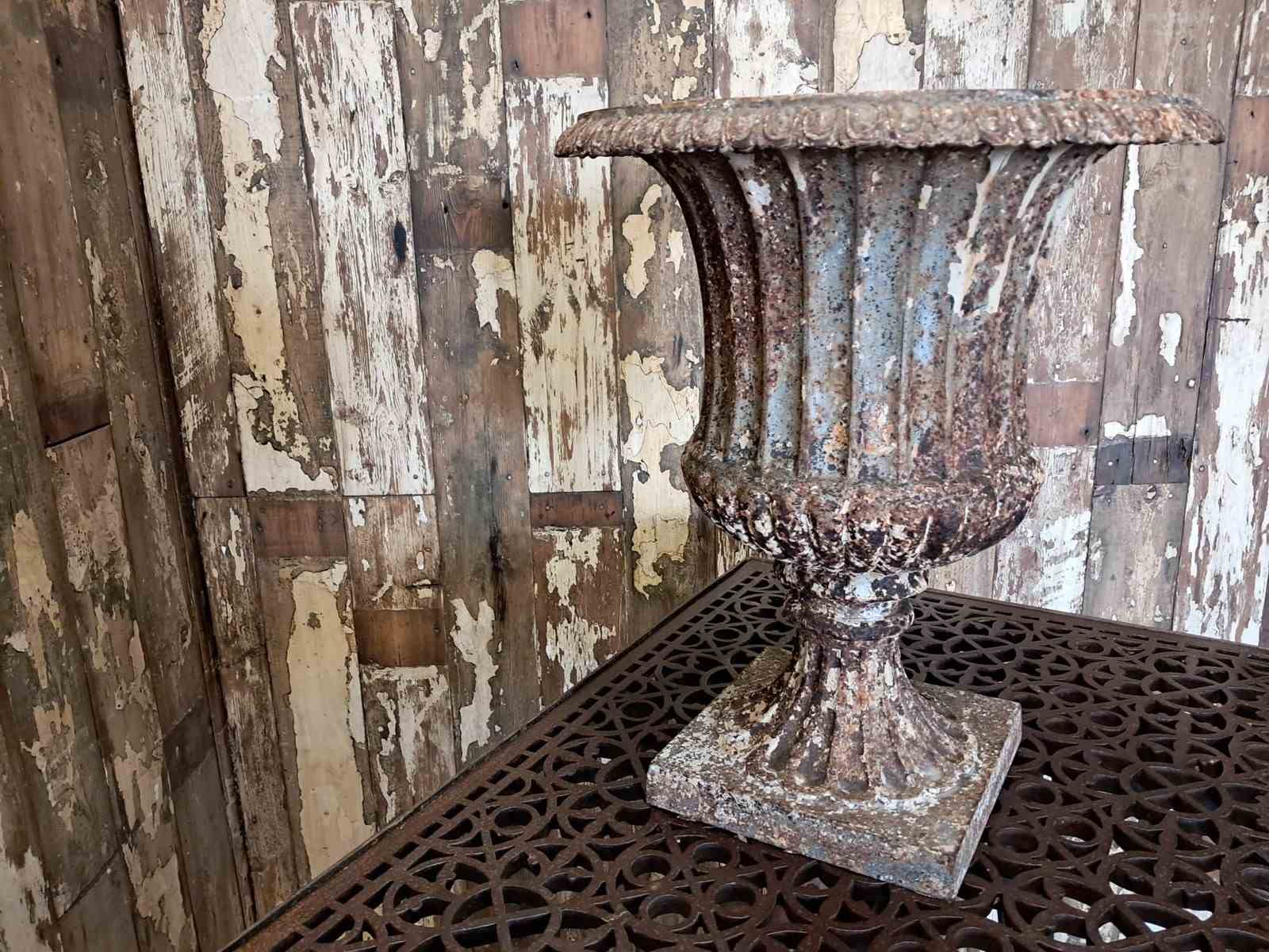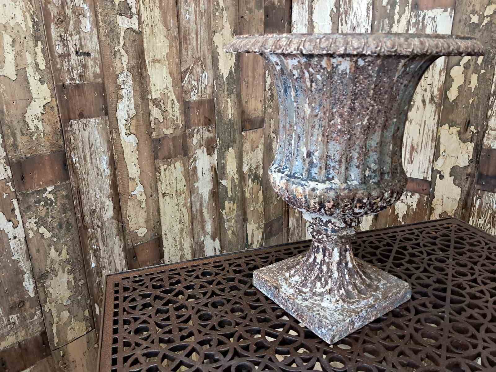 A beautiful weathered French cast iron urn of the Neoclassical style.