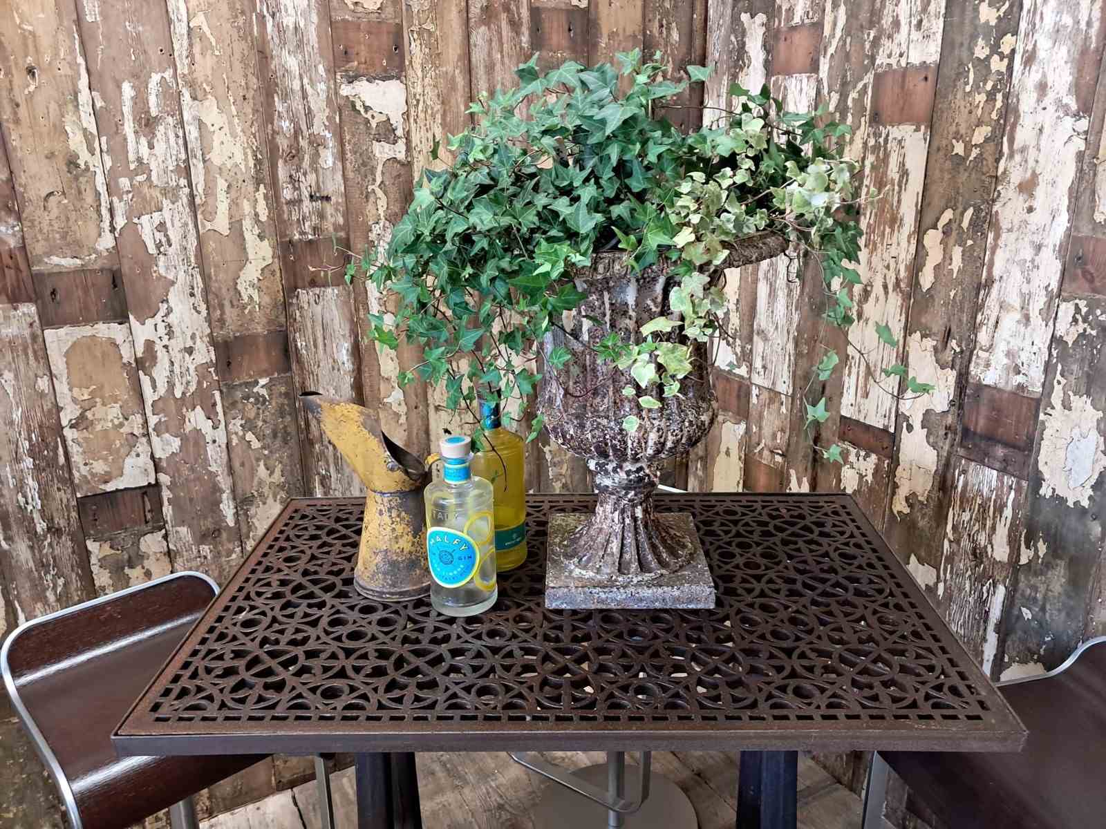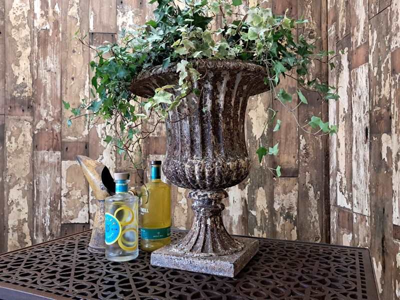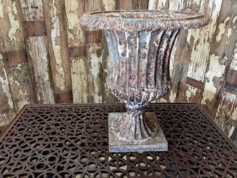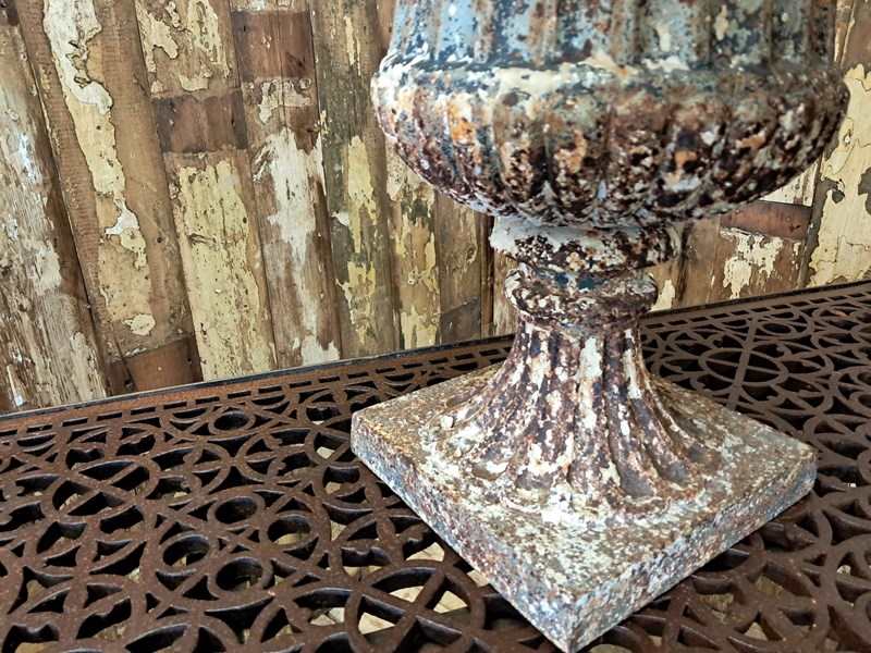 A beautiful weathered French cast iron urn of the Neoclassical style.