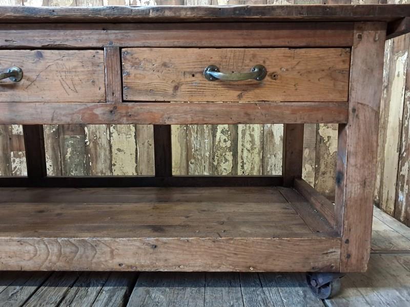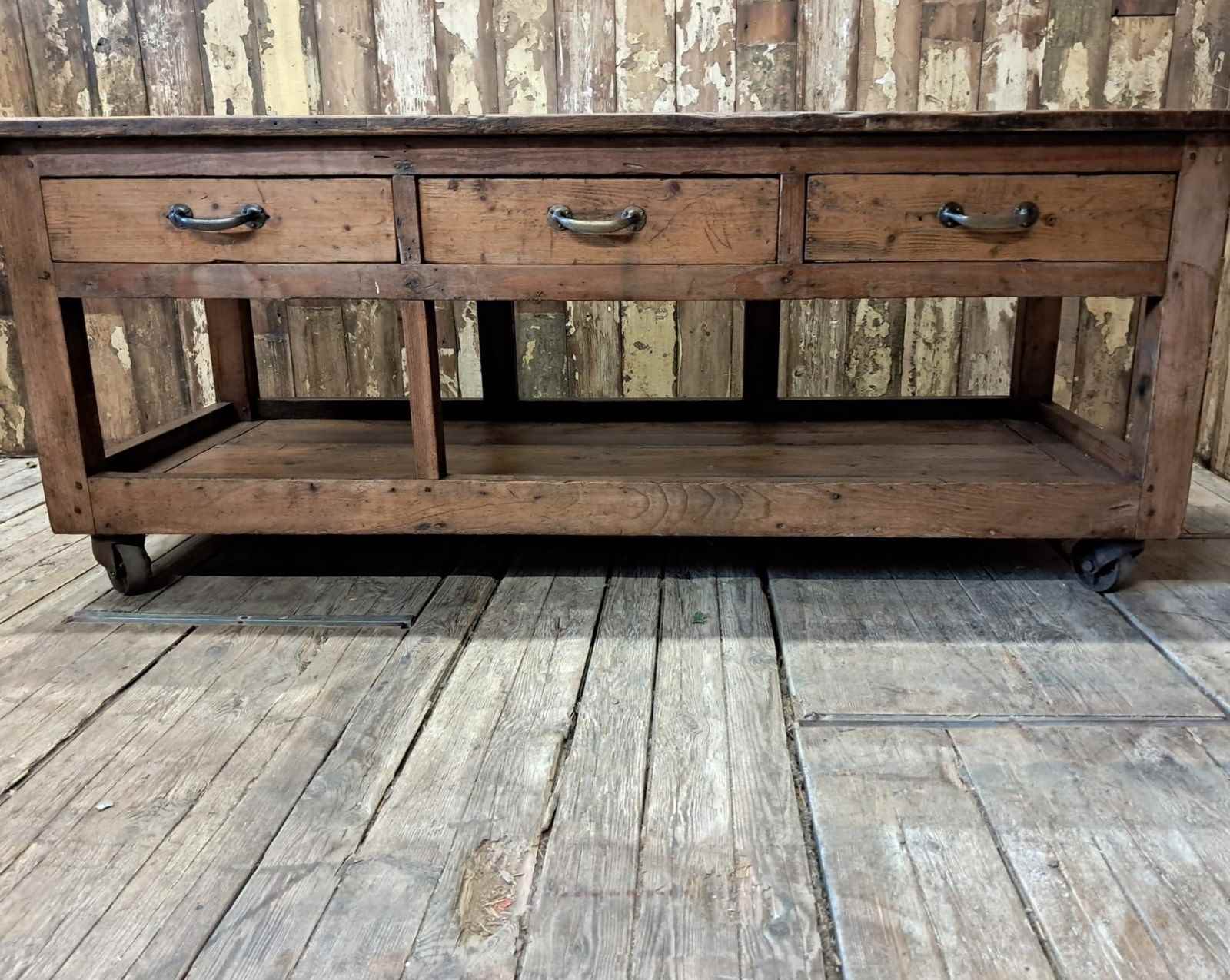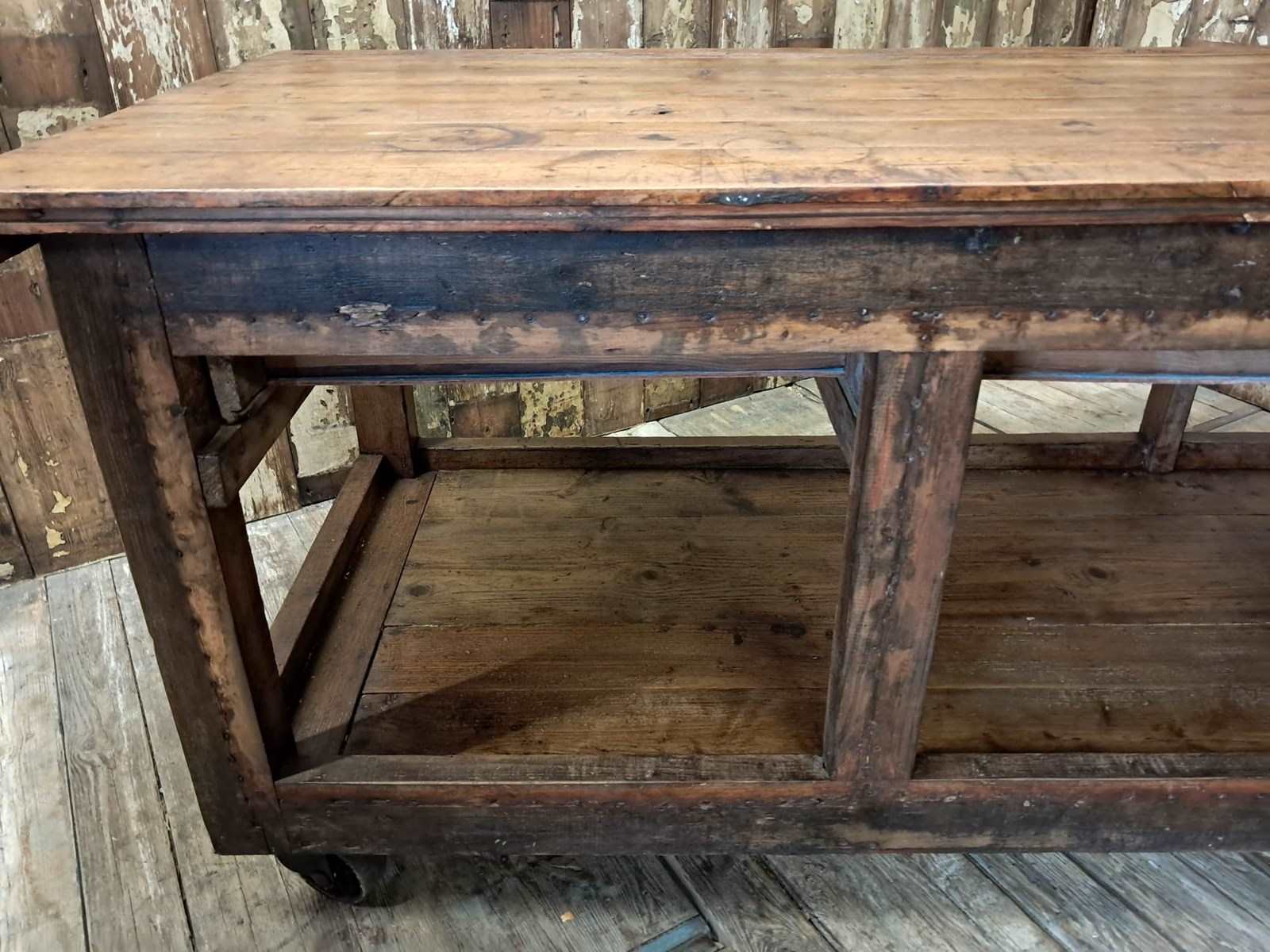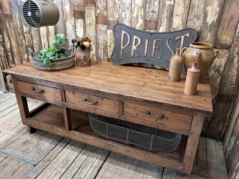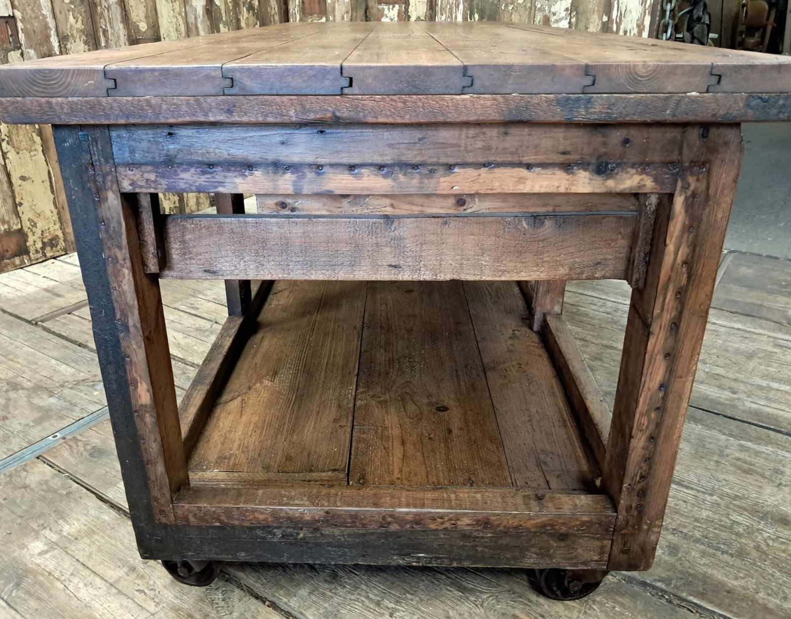 A basic design and build with rough edges, wear and tear marks making it an ideal kitchen island or console table in its authentic condition with superb patina and chunky original wheels for ease of movement.