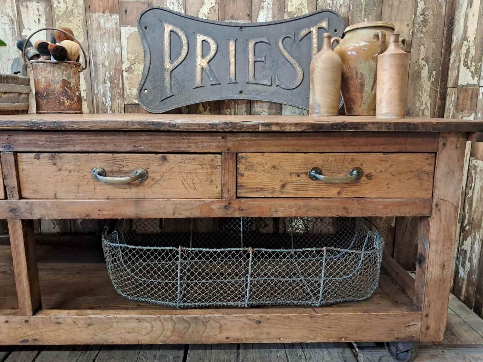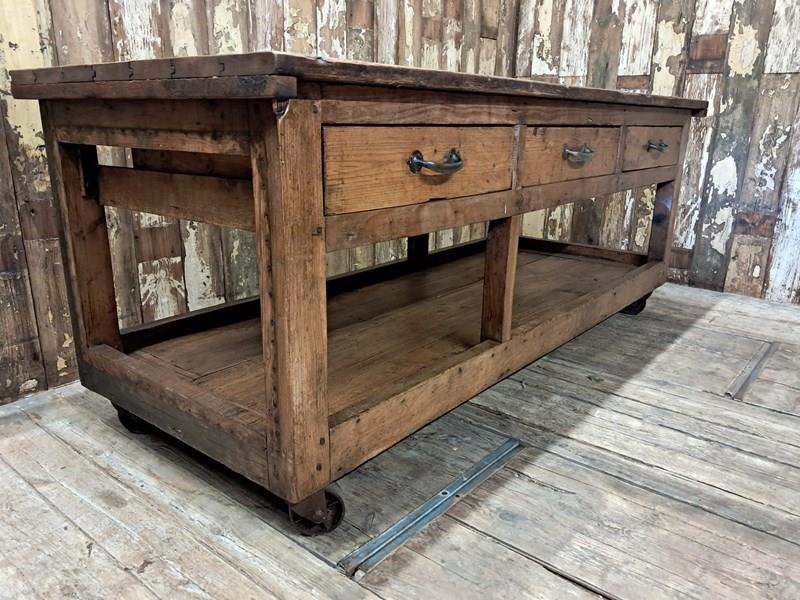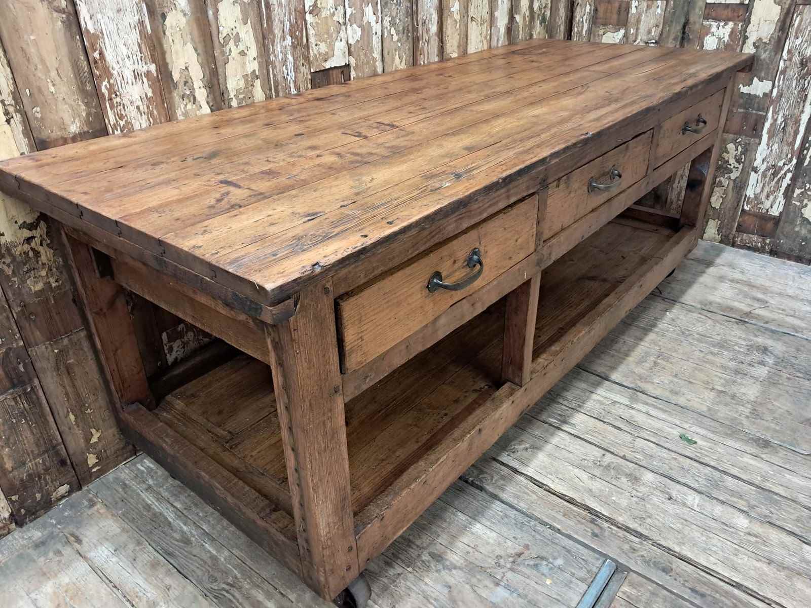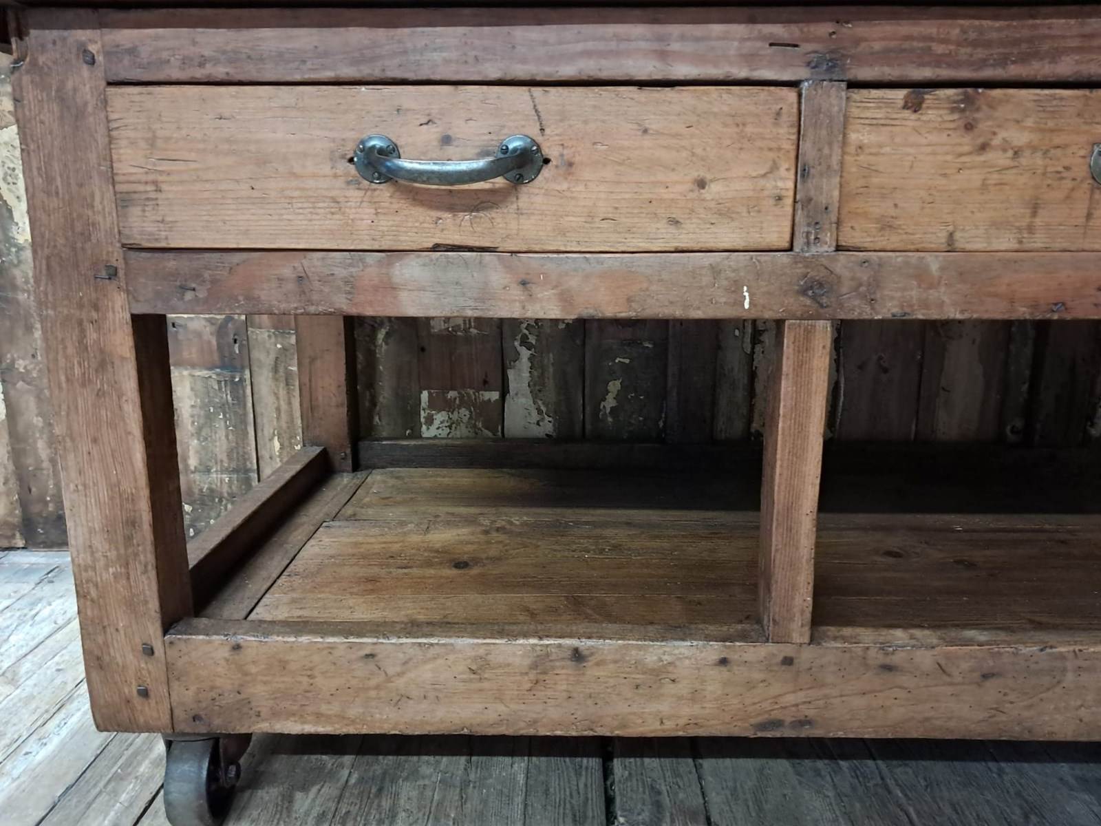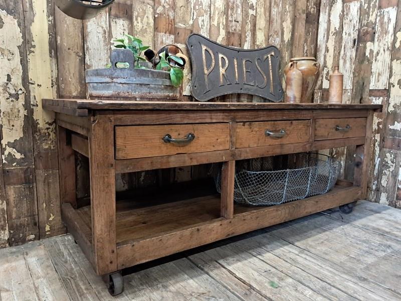 A basic design and build with rough edges, wear and tear marks making it an ideal kitchen island or console table in its authentic condition with superb patina and chunky original wheels for ease of movement.