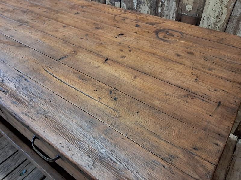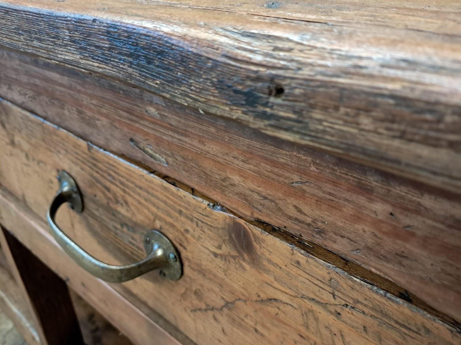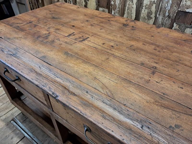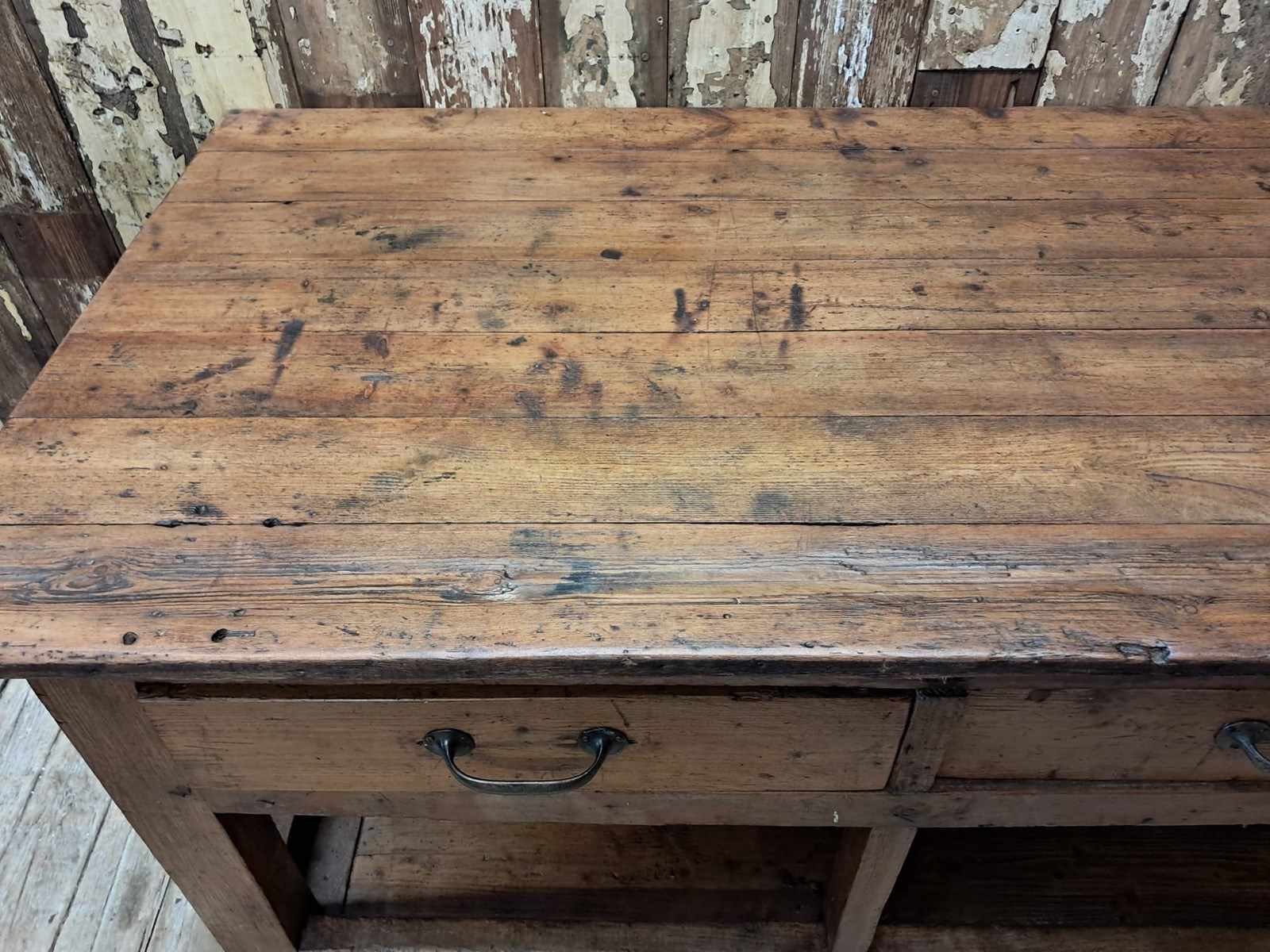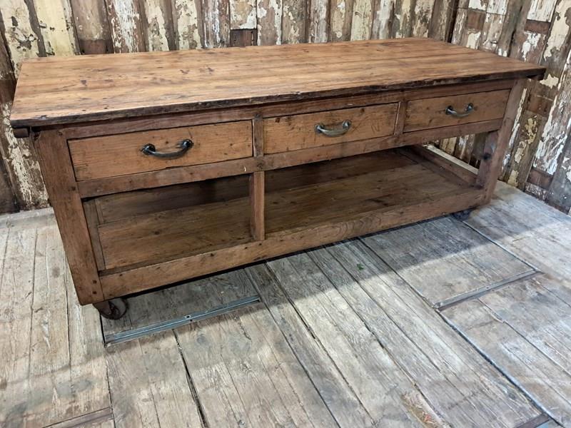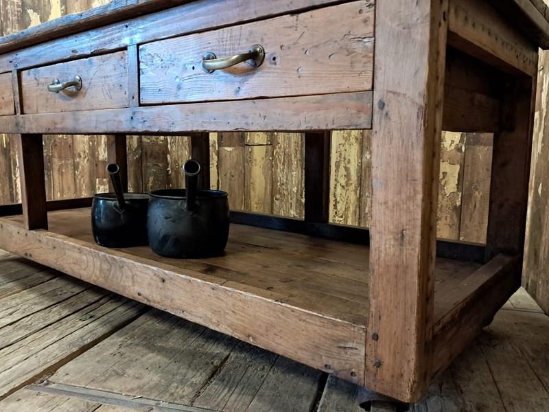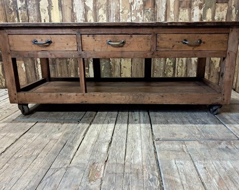 A basic design and build with rough edges, wear and tear marks making it an ideal kitchen island or console table in its authentic condition with superb patina and chunky original wheels for ease of movement.