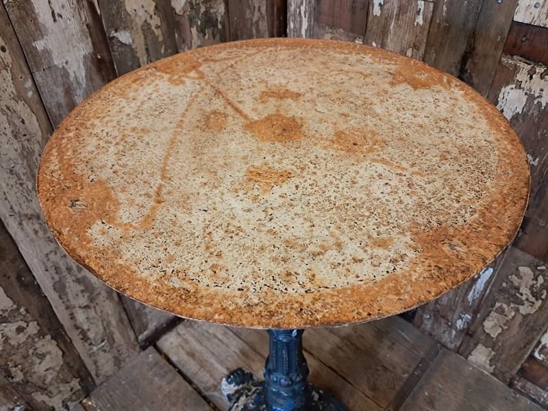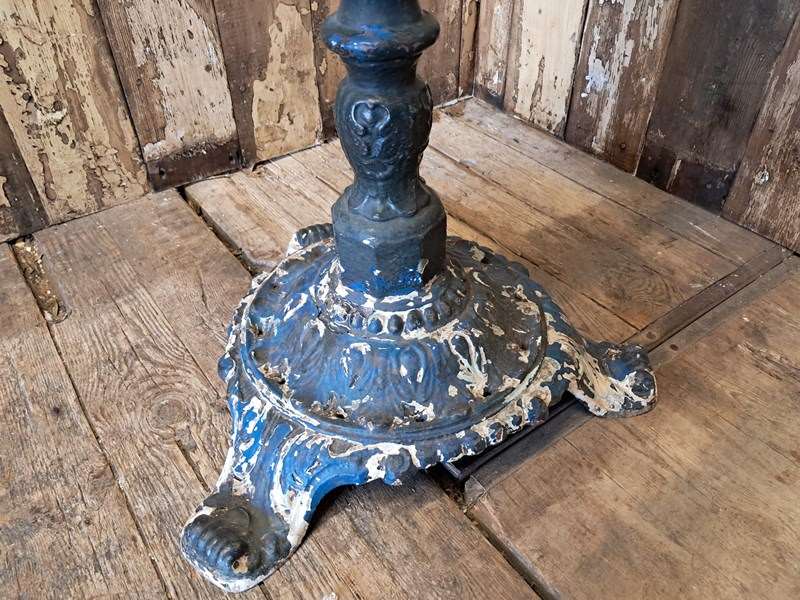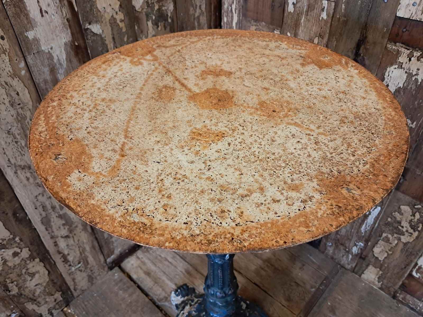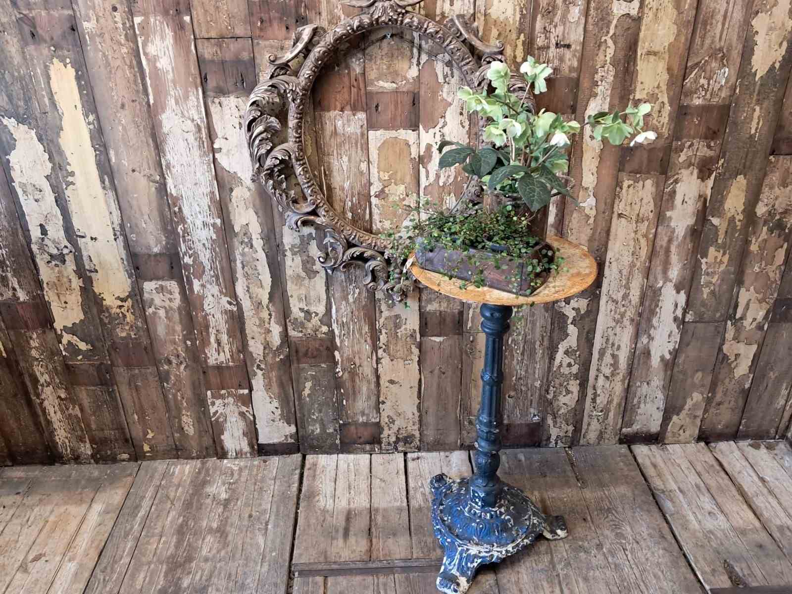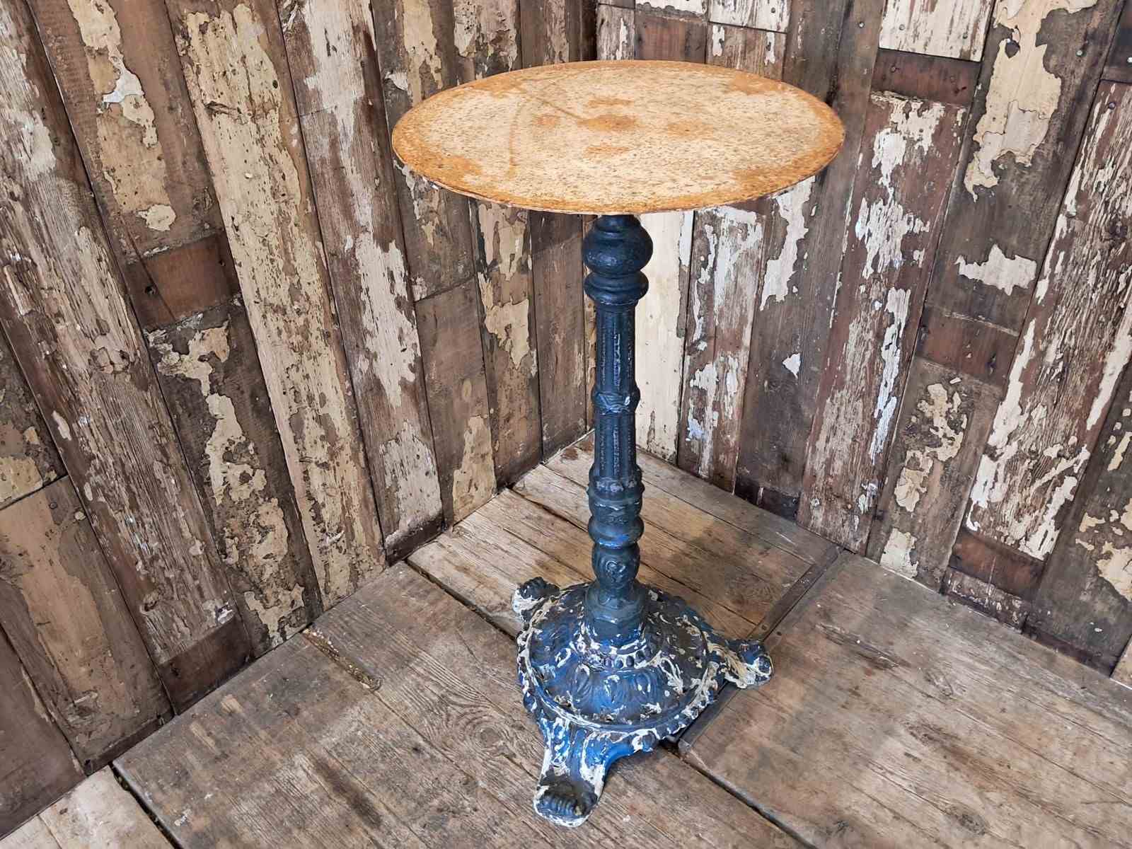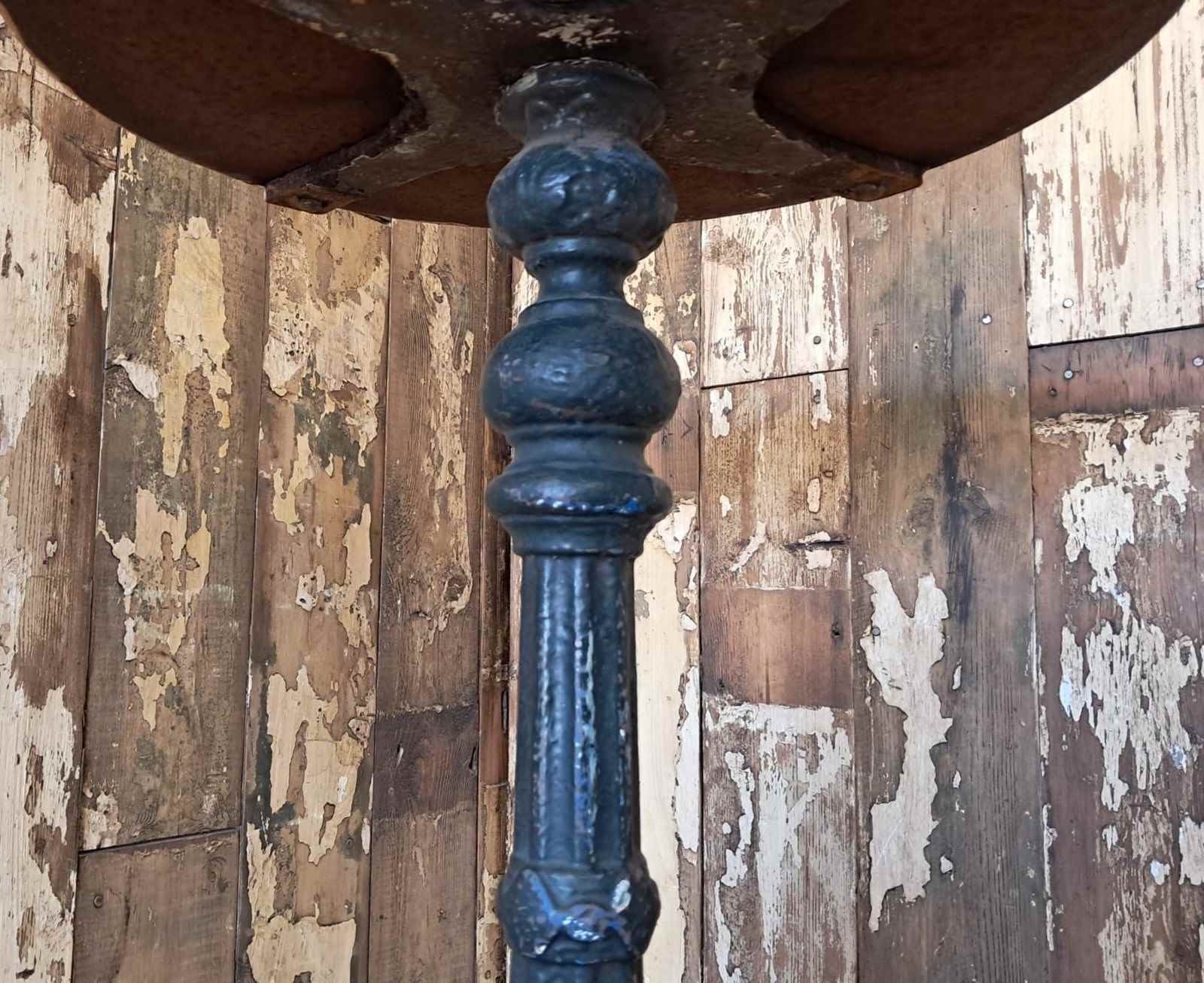 Beautifully detailed ornate cast iron base, in black with a round, cream metal top and perfect naturally rusty patina.