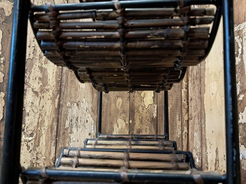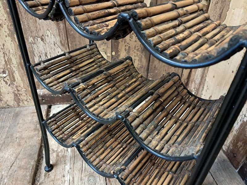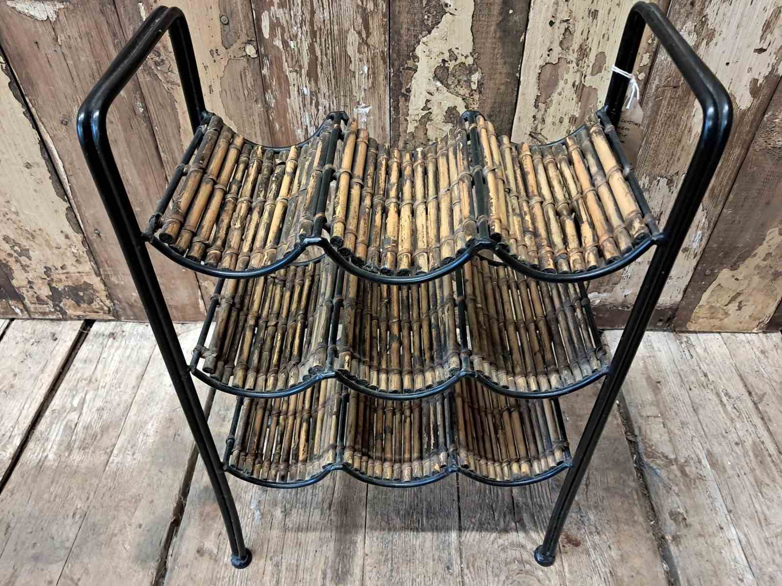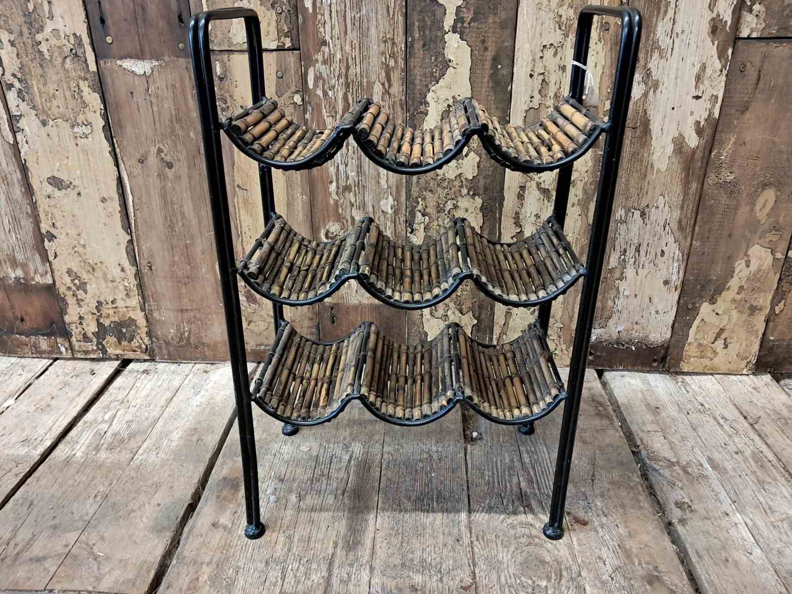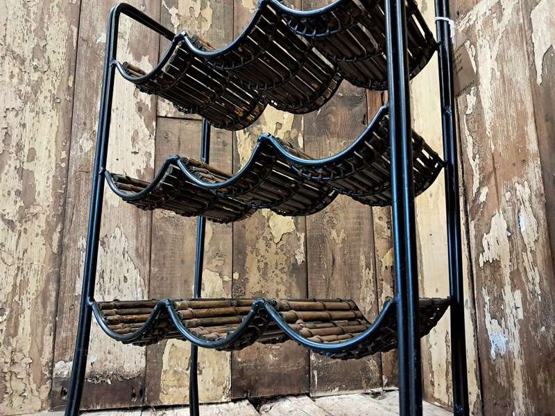 A small 1970’s French bamboo wine rack with sturdy black steel frame and 9 bamboo reed bottle holders.