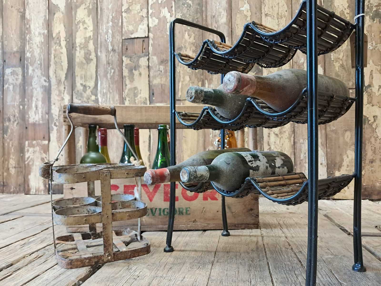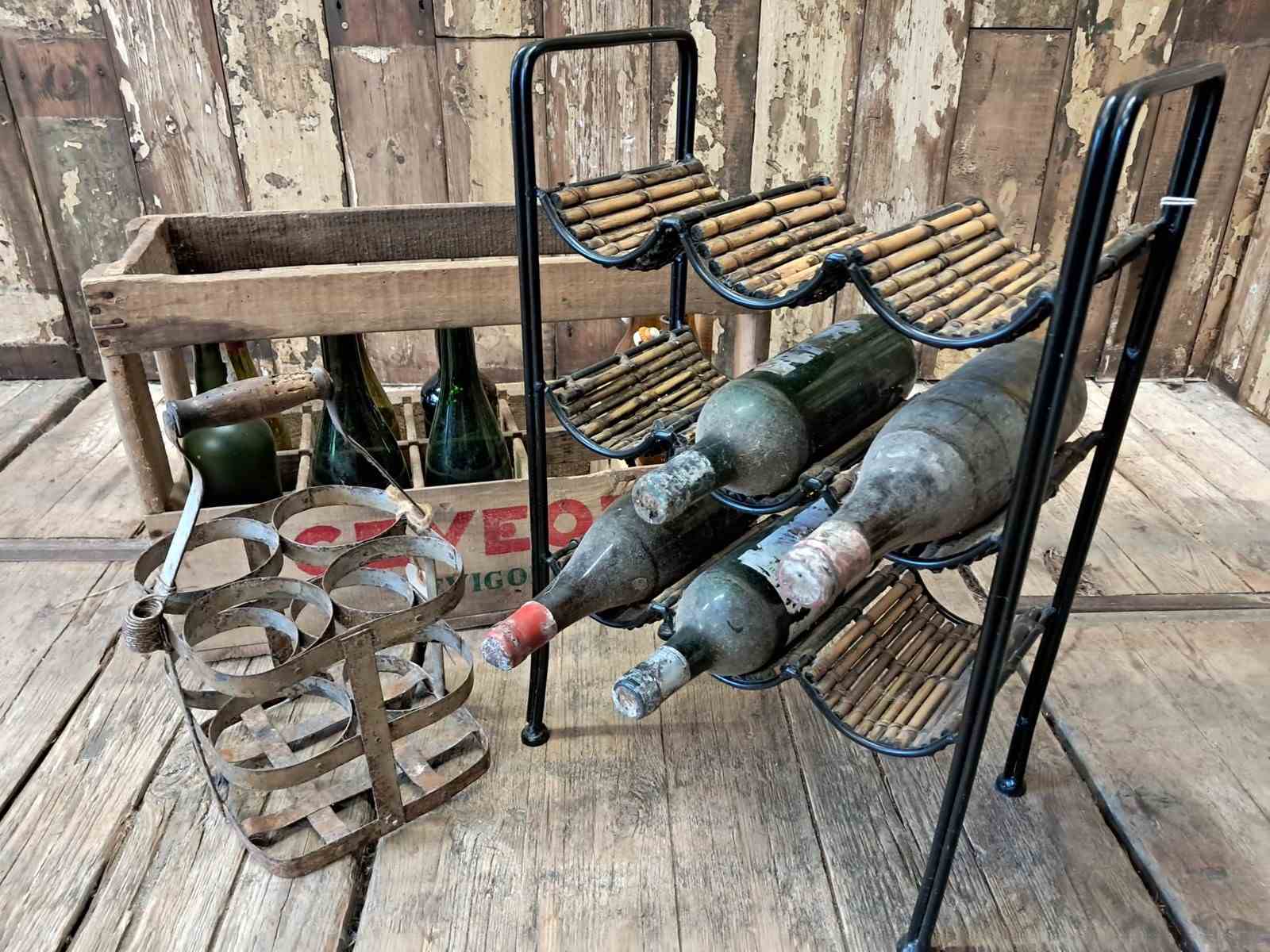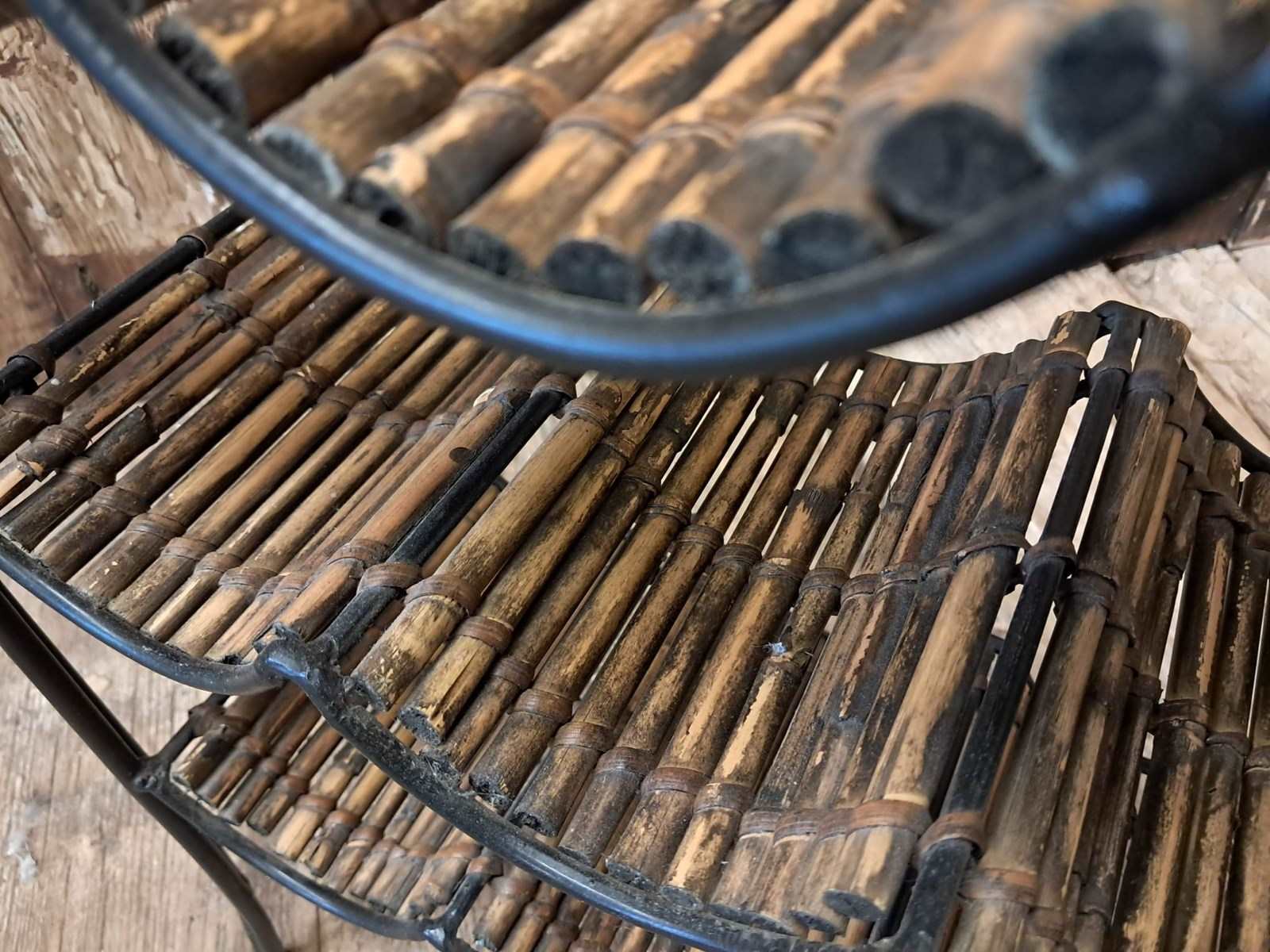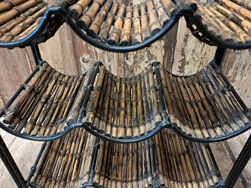 A small 1970’s French bamboo wine rack with sturdy black steel frame and 9 bamboo reed bottle holders.