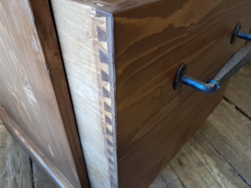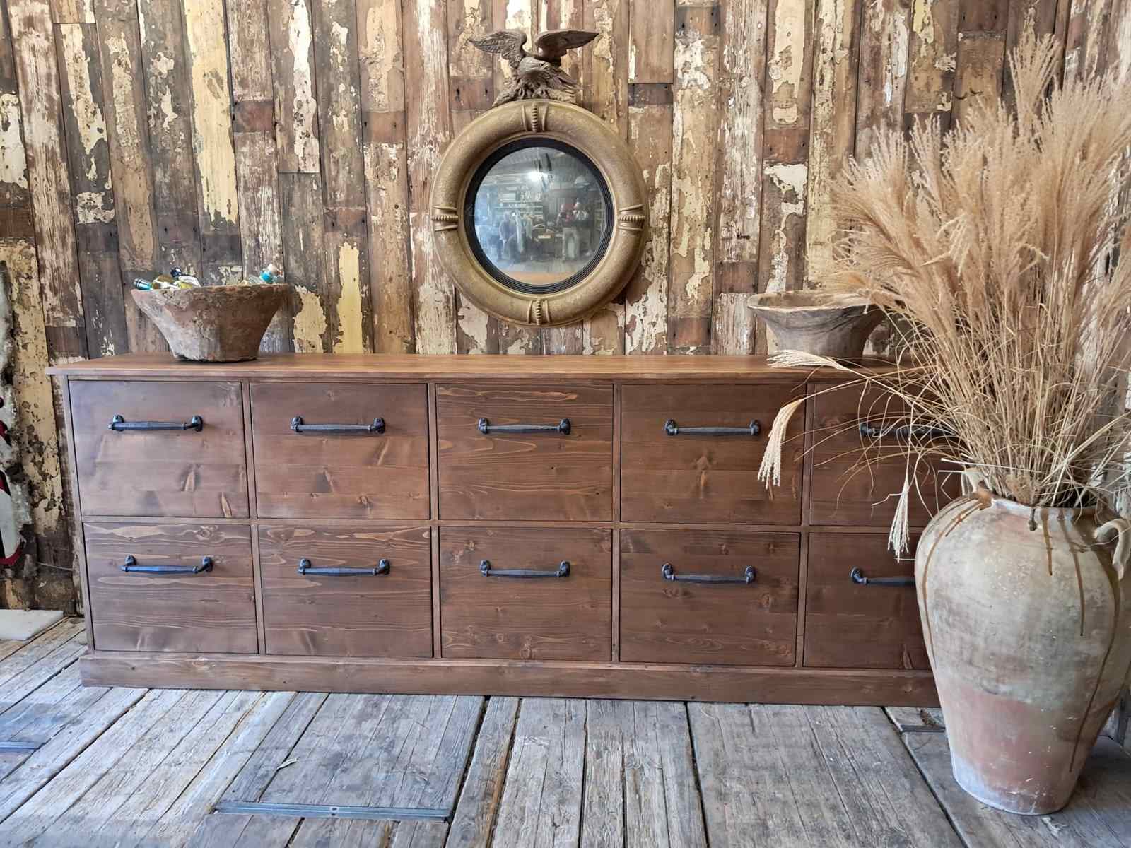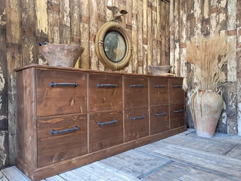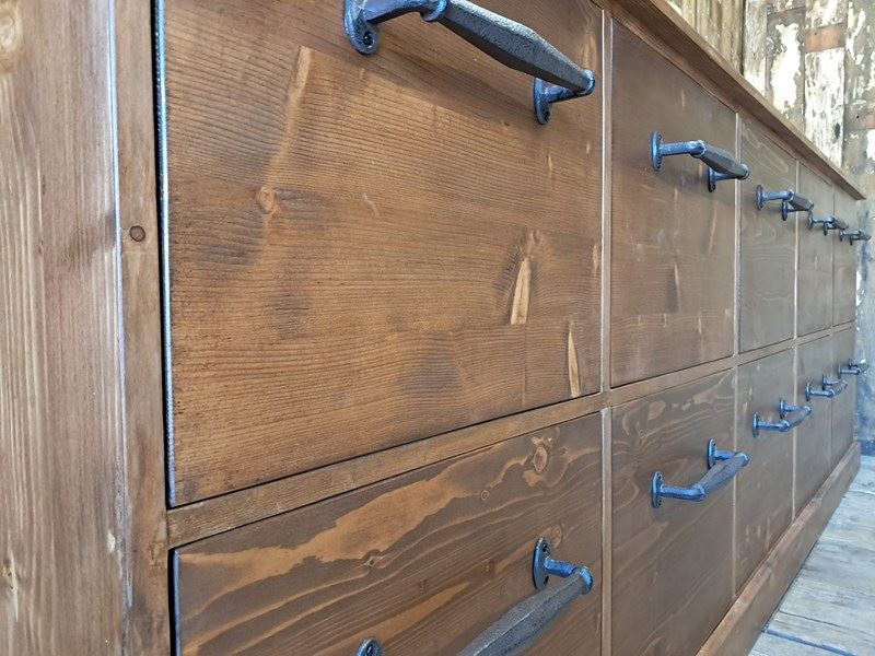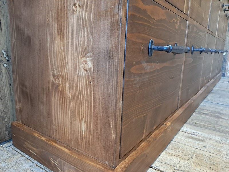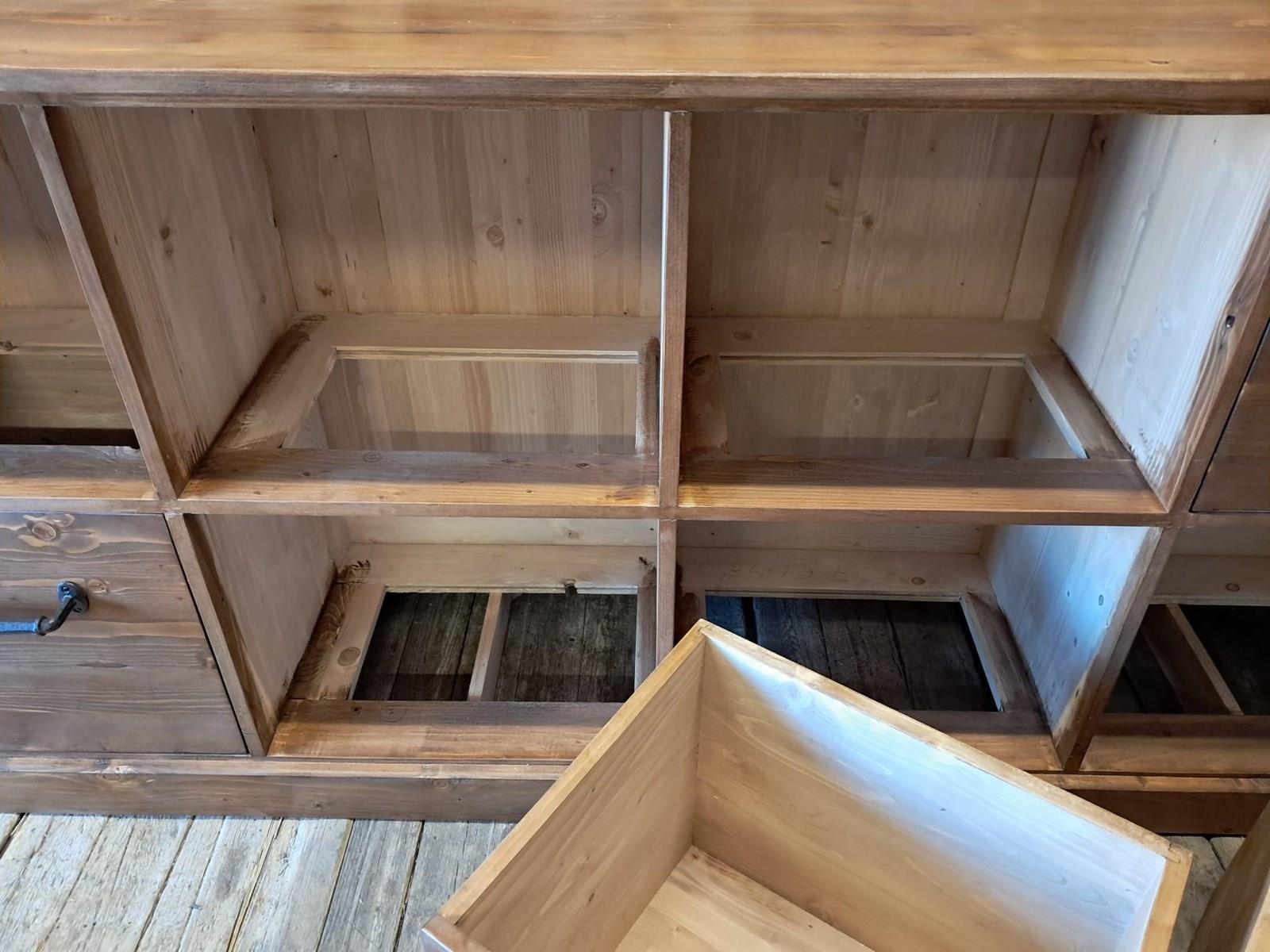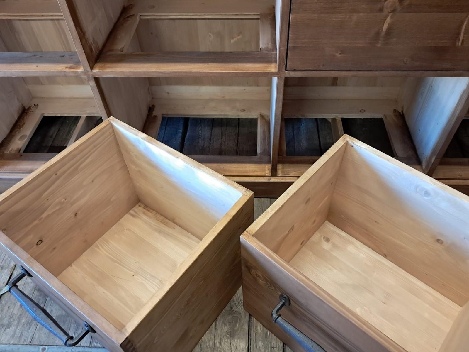 A lovely bank of bespoke draper style pine drawers.