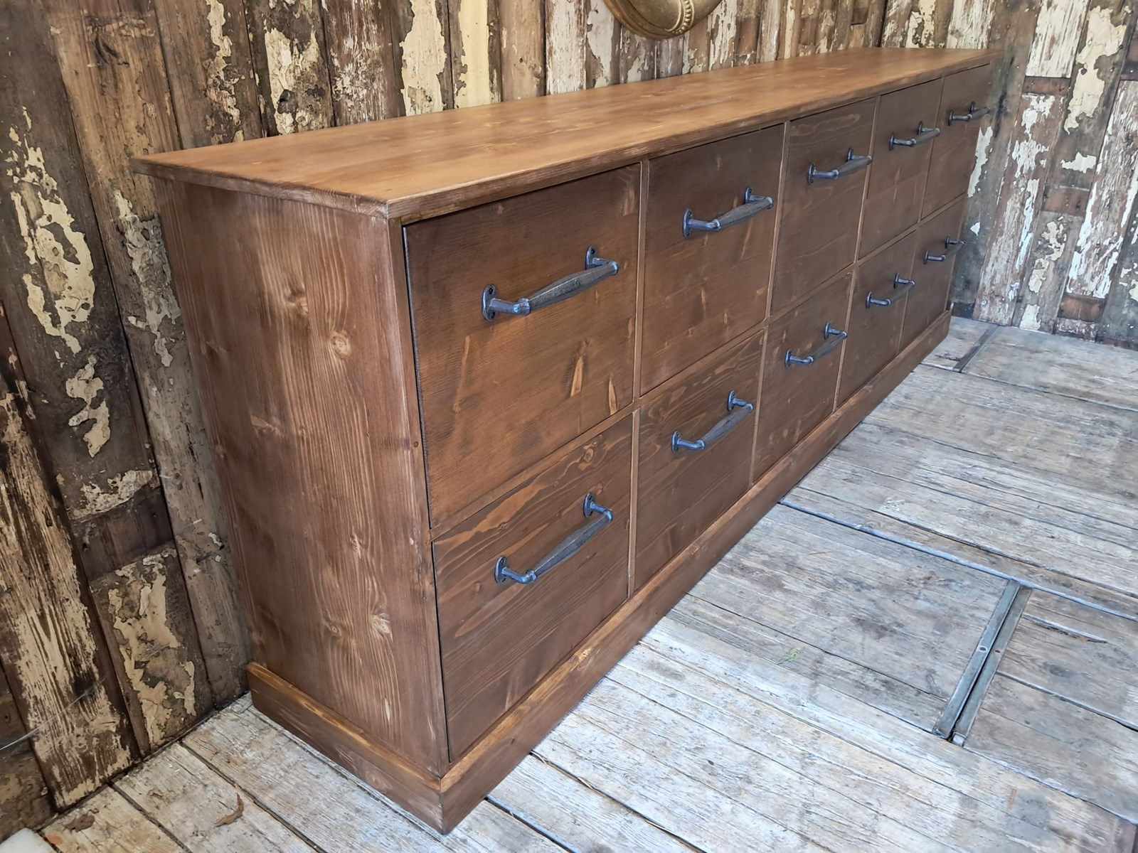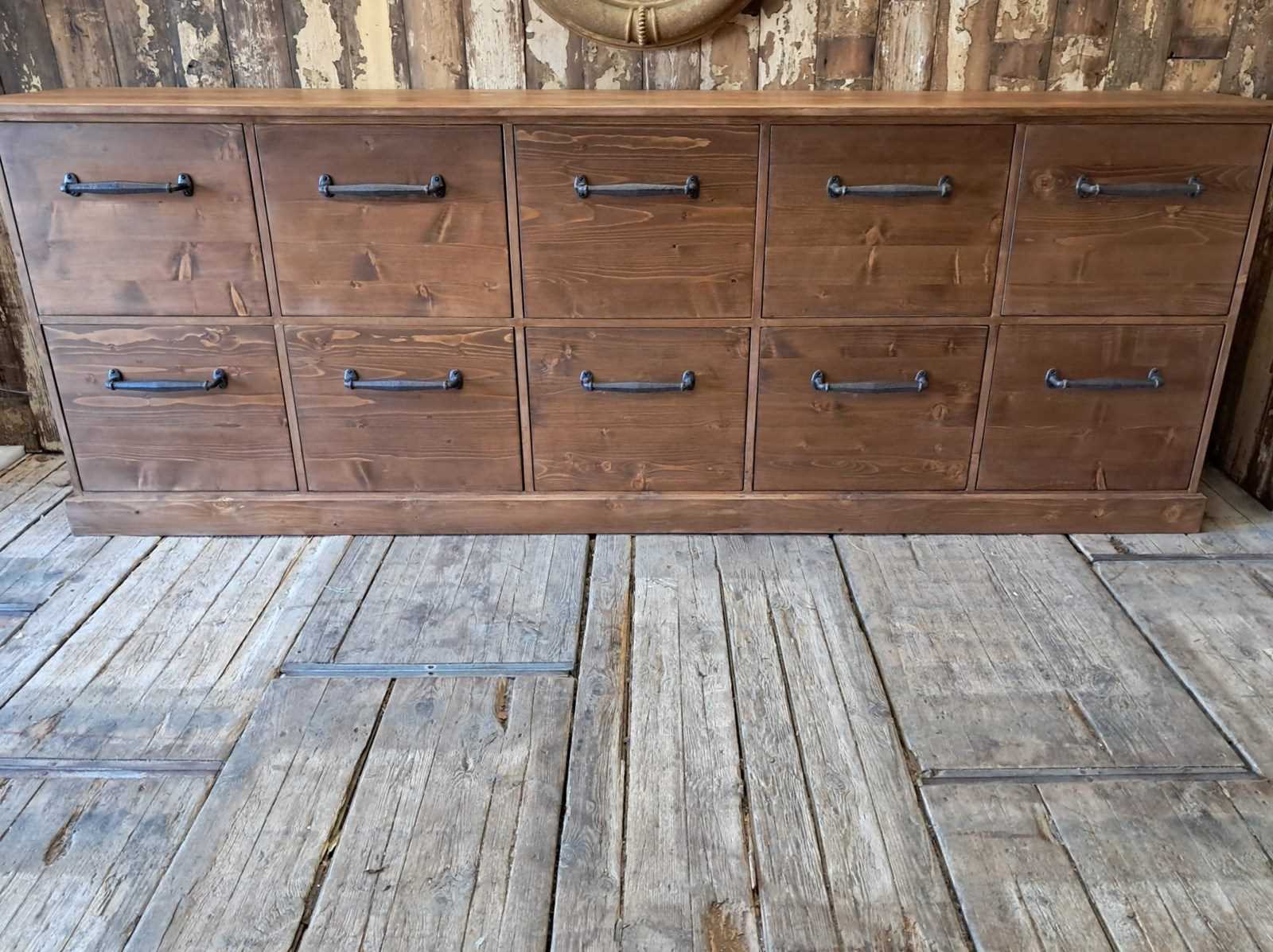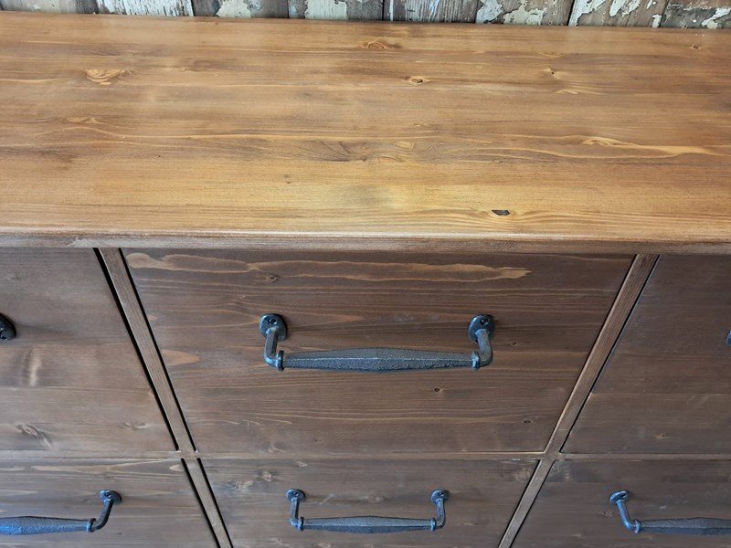 The 10 very deep drawers have simple, decorative iron handles.