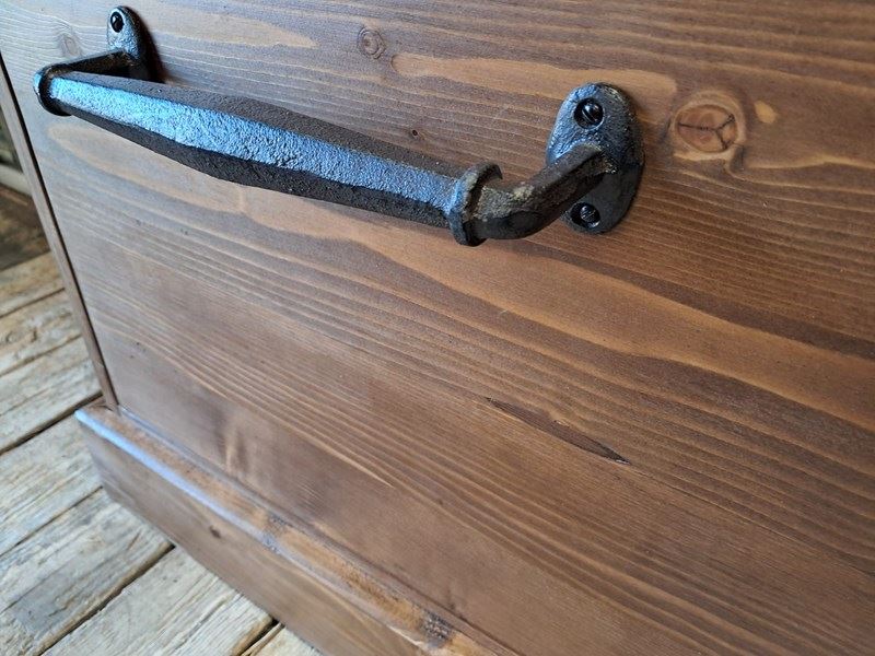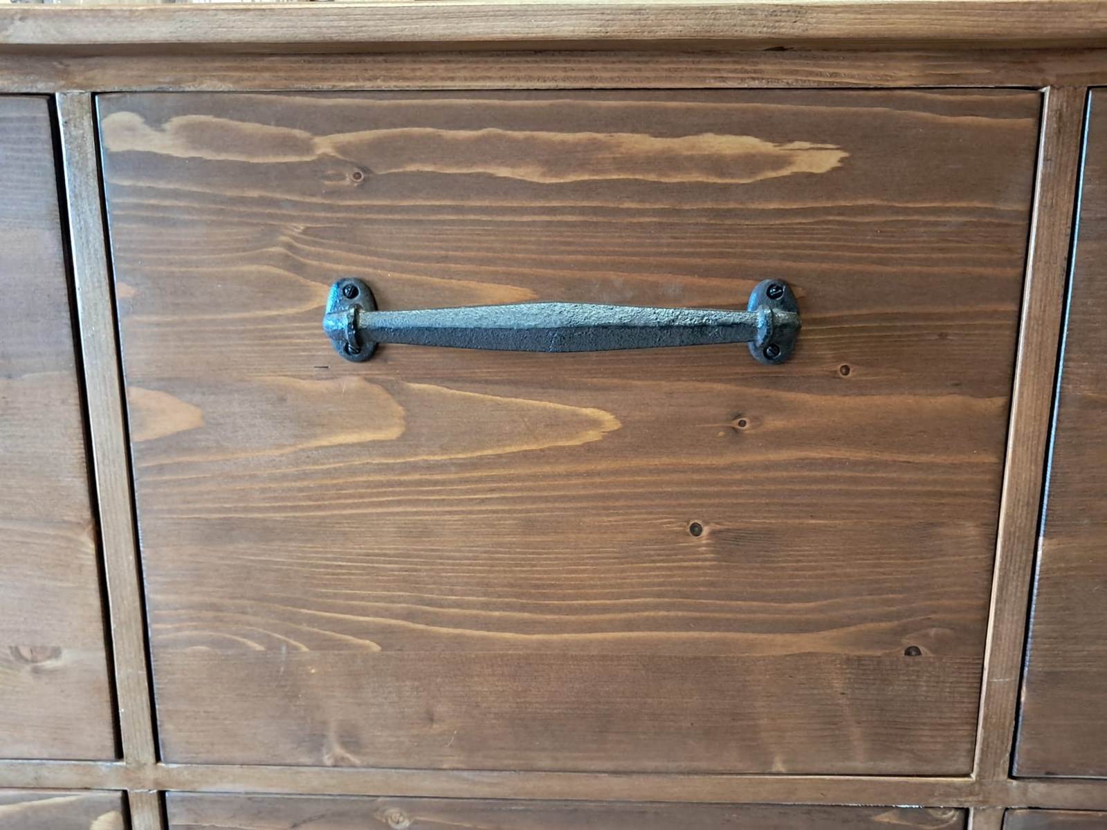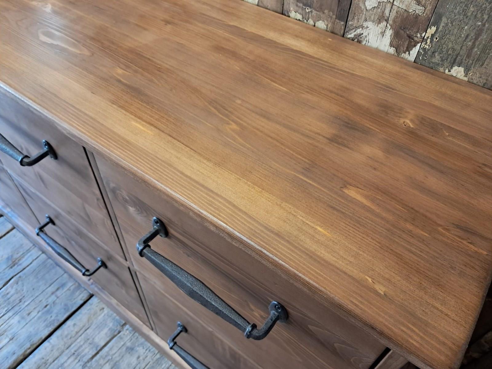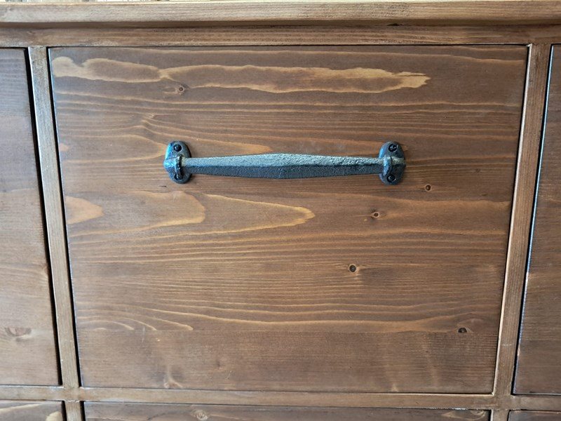 The 10 very deep drawers have simple, decorative iron handles.