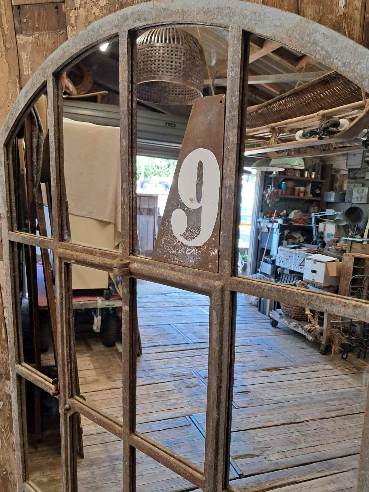 A large arched top cast iron, 16 panel, factory window mirror, circa 1900’s.
