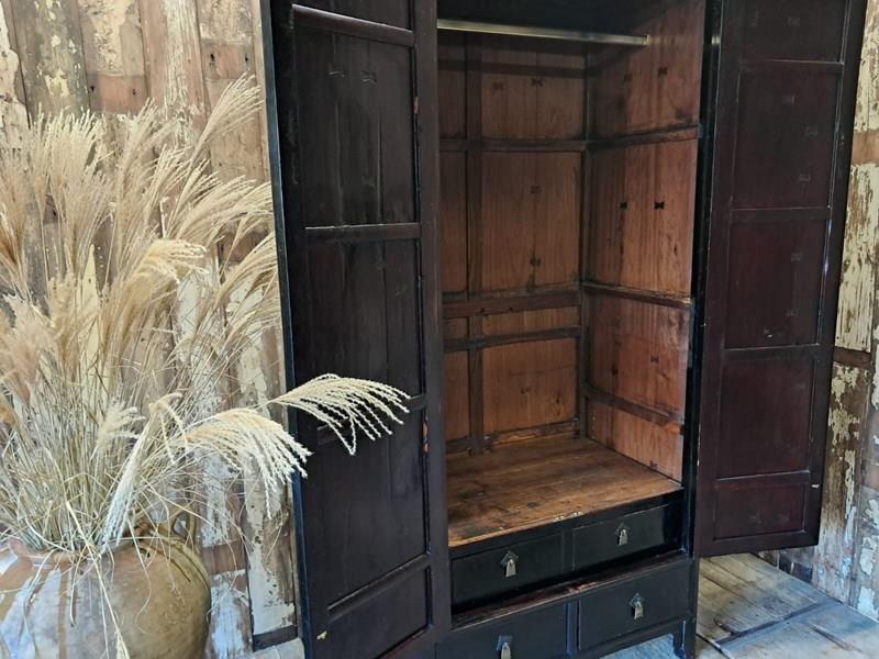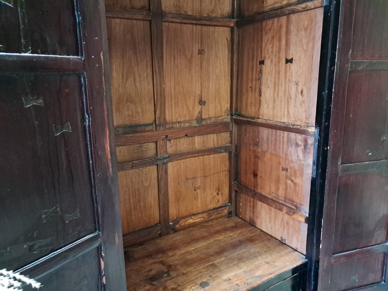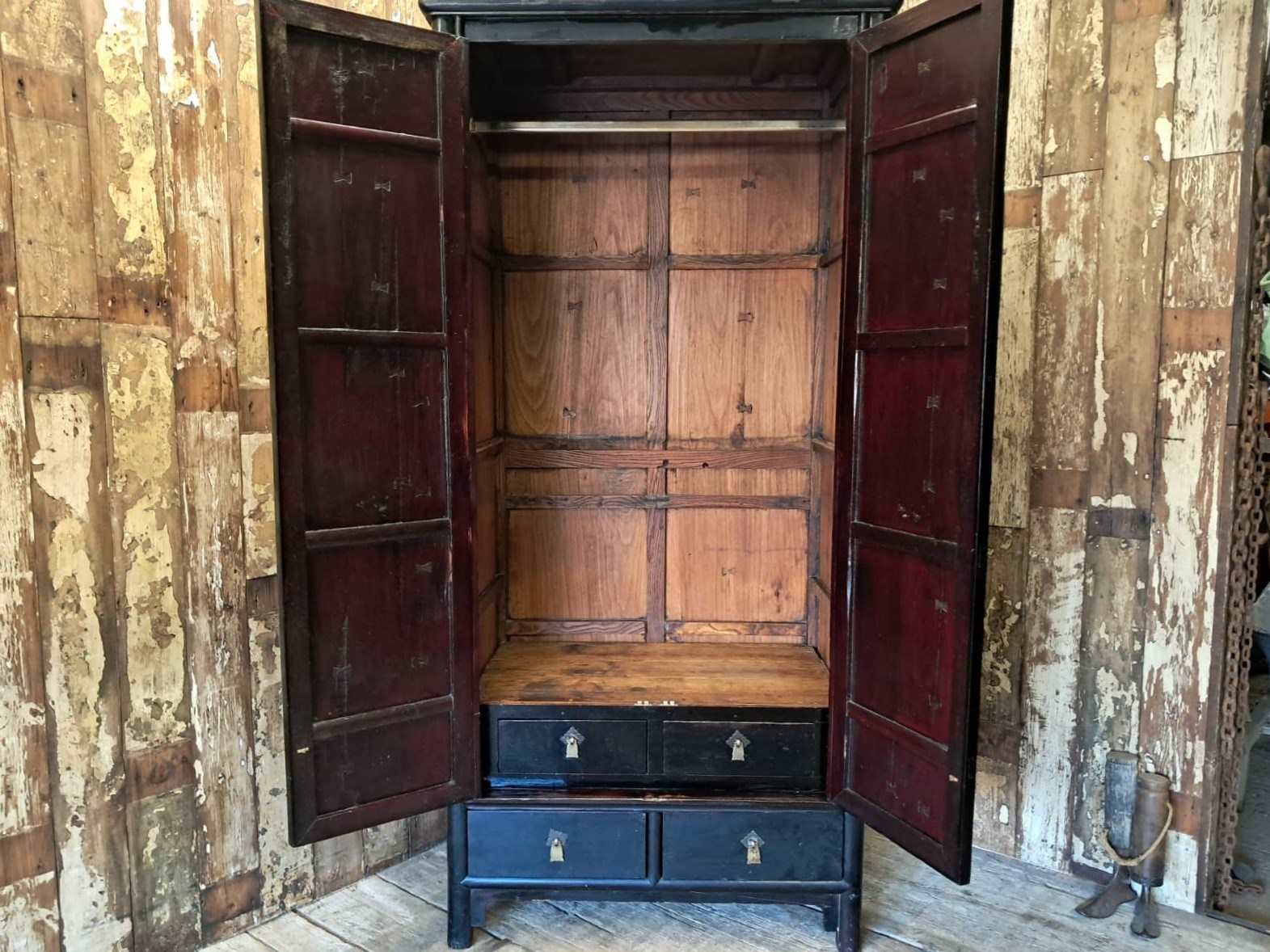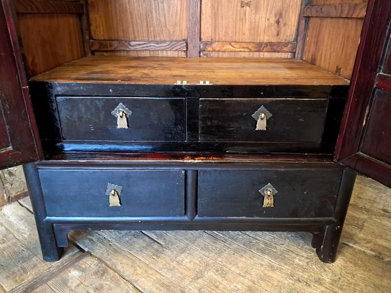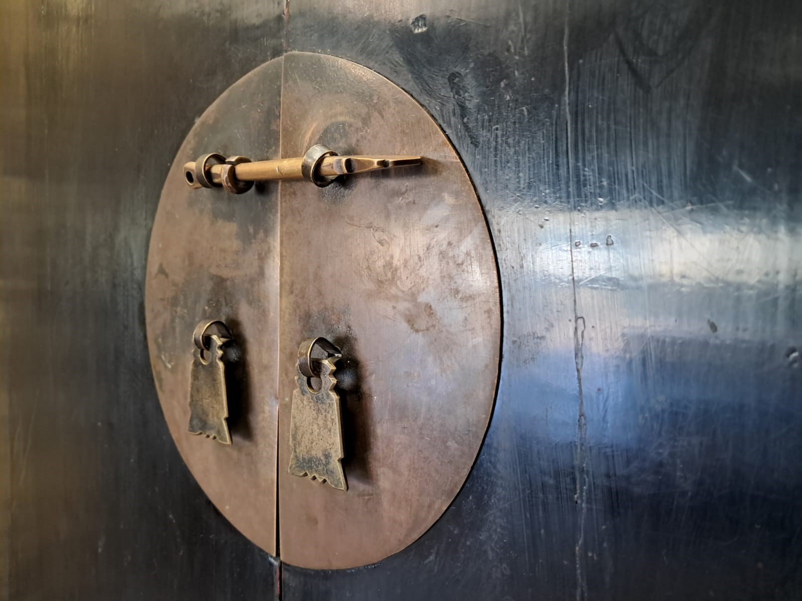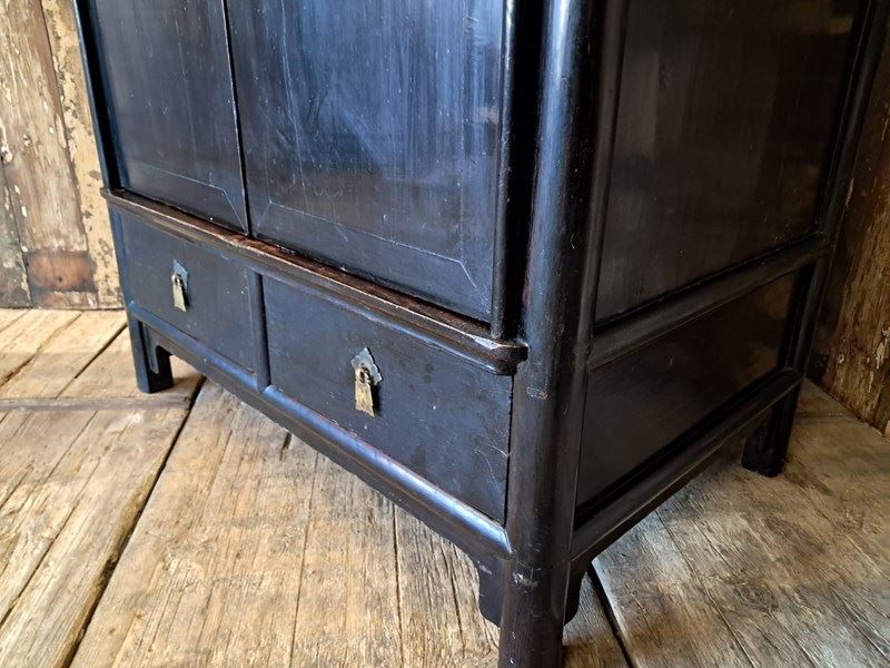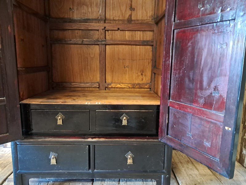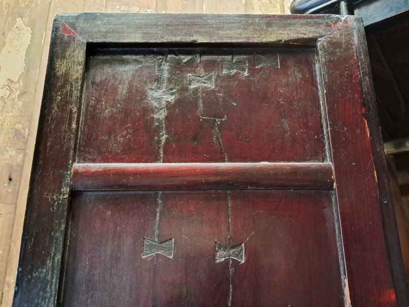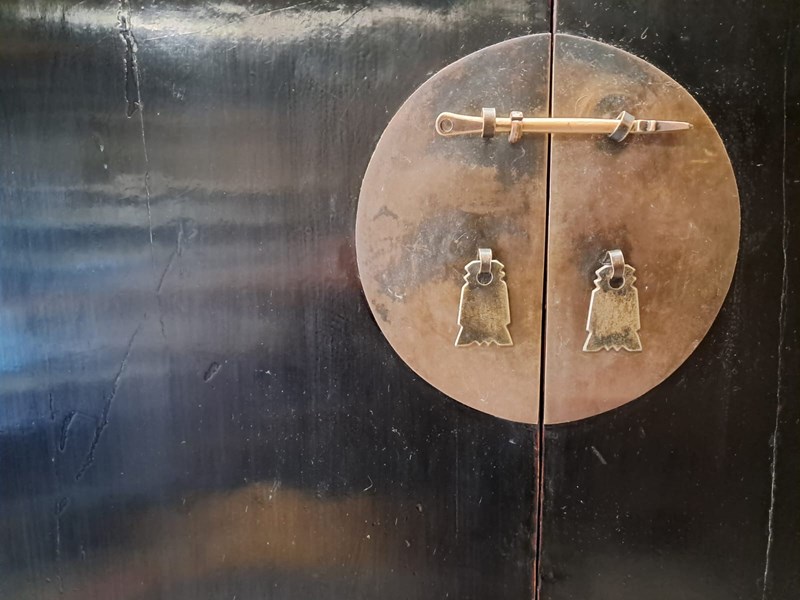 Typical simple box like, square-cornered style, with heavy brass hinges and circular door hardware synonymous with oriental design.