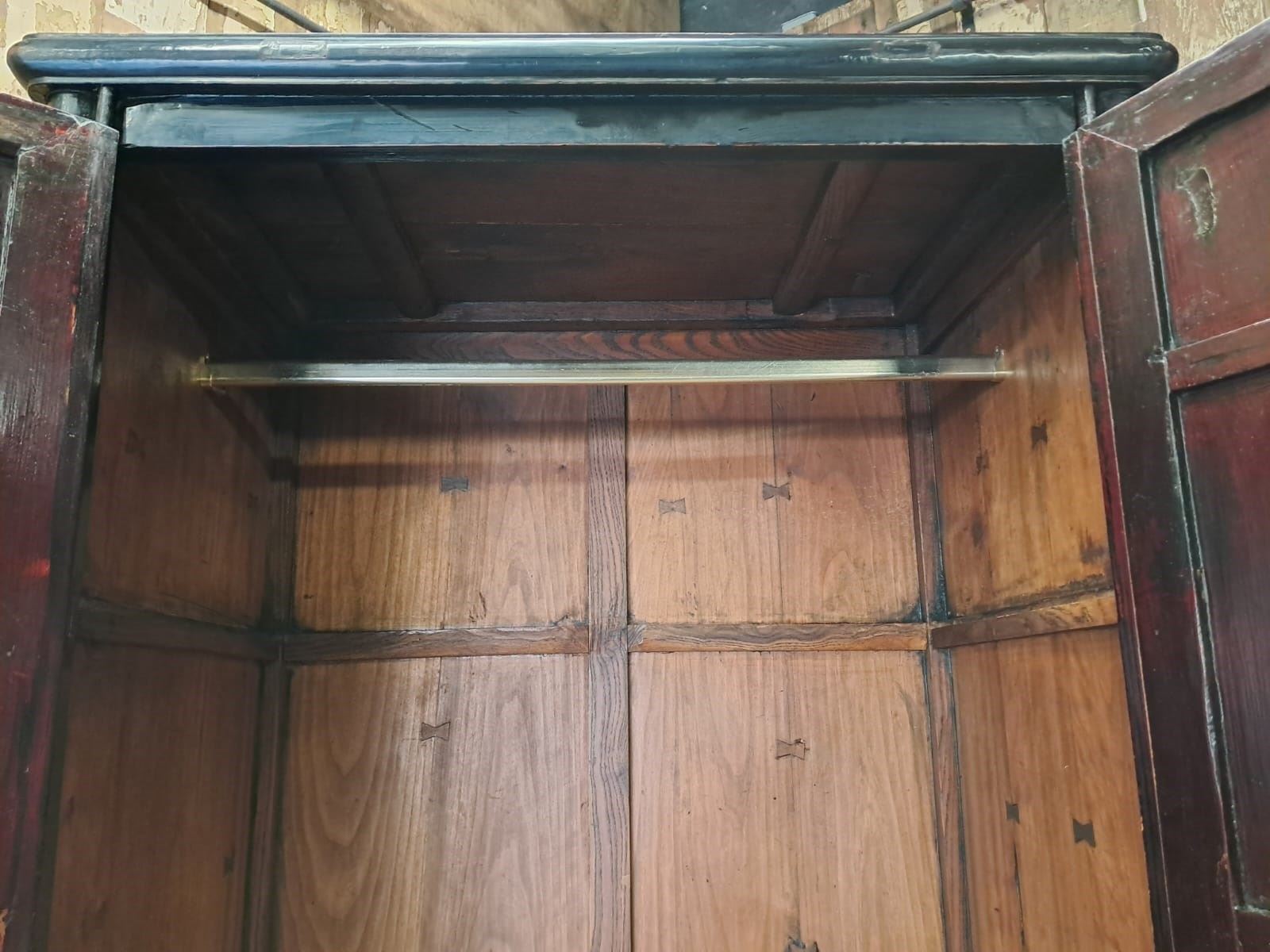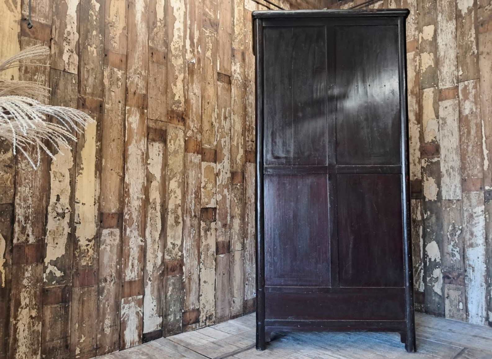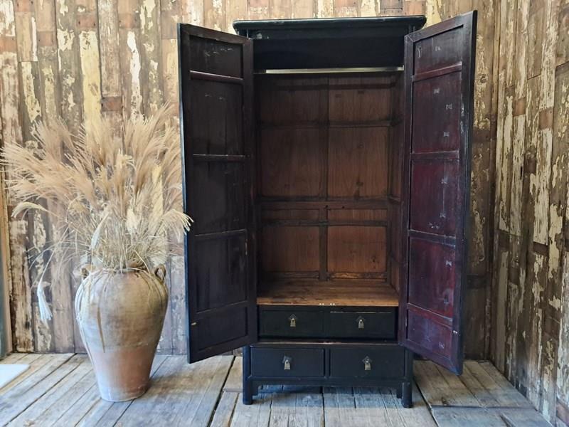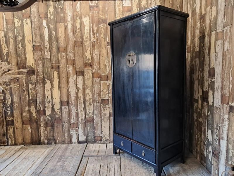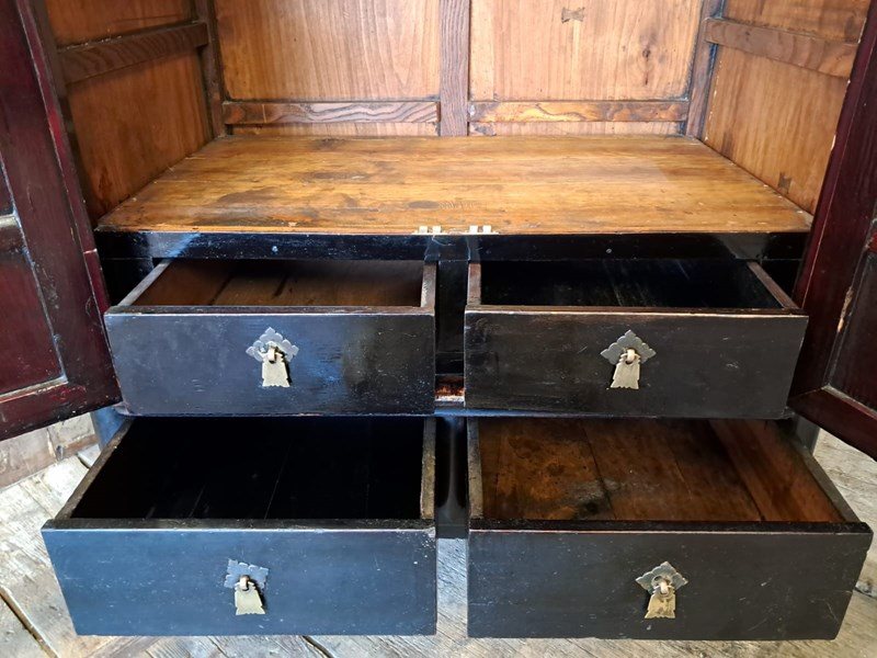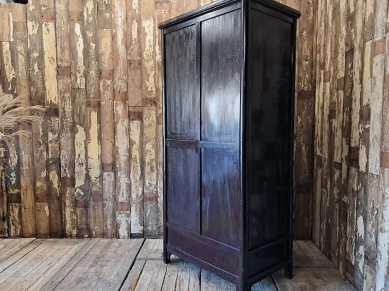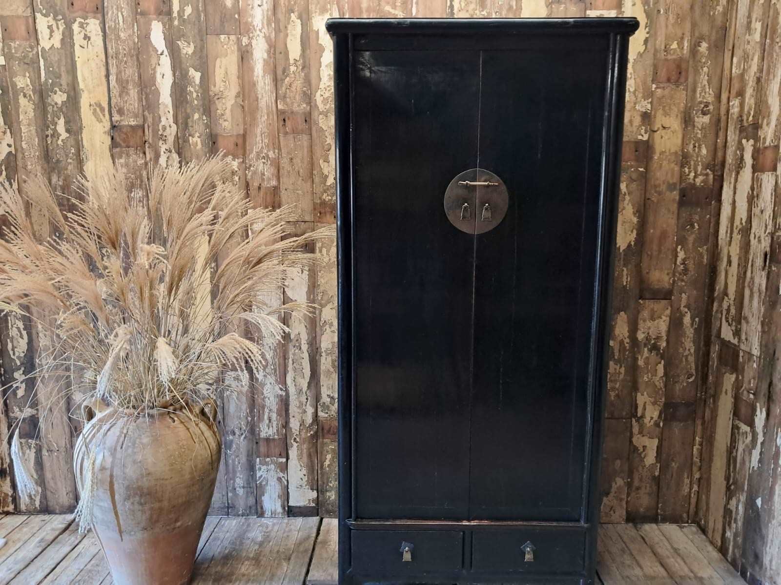 Typical simple box like, square-cornered style, with heavy brass hinges and circular door hardware synonymous with oriental design.