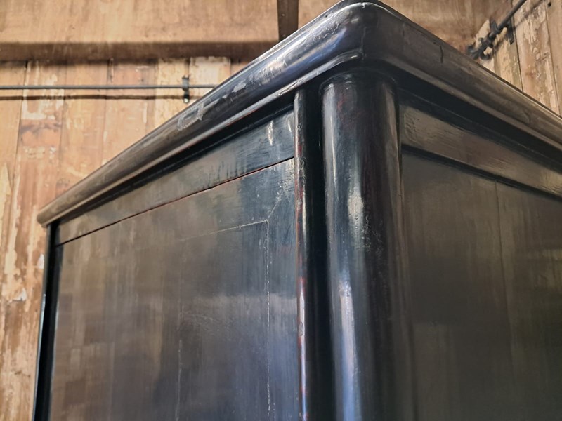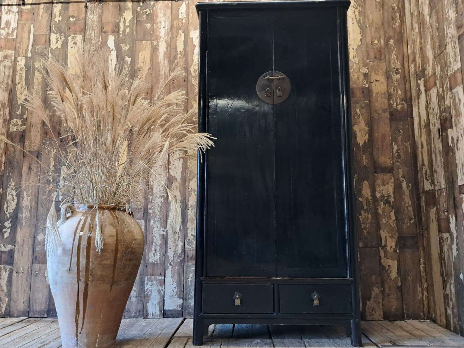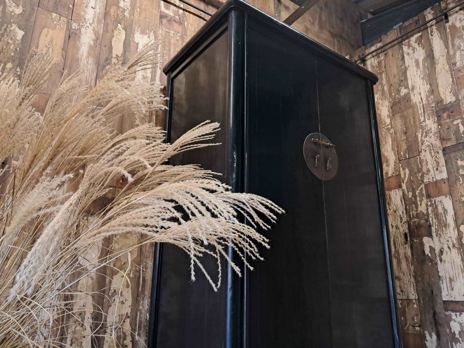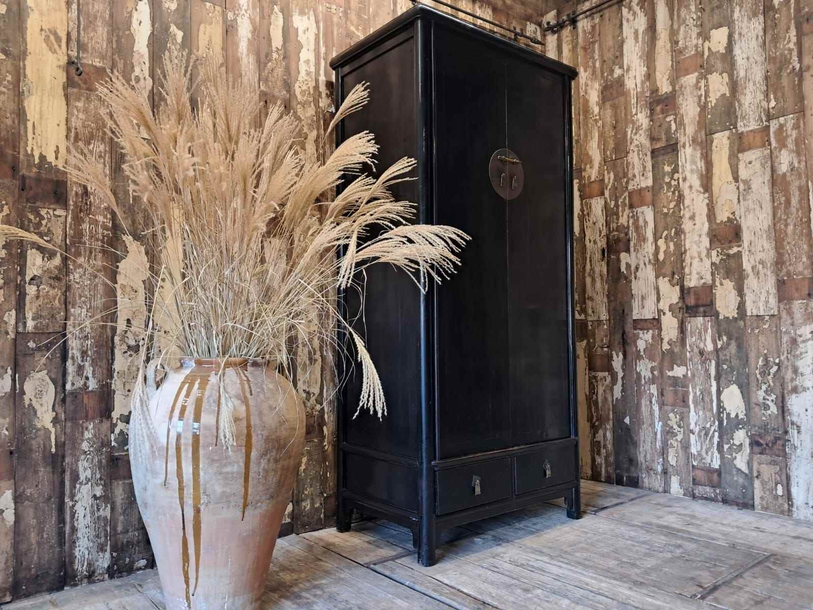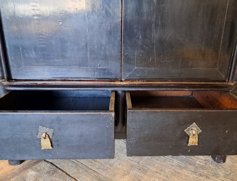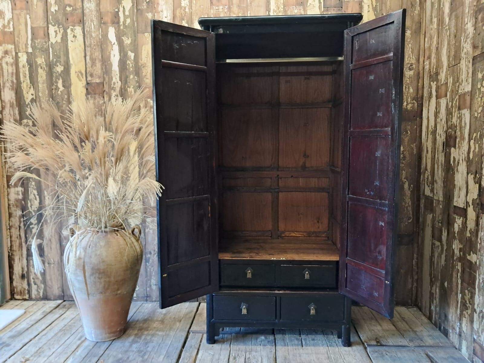 Typical simple box like, square-cornered style, with heavy brass hinges and circular door hardware synonymous with oriental design.