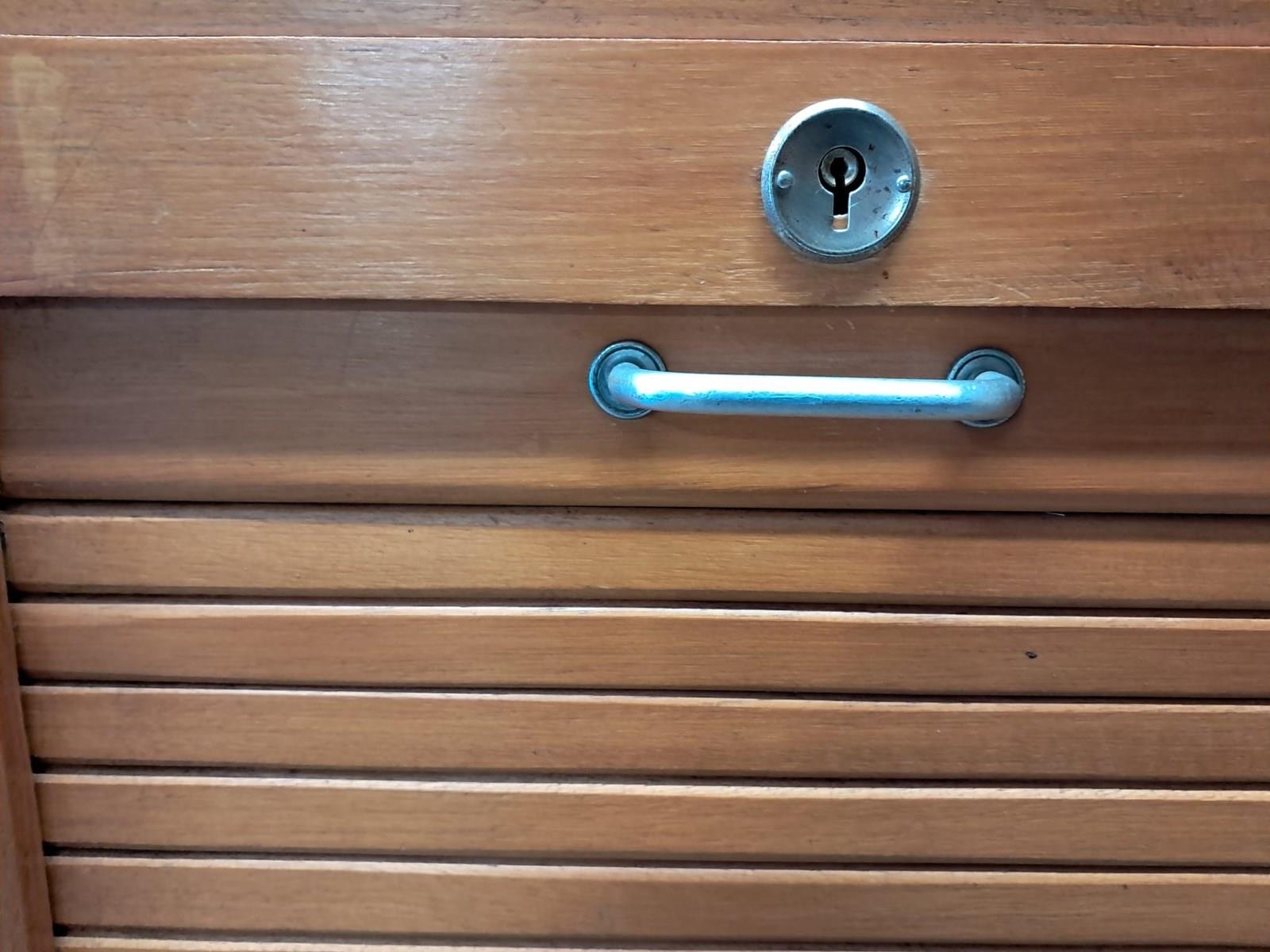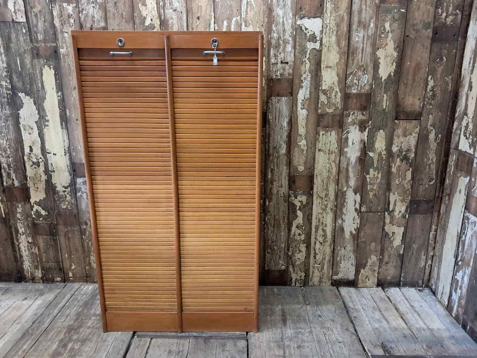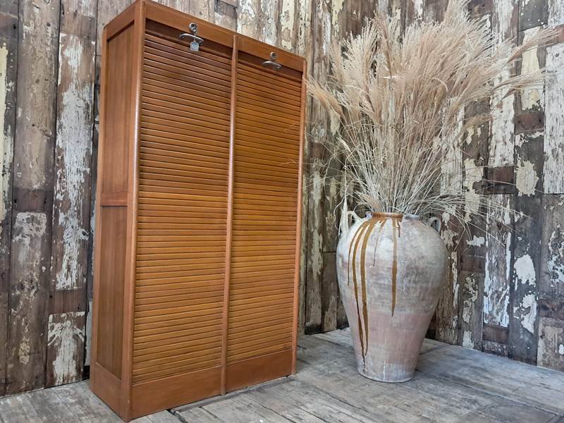 It has original working turn and drop locks and both doors work extremely well – a super storage piece for office or clothes or linens.