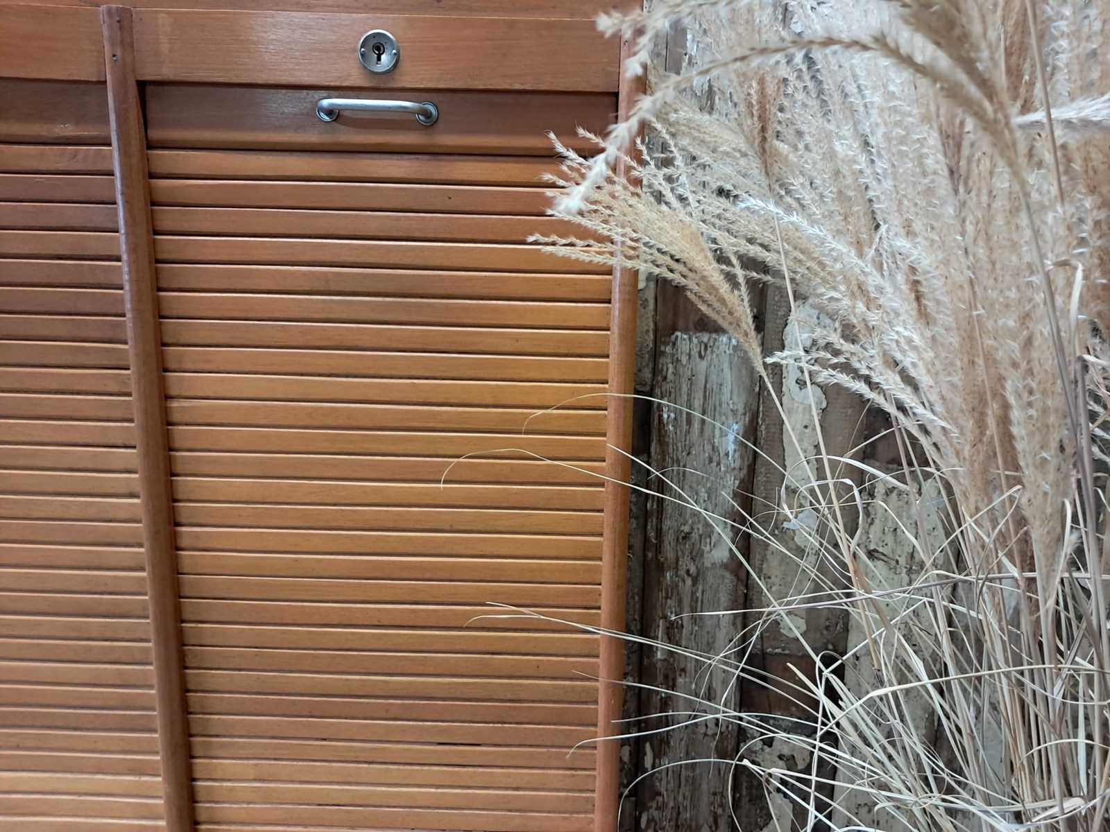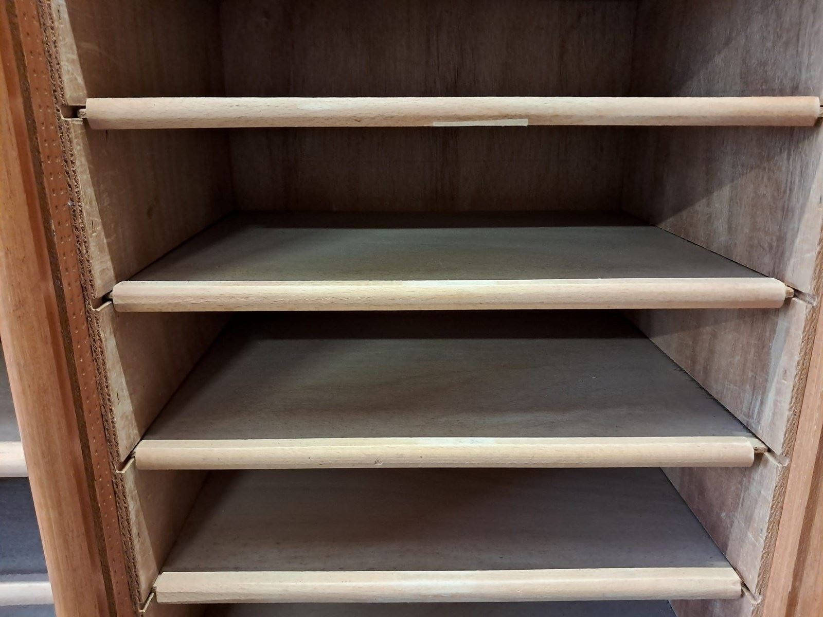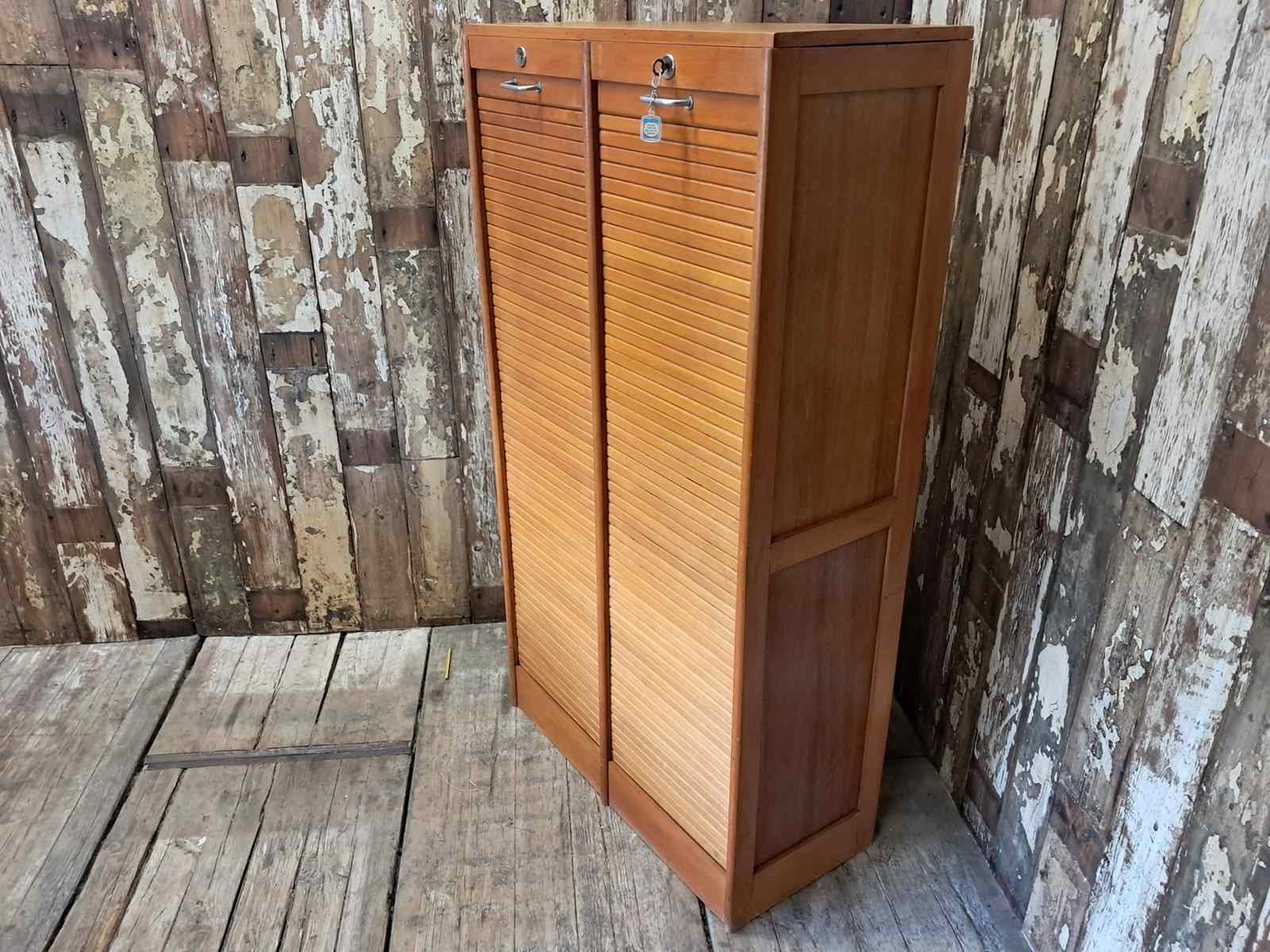 It has original working turn and drop locks and both doors work extremely well – a super storage piece for office or clothes or linens.