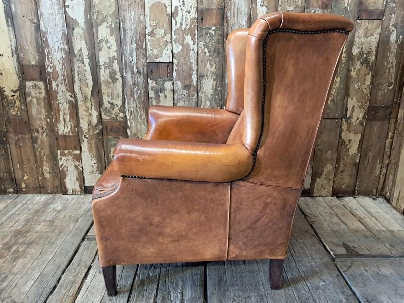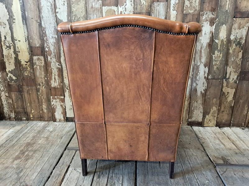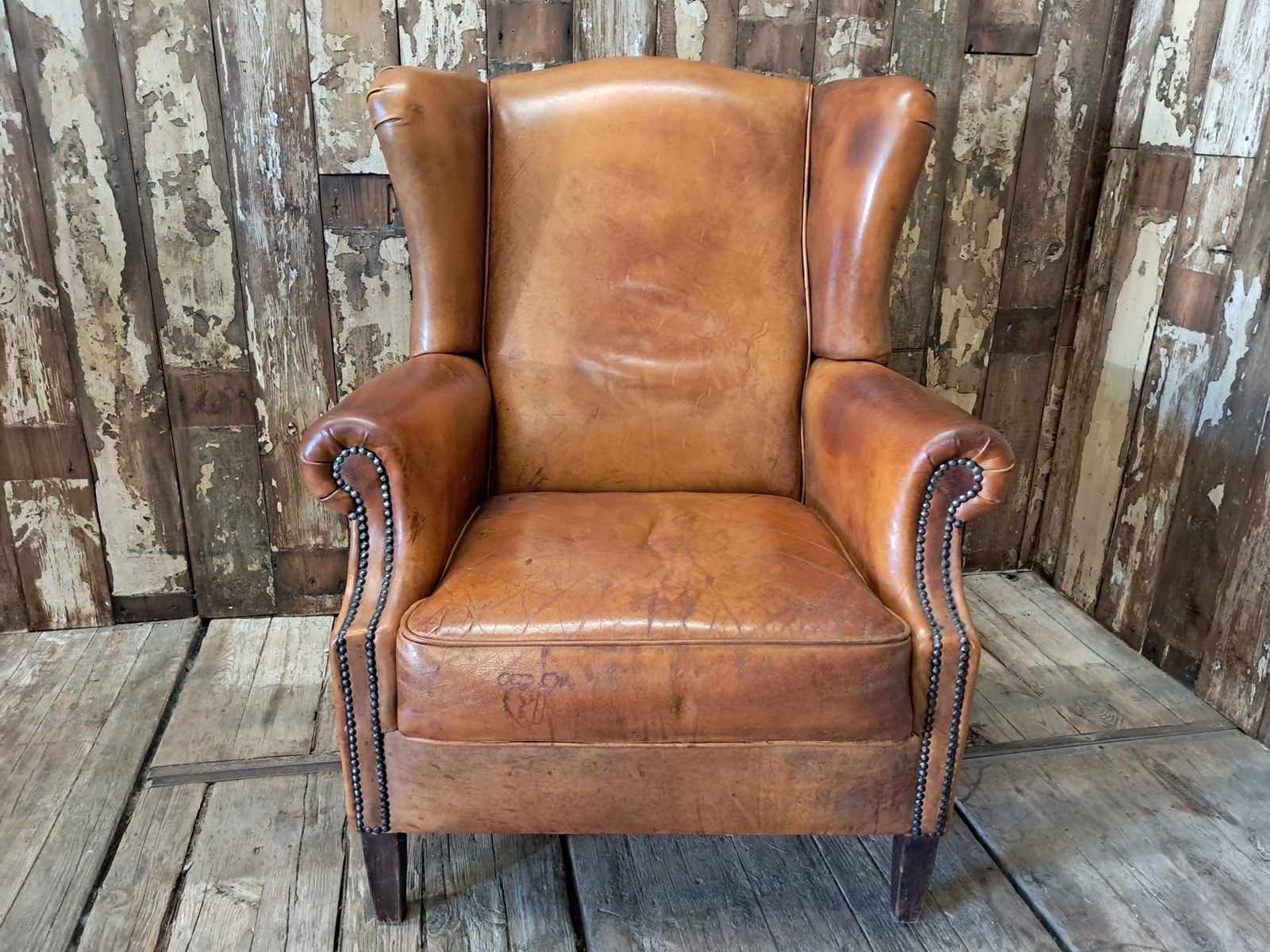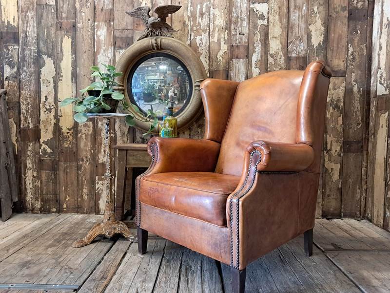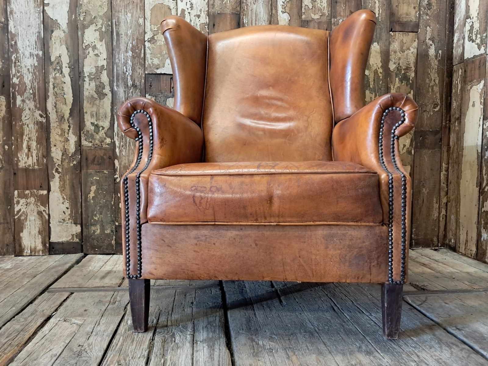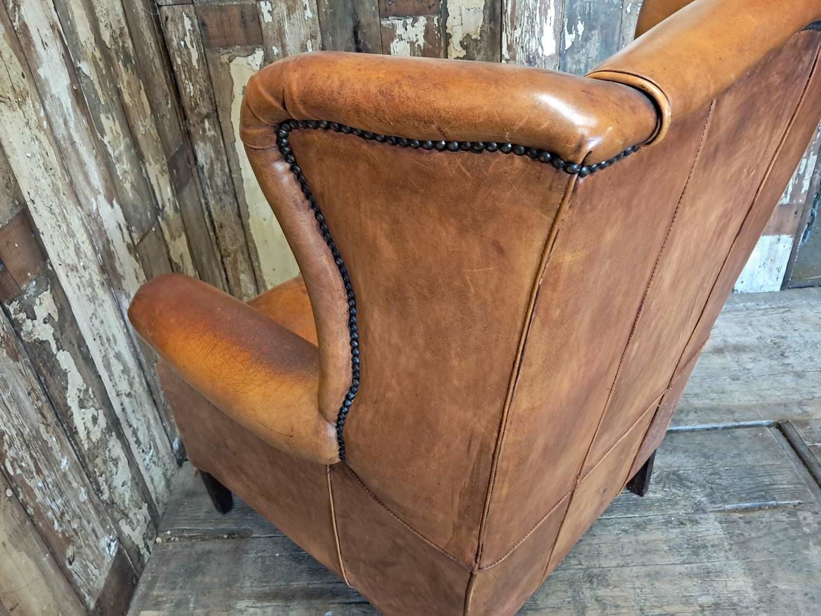 A stunning Dutch lambs leather wing back armchair in rich, hand-dyed tobacco leather.