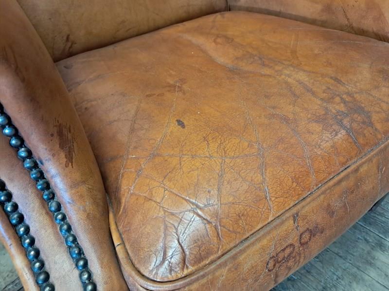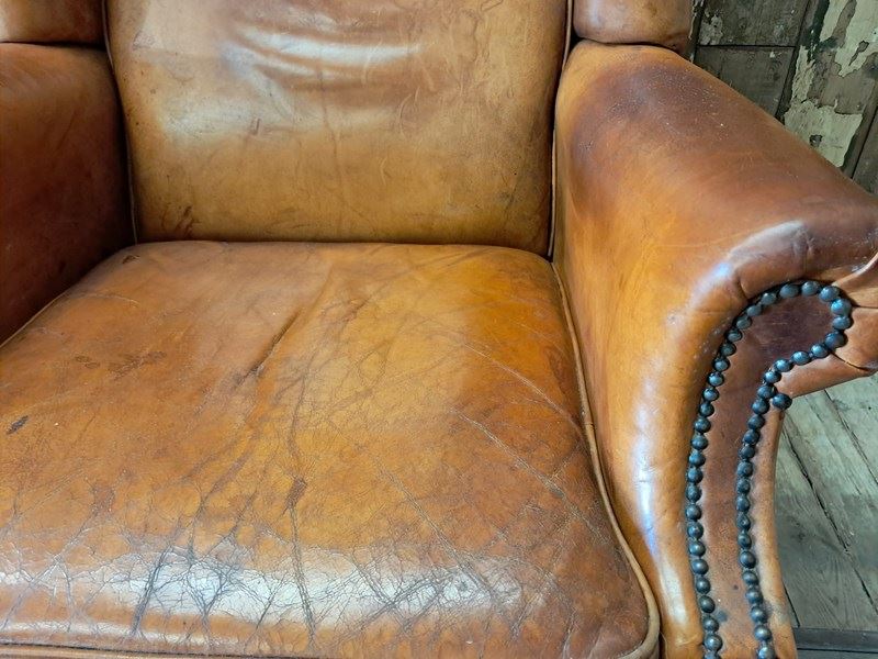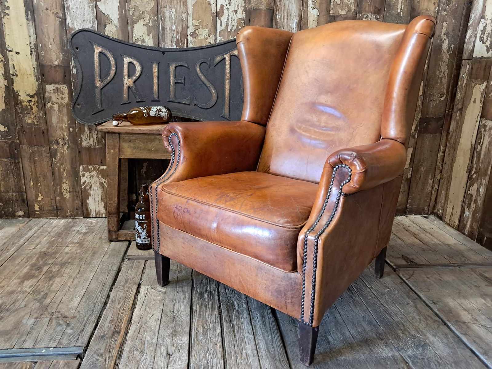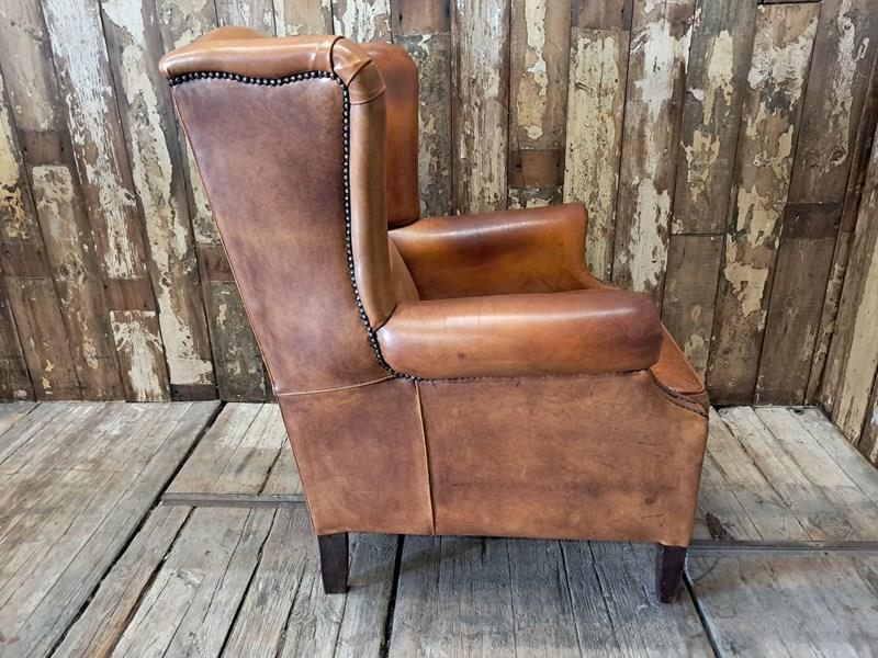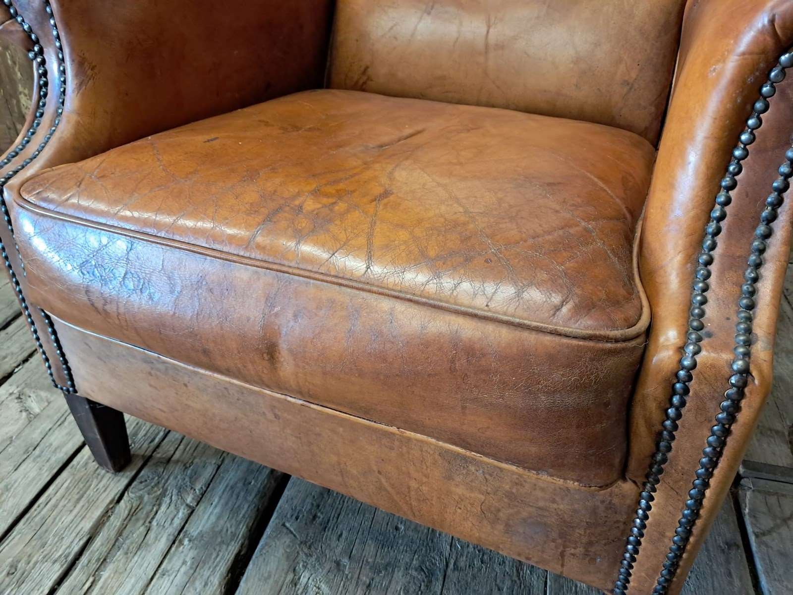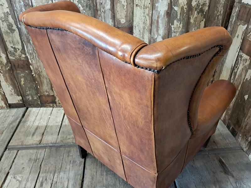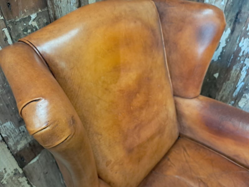 A stunning Dutch lambs leather wing back armchair in rich, hand-dyed tobacco leather.