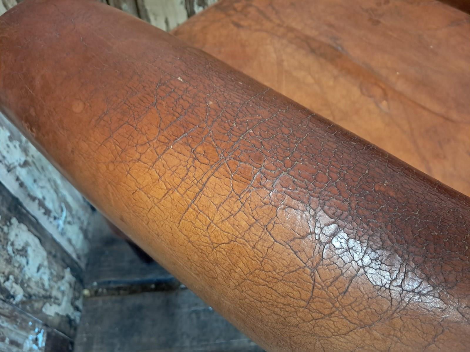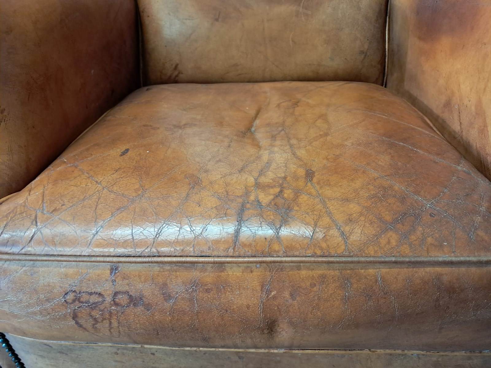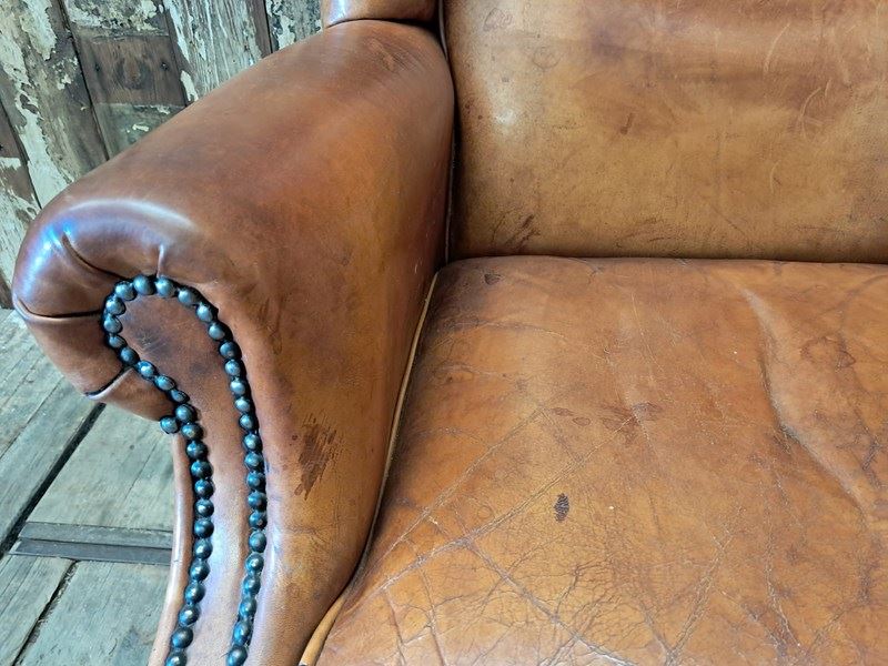 Immaculate stud work to the scroll arms and sides of the lugs and backrest, sprung beech frame, and perfectly worn leather as expected with age make this classic gentleman’s chair a timeless piece.