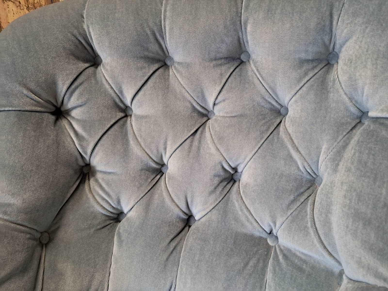 The chair is horse hair filled and has been reupholstered in the 70’s with a dusty blue velvet fabric that enhances the style of the chair while giving it a modern edge.