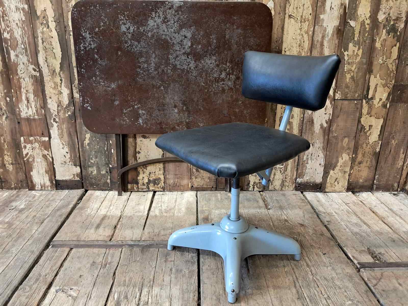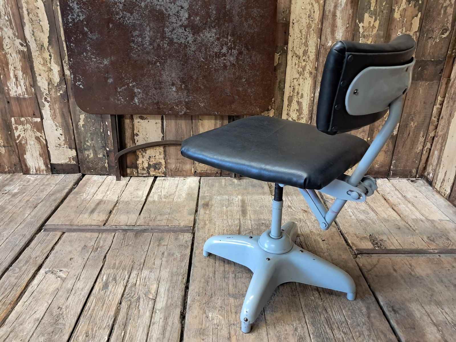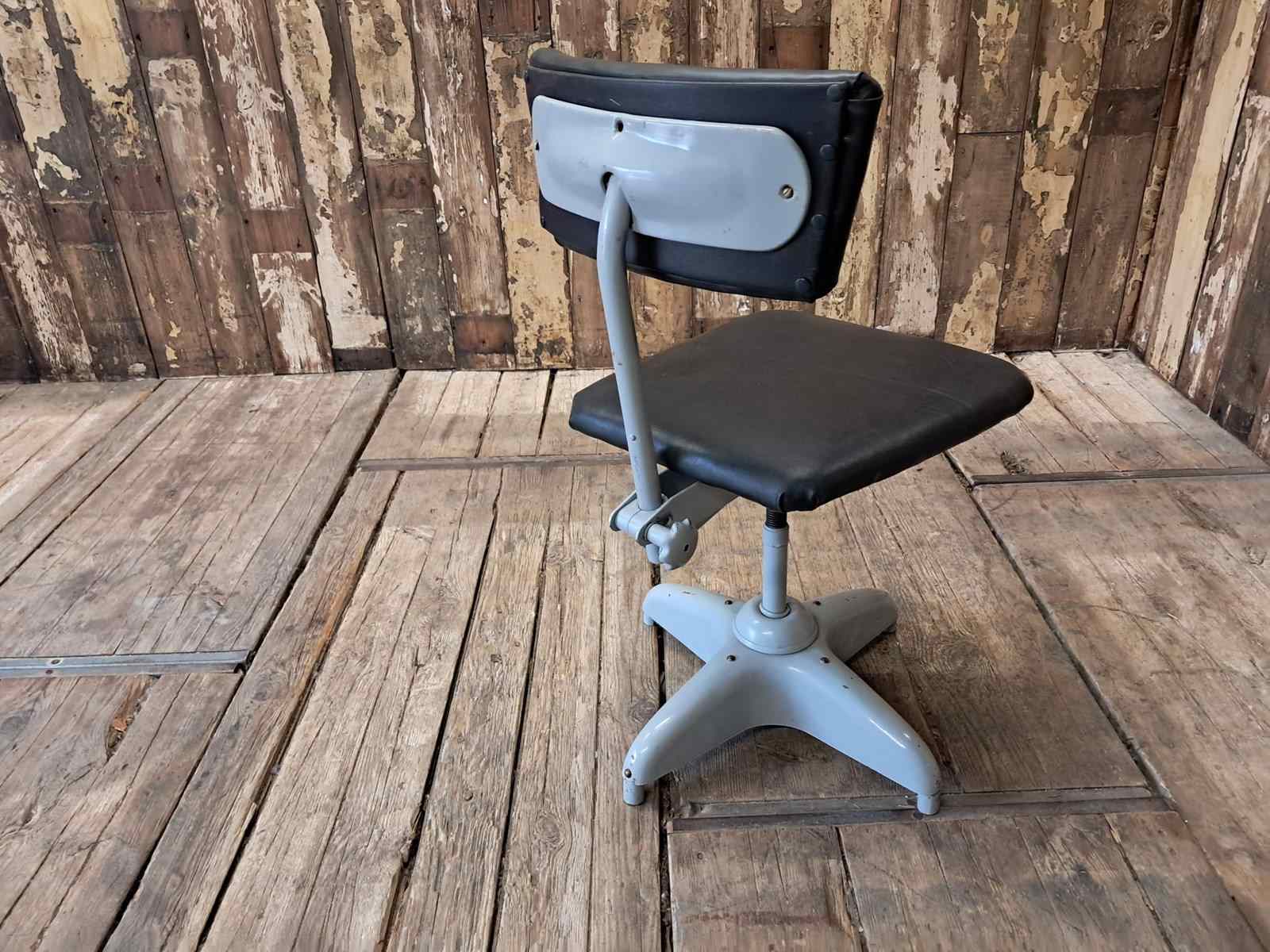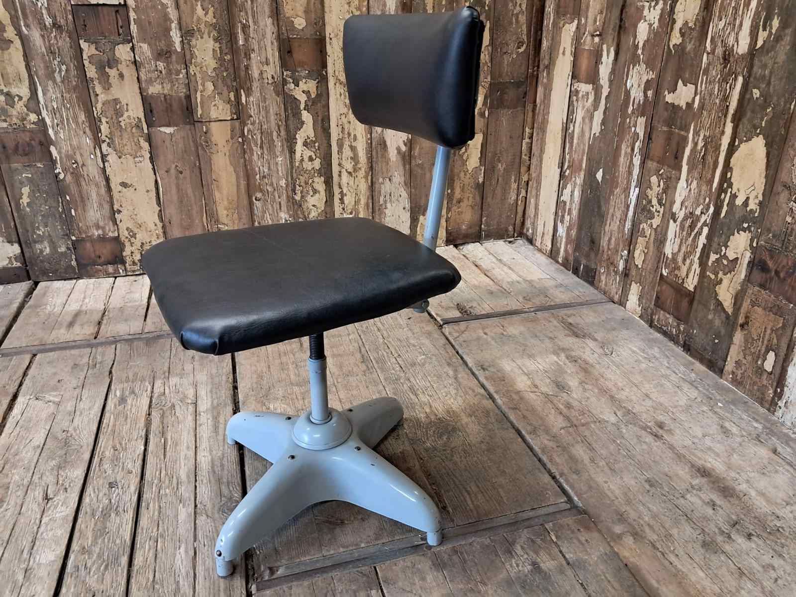 A mid century factory chair with steel frame and legs in mid grey and black vinyl seat pad and back rest.