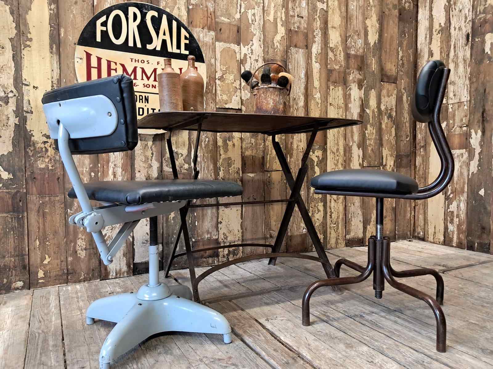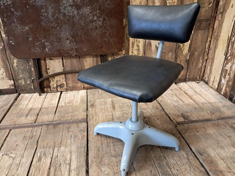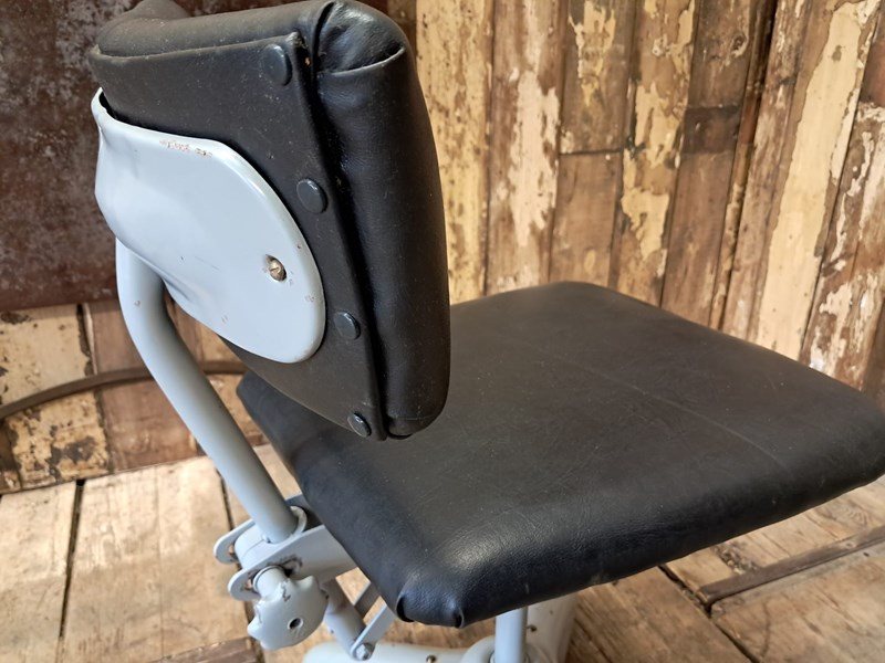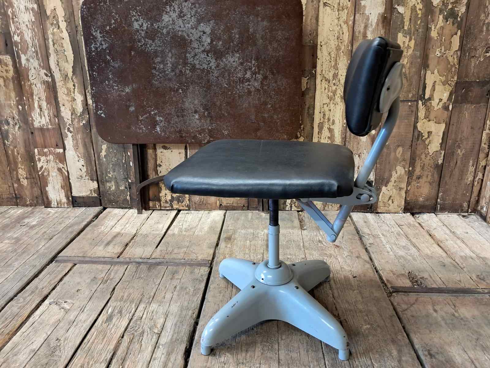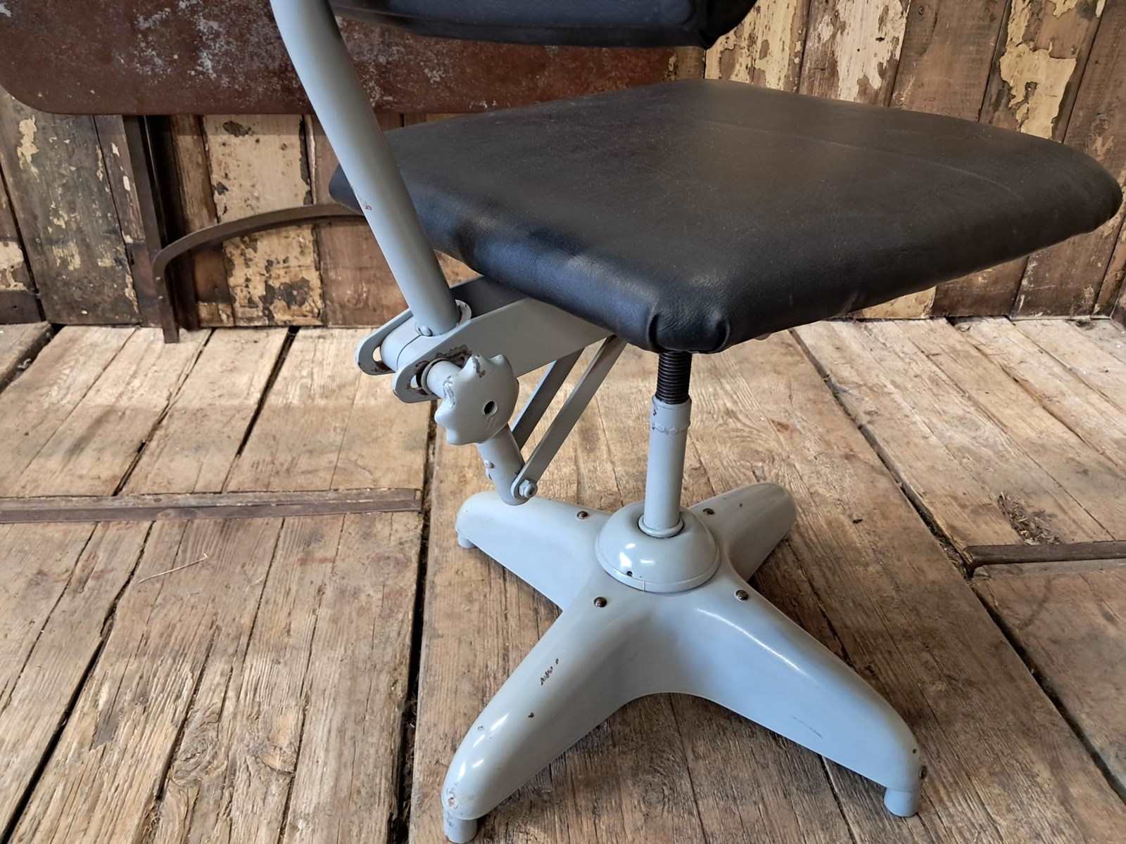 A mid century factory chair with steel frame and legs in mid grey and black vinyl seat pad and back rest.