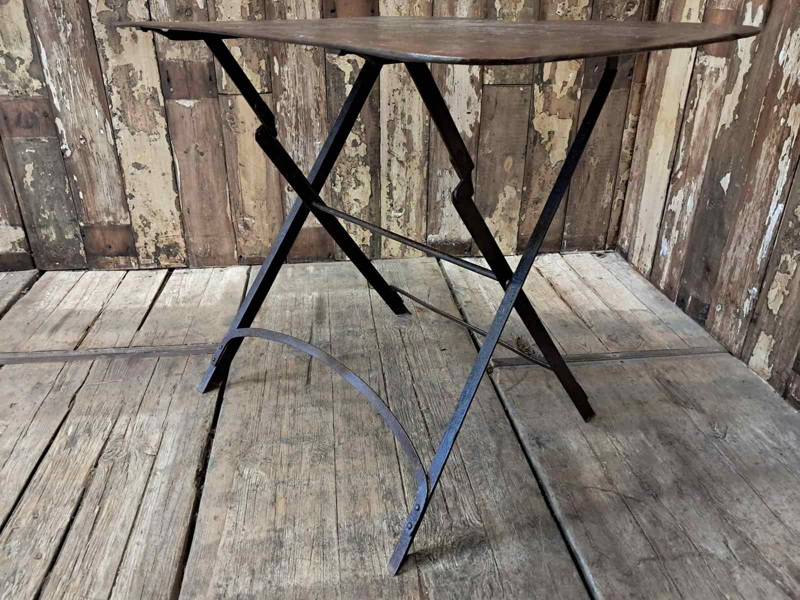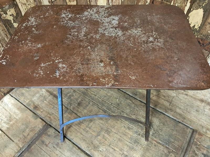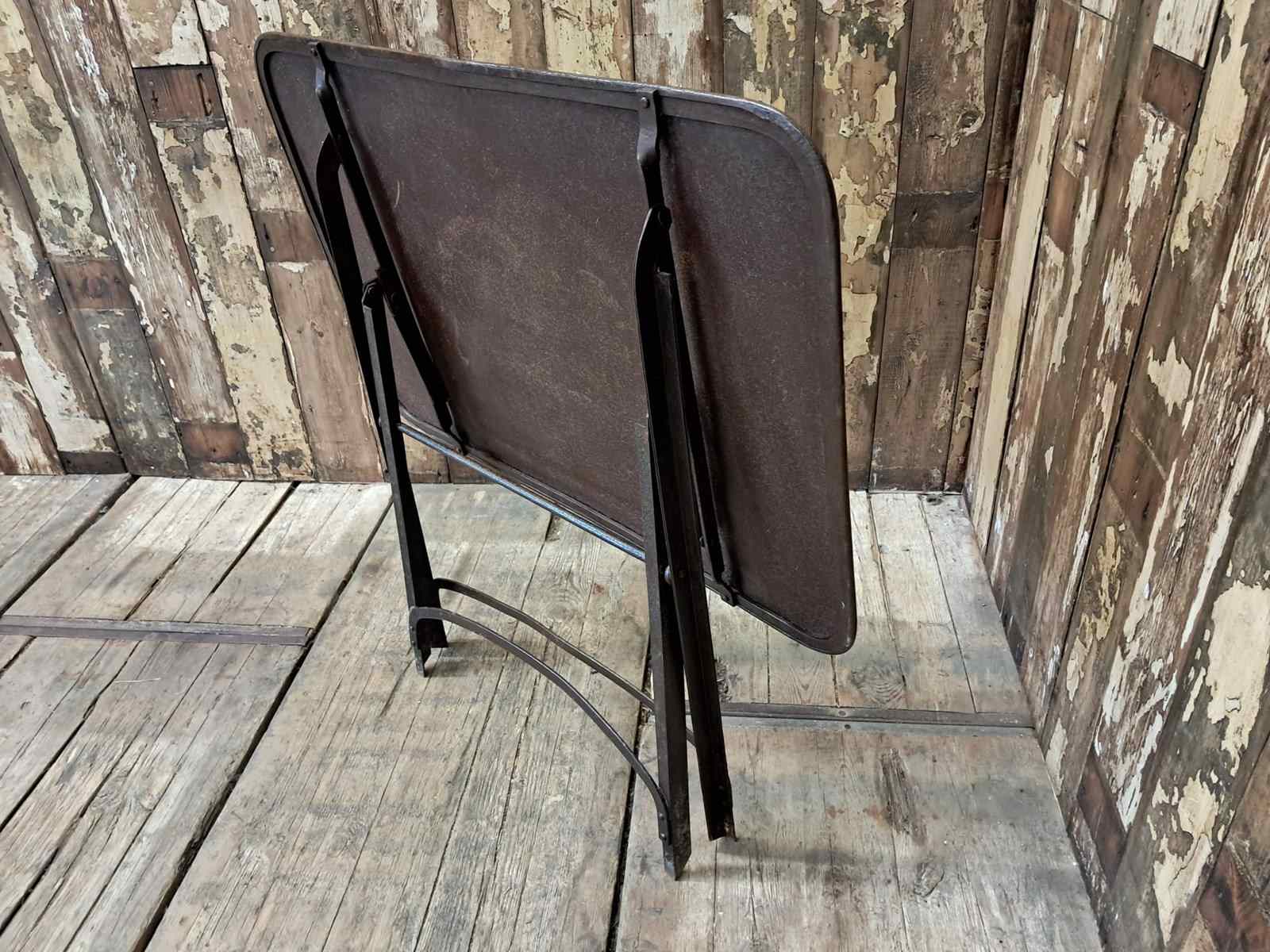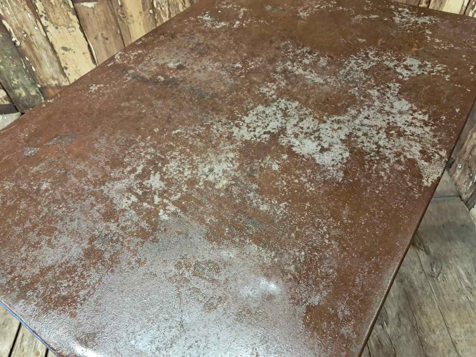 A lovely rectangular steel table in its natural rusty state that folds flat for easy storage.