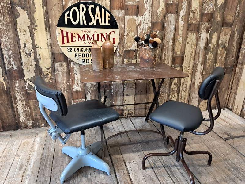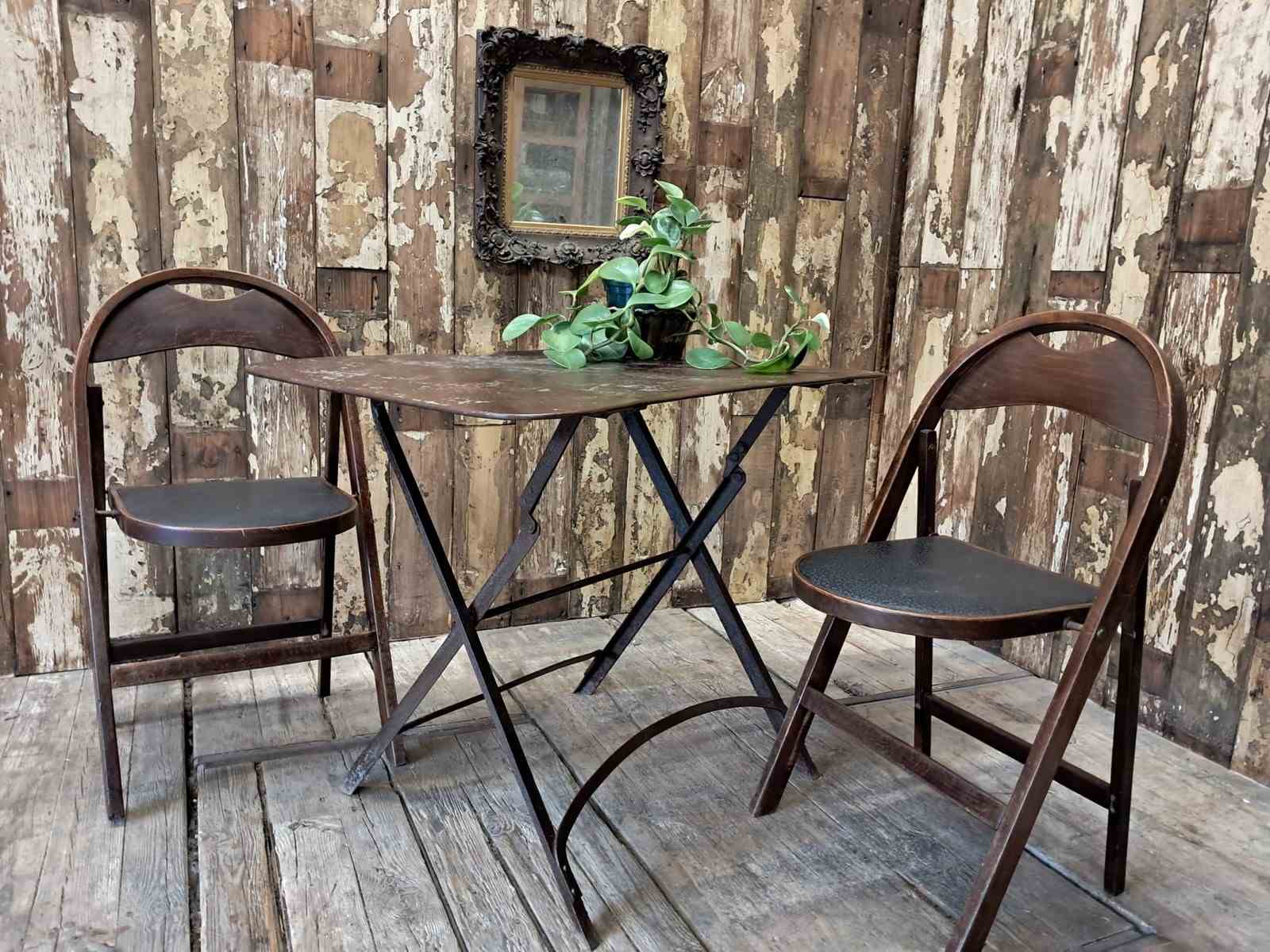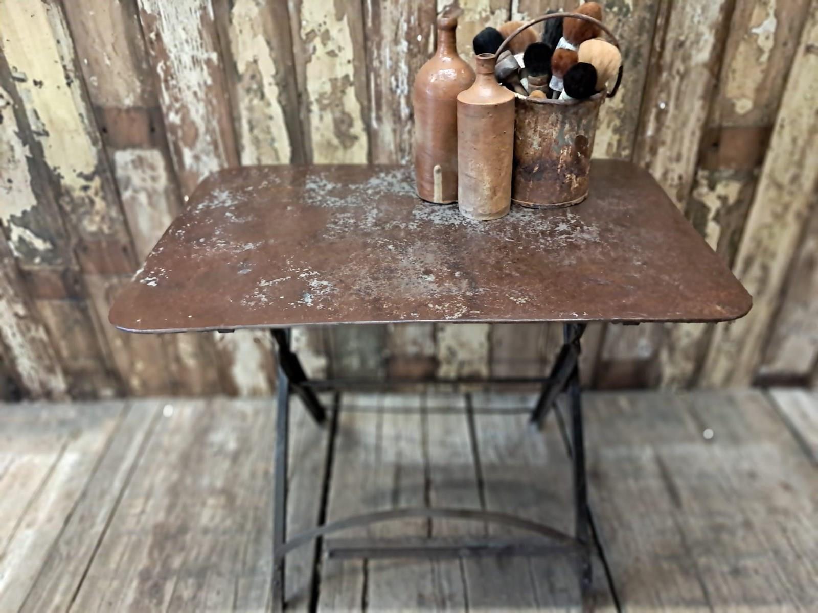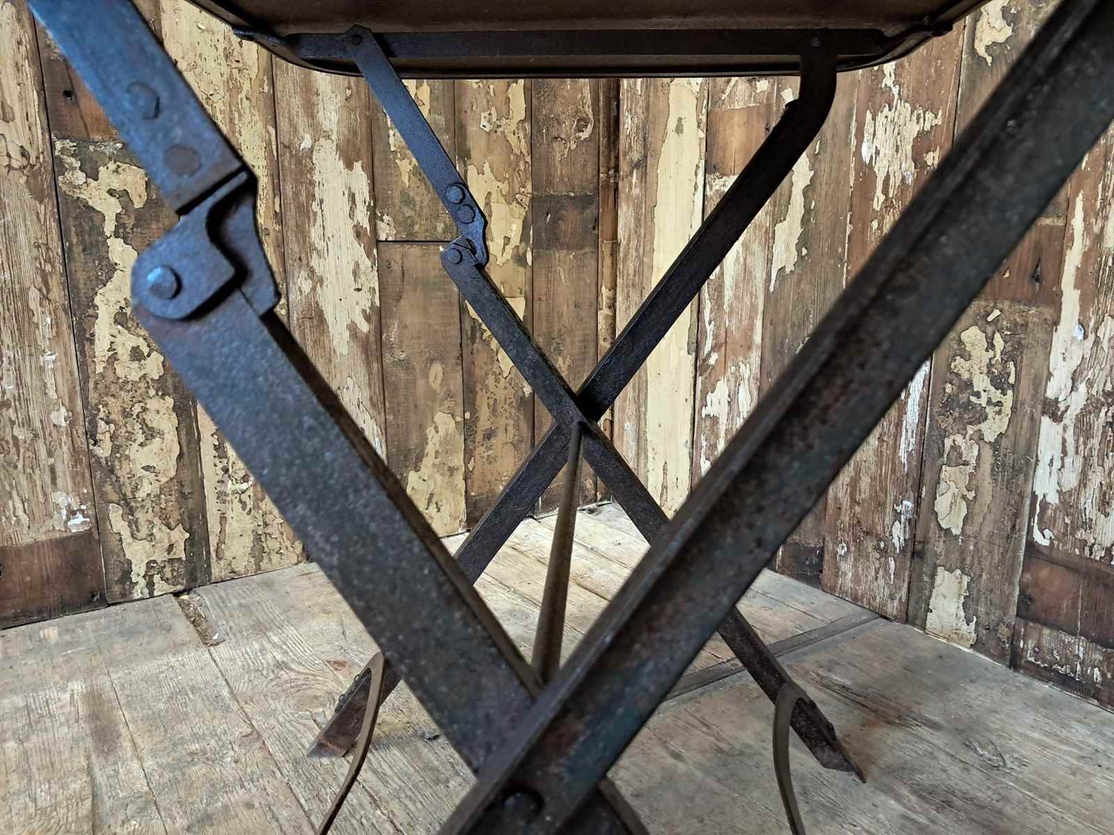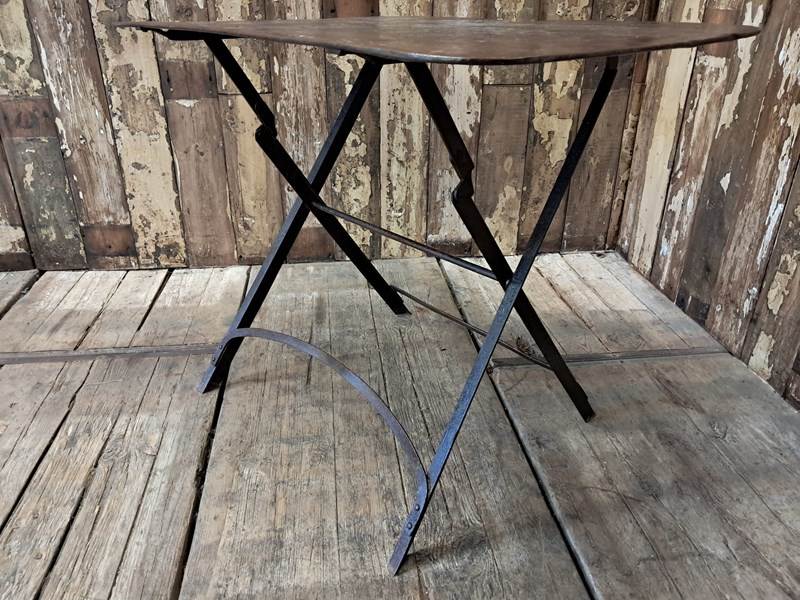 A lovely rectangular steel table in its natural rusty state that folds flat for easy storage.