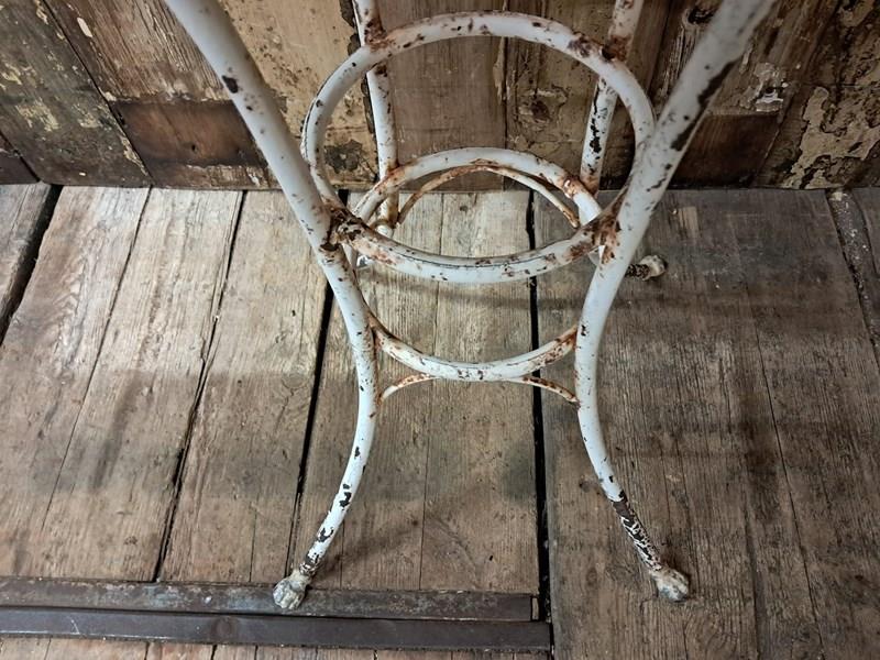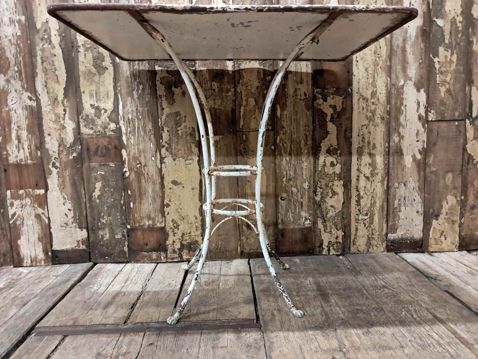 A French metal bistro table in white paint with lovely rusty patina to the top.